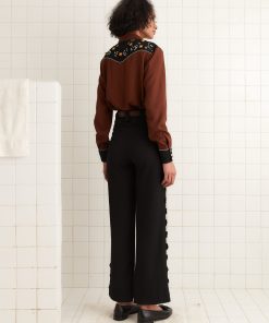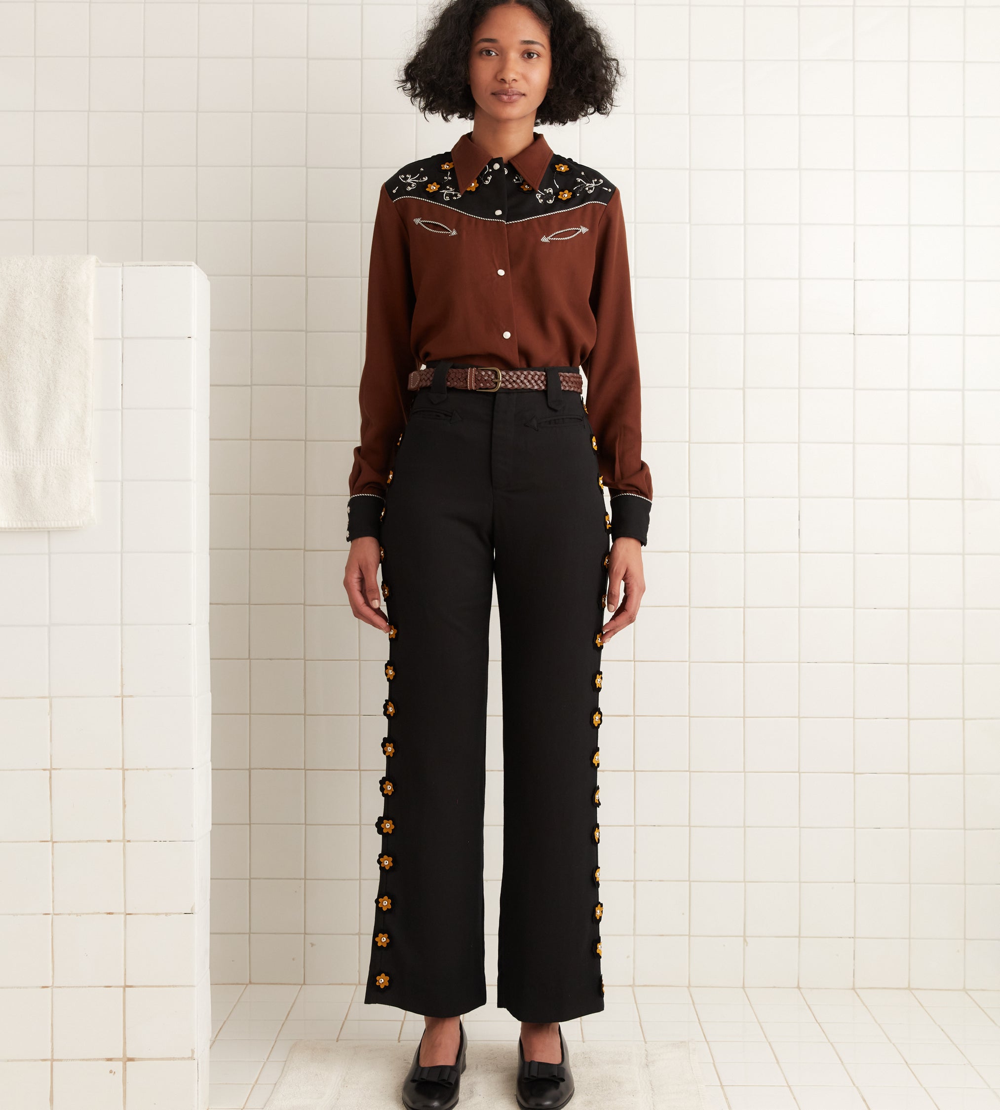 These trousers are inspired by a branded costume from a 1960s Western TV show. We reproduced the studded felt flowers down the side seams of these pants, which are made from lightweight wool twill and feature distinctive Western smile pockets.
