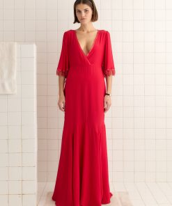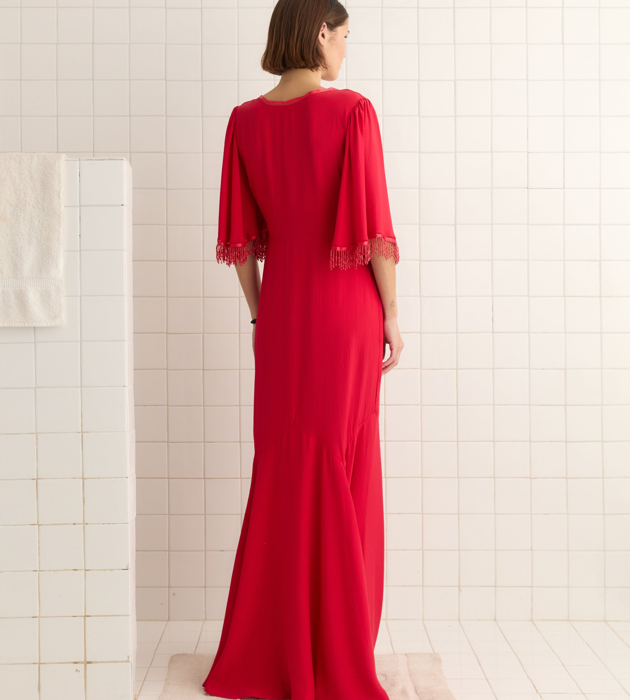 This dress is inspired by an afternoon dress from the 1930s with a distinctive godet skirt. We reproduced the silhouette in textured crepe with ribbonwork and beading around the collar and sleeves.
