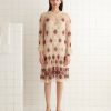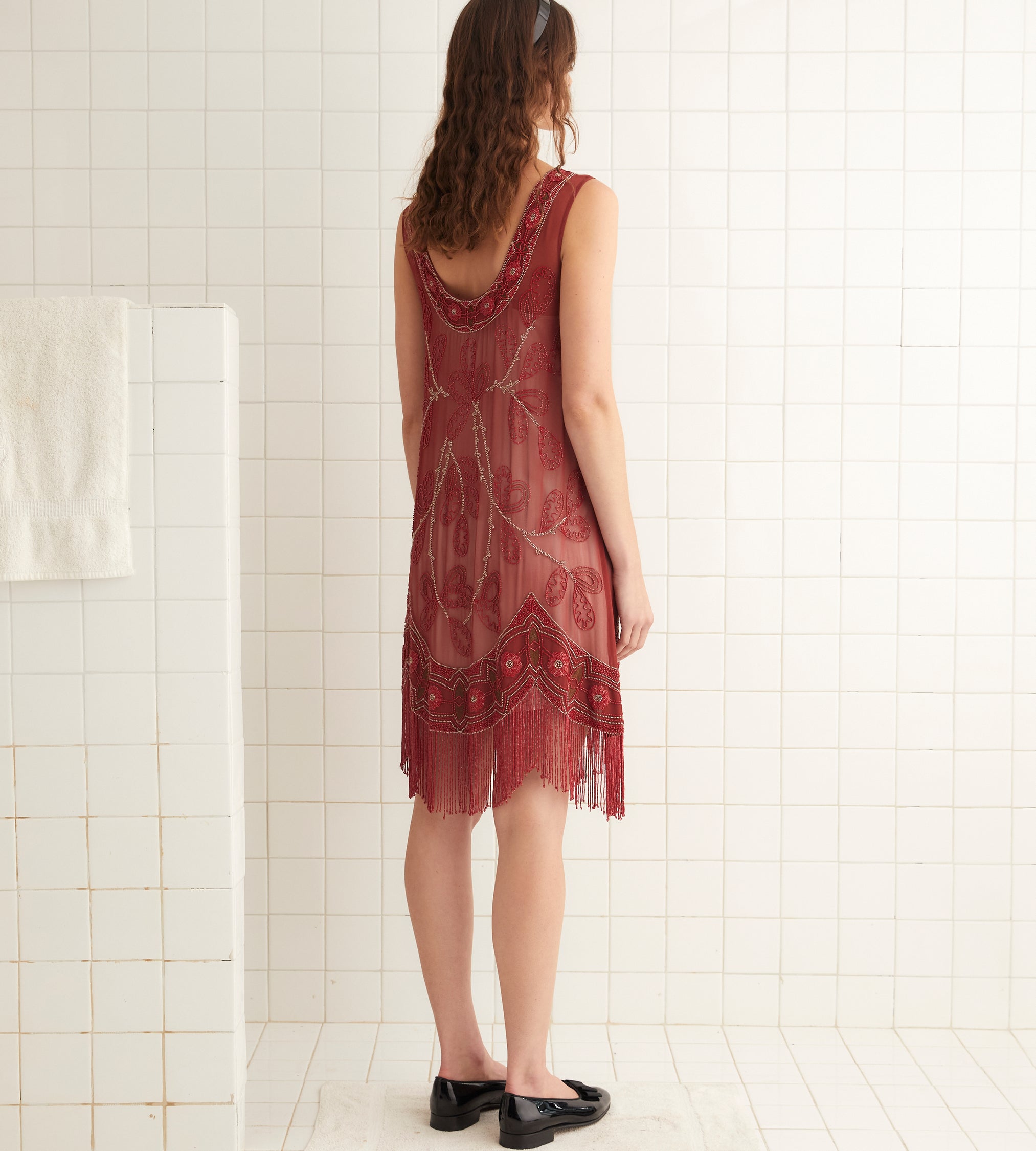 This style is a reproduction of a dress from the 1920s. It features red and silver beading with bronze bullion embroidery accents and has a fringed, scalloped hem. All beadwork was done by hand.