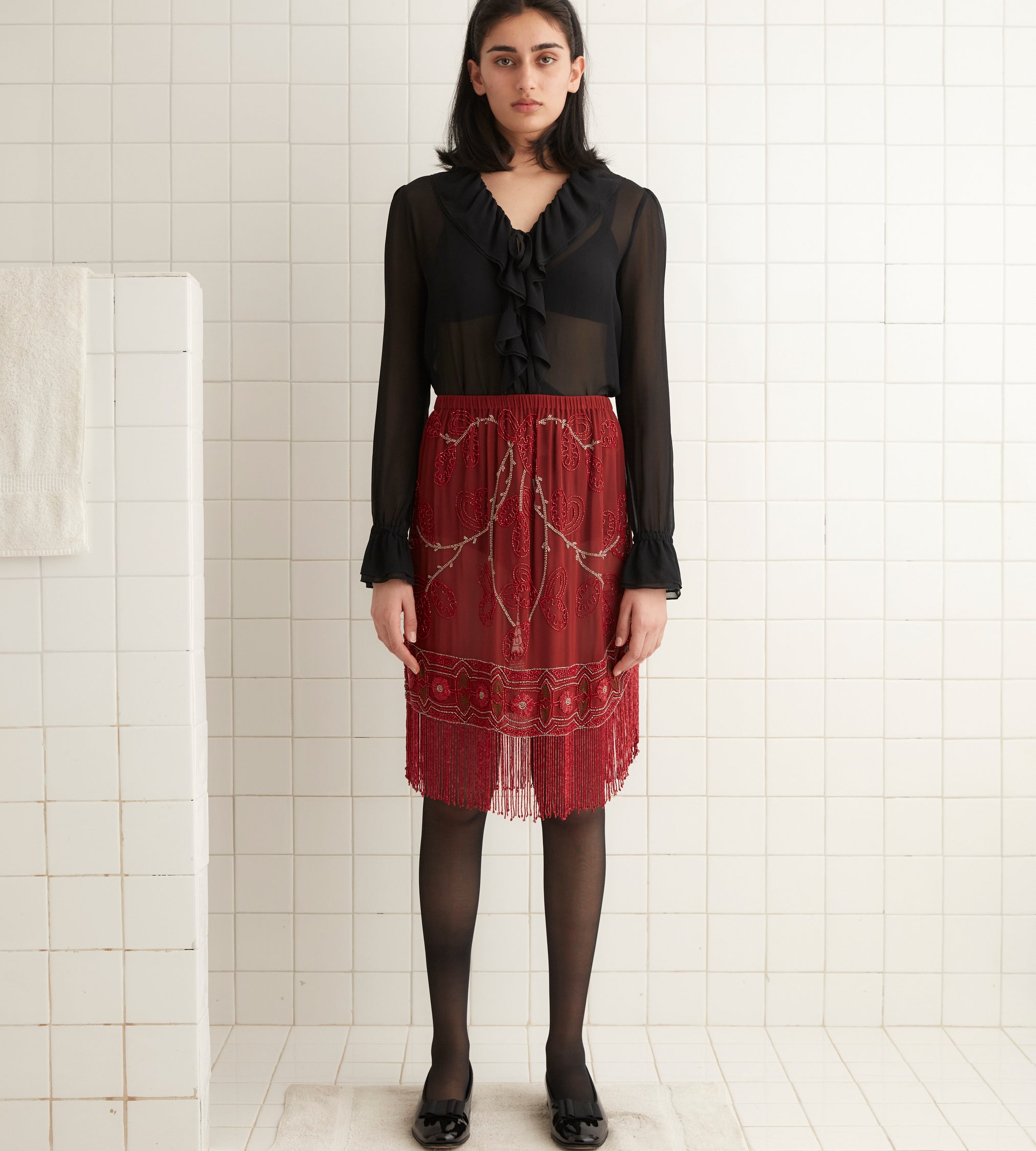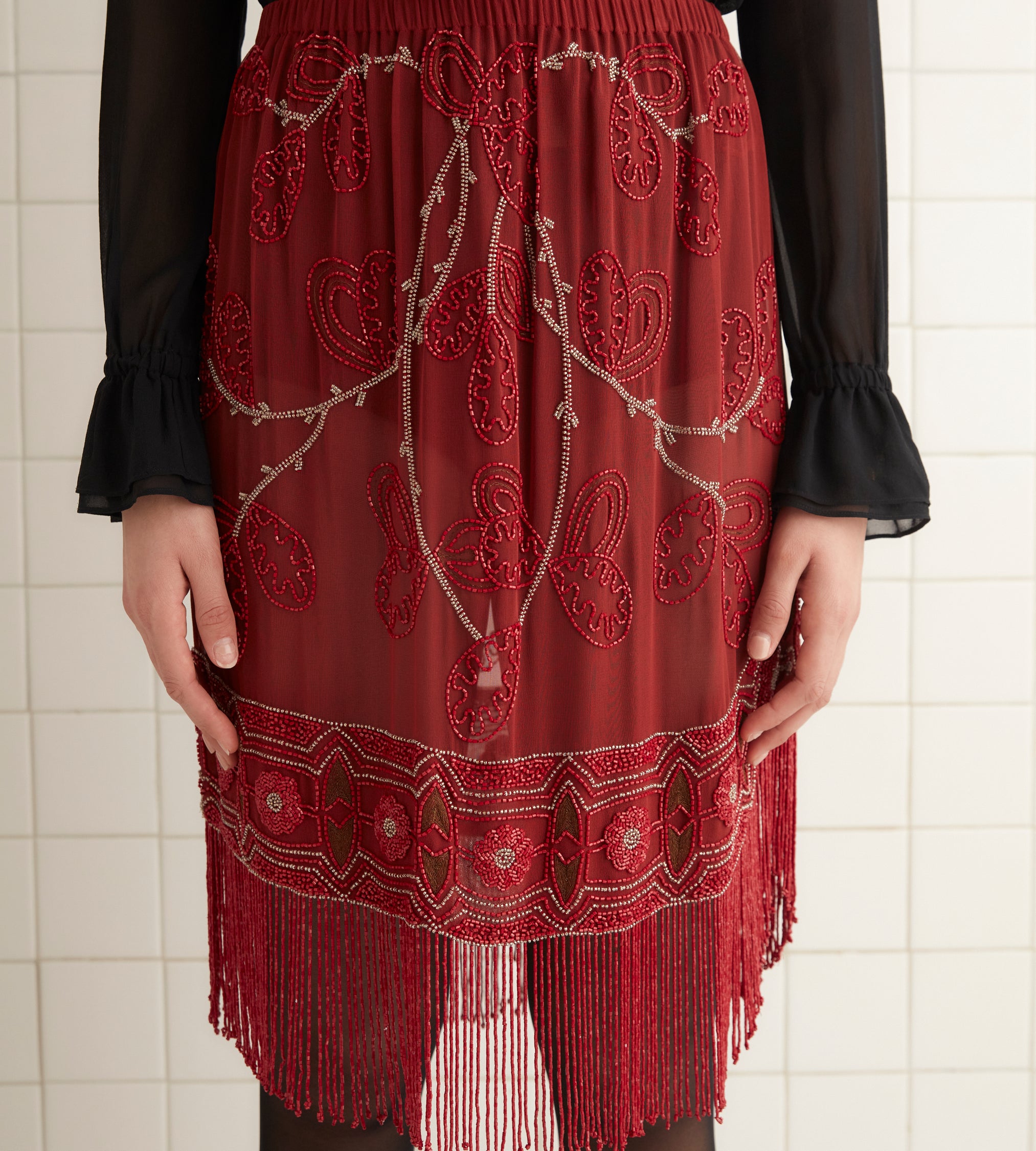 This skirt is inspired by a dress from the 1920s. We reproduced the beadwork and fringe for this style, which has an asymmetrical scalloped hem. All beadwork was done by hand.