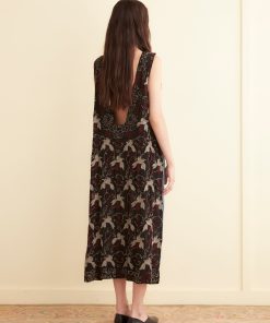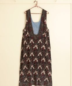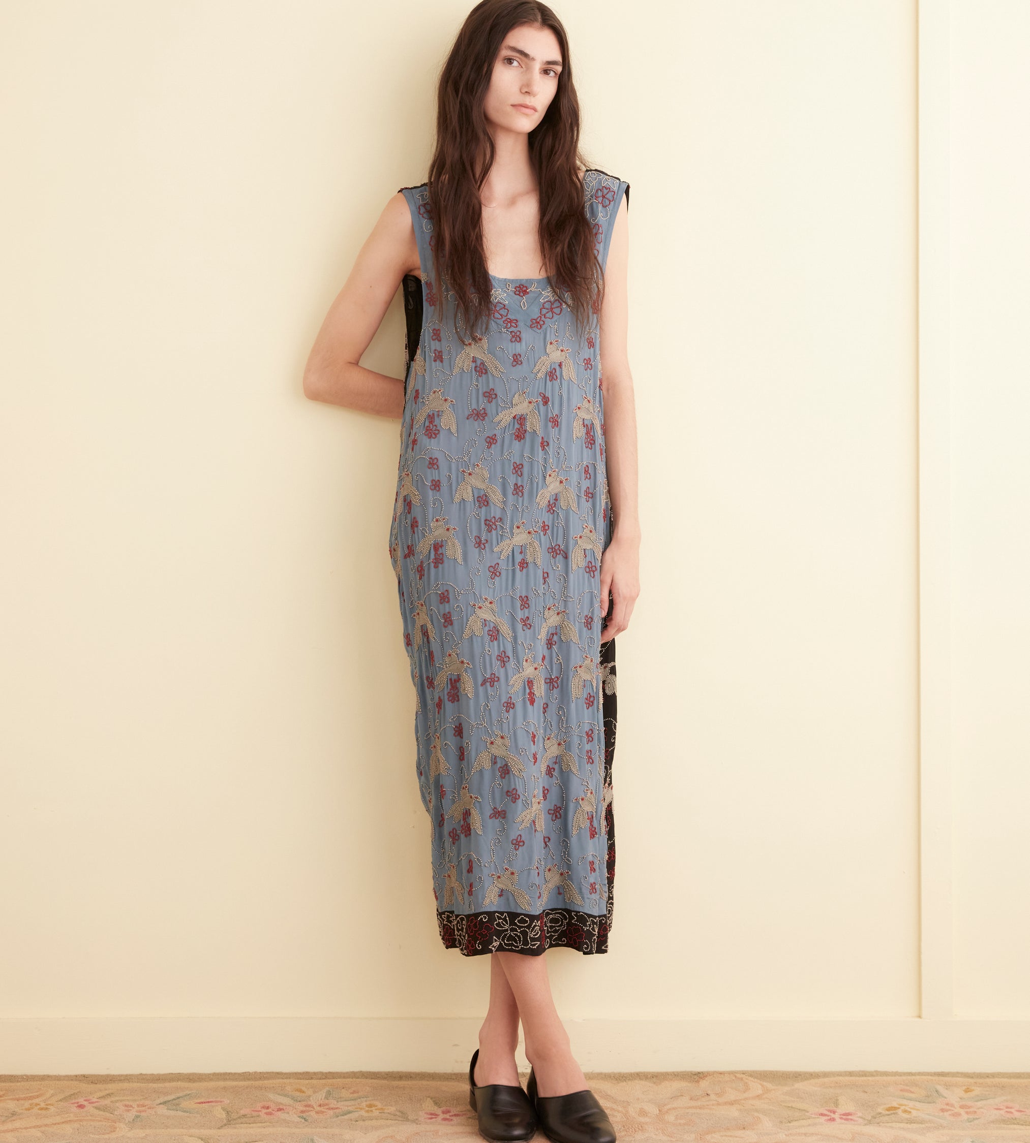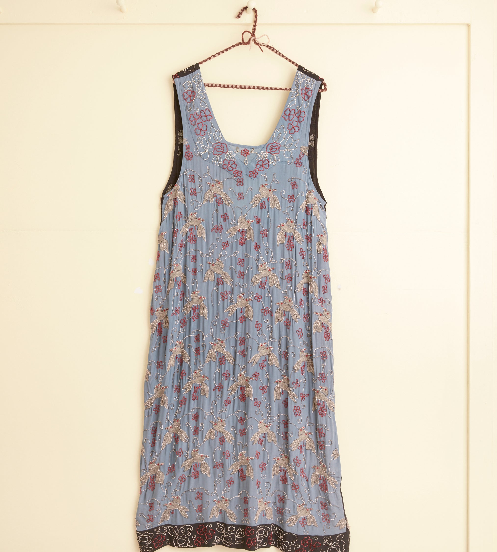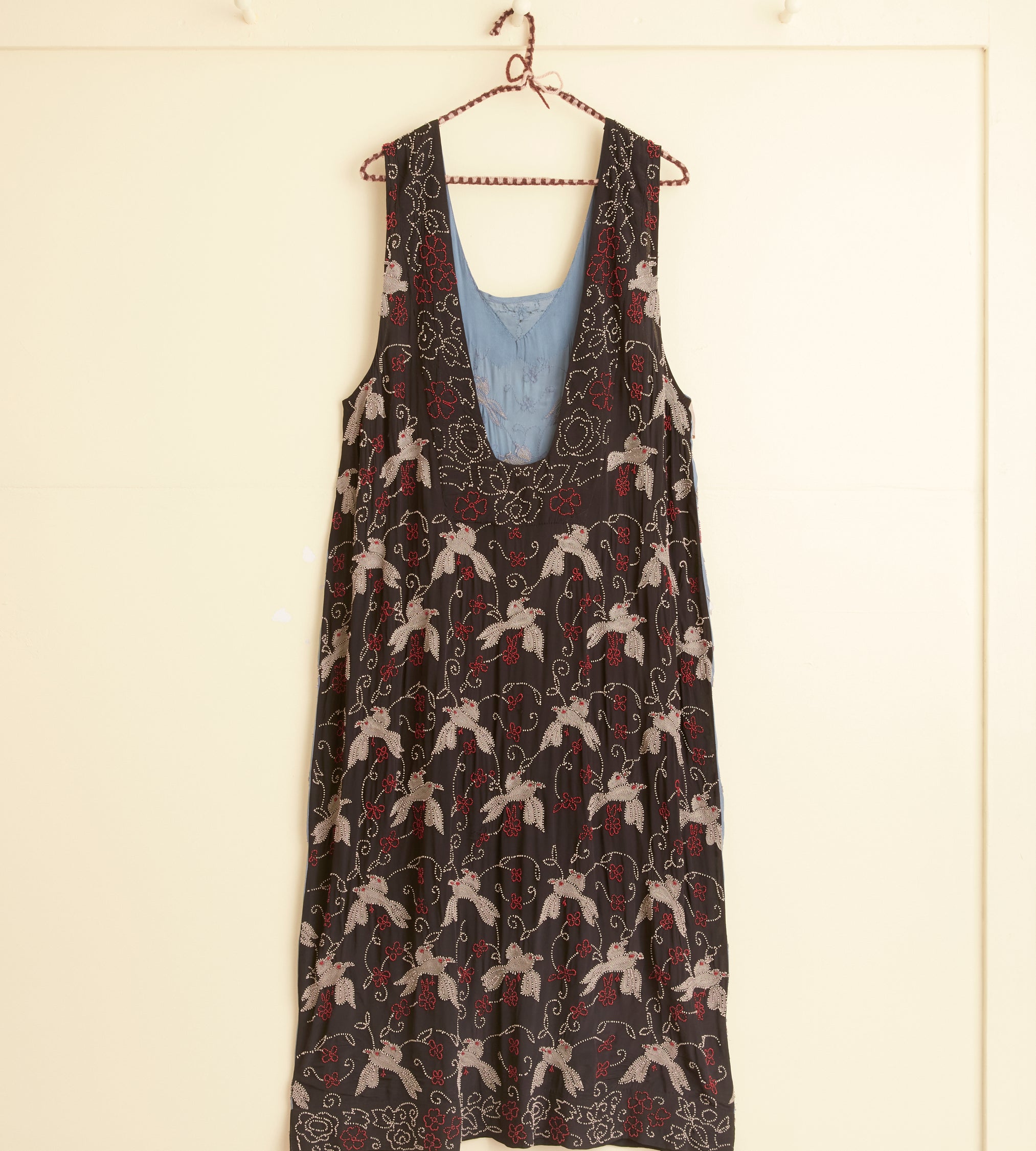 This style is inspired by a dress from 1925 which was embellished with red and white birds and flowers. We reproduced the embroidery and beadwork on this two-toned dress, which is reversible and can be worn with either a low back or a plunging neckline. All beading is worked by hand.