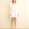 This dress is inspired by a bed jacket from the 1890s. We reproduced the broderie anglaise lacework for this style, which has a wrap silhouette that closes with antique pearl buttons.