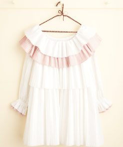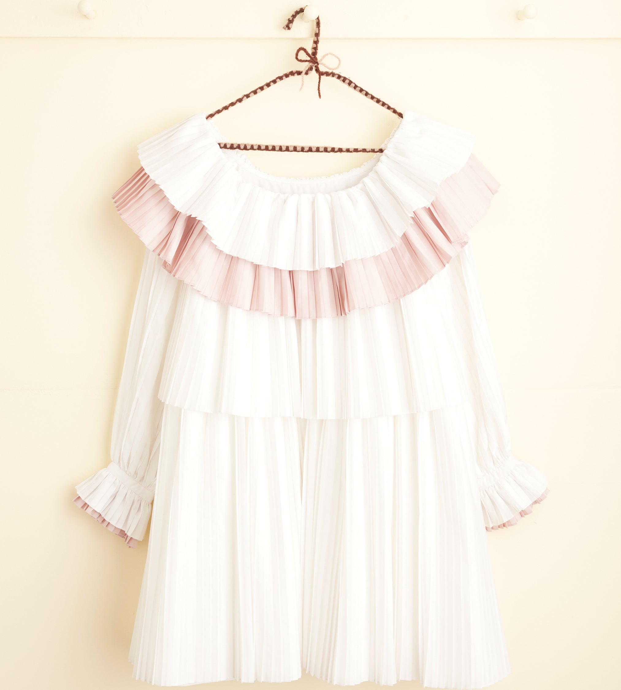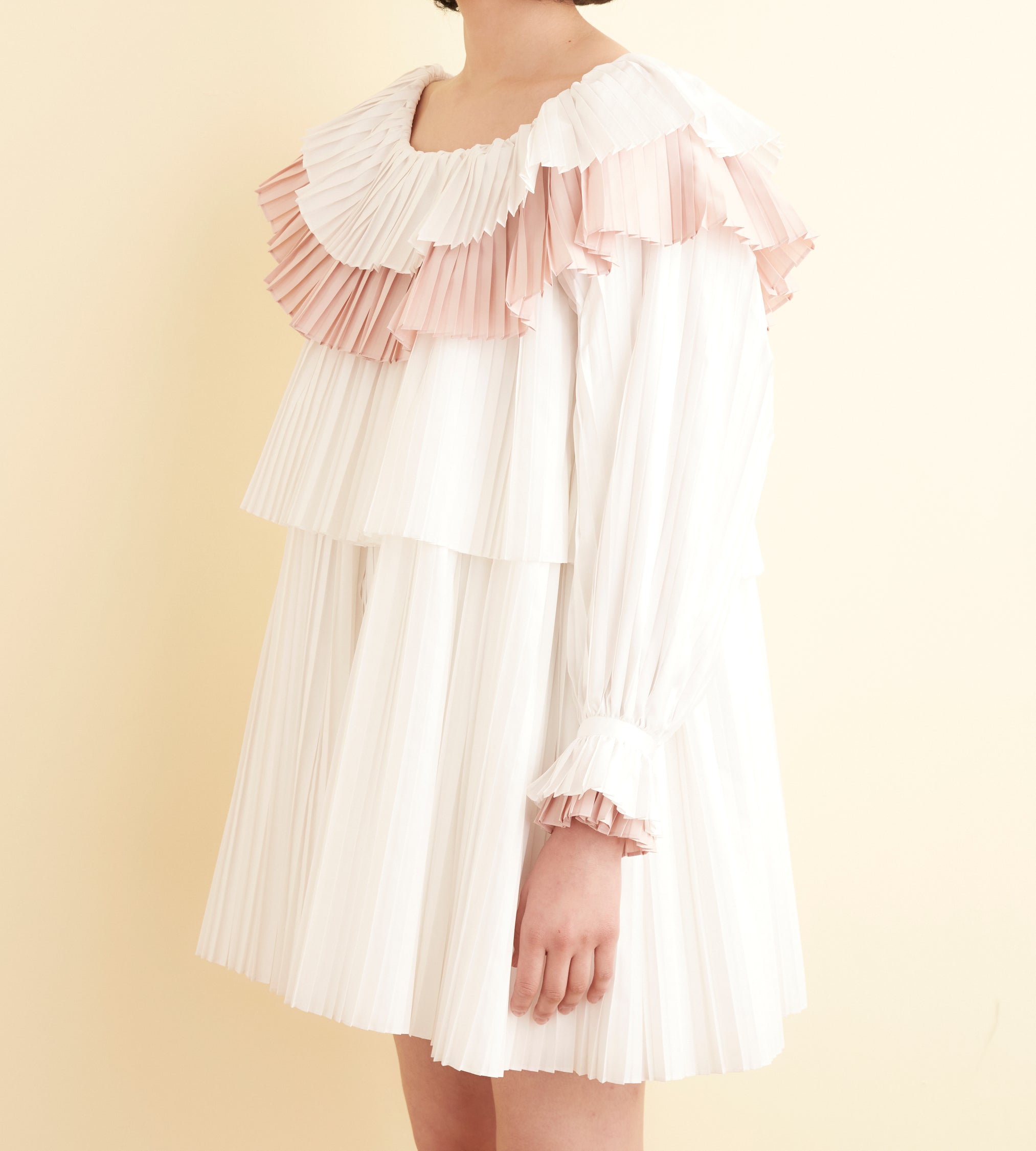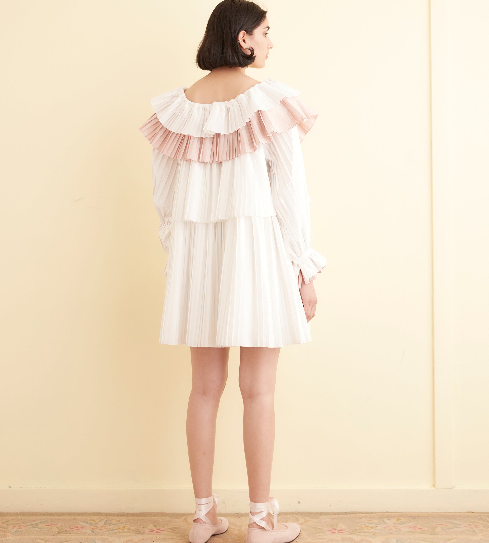 The Brunch Dress is inspired by a dress from the 1970s, purchased outside of Paris. It features cascading tiers of pleats, a wide ruff collar, and delicately cinched cuffs.