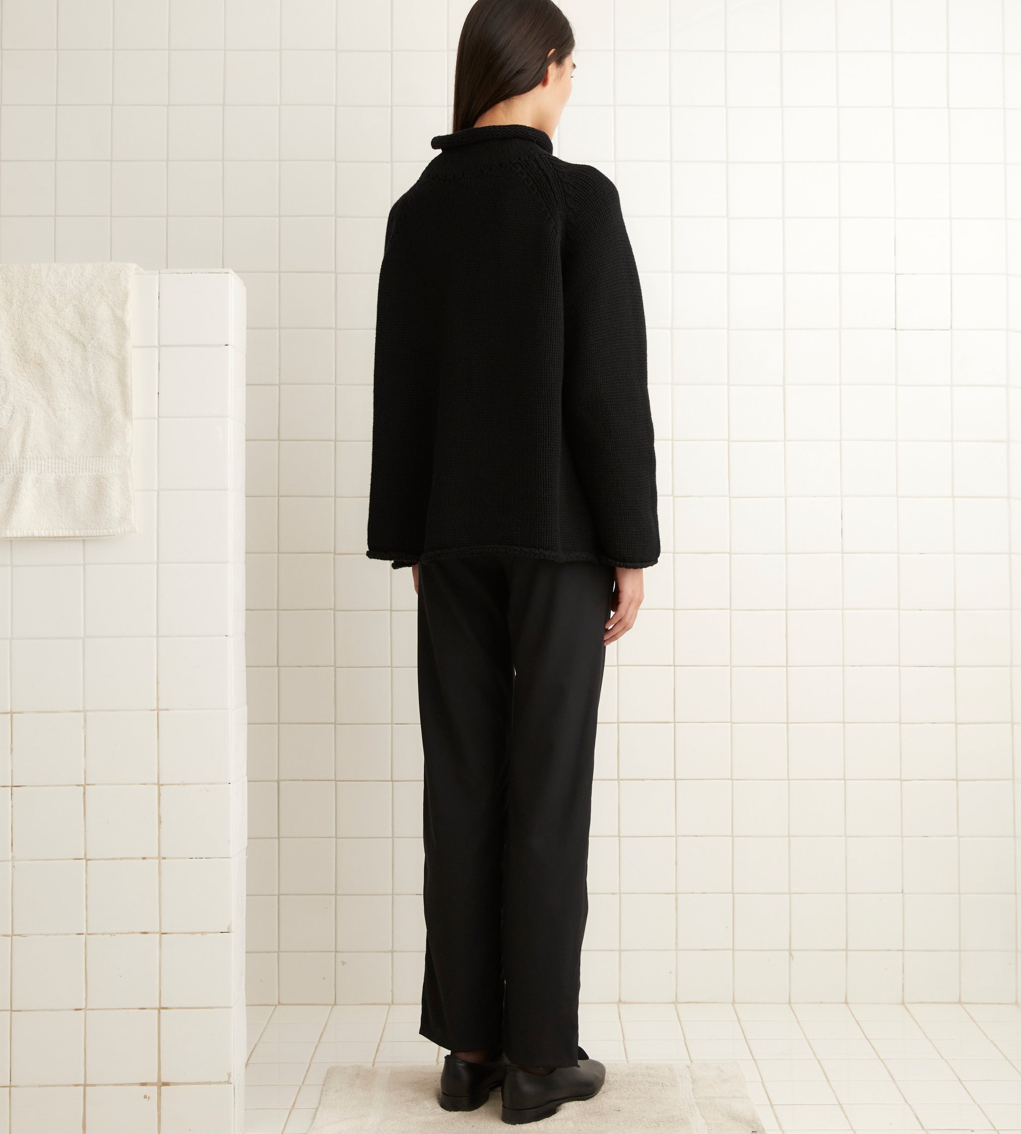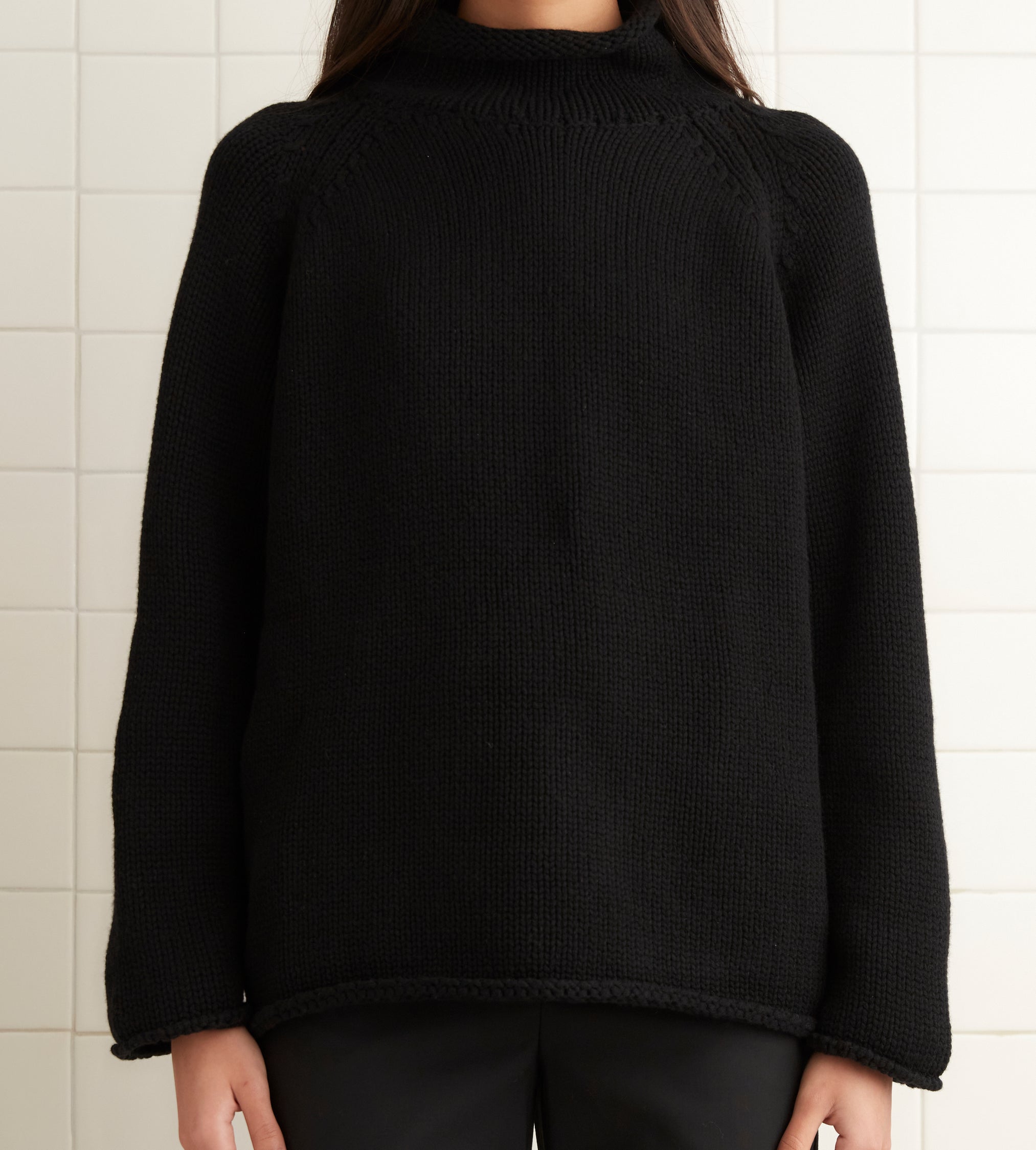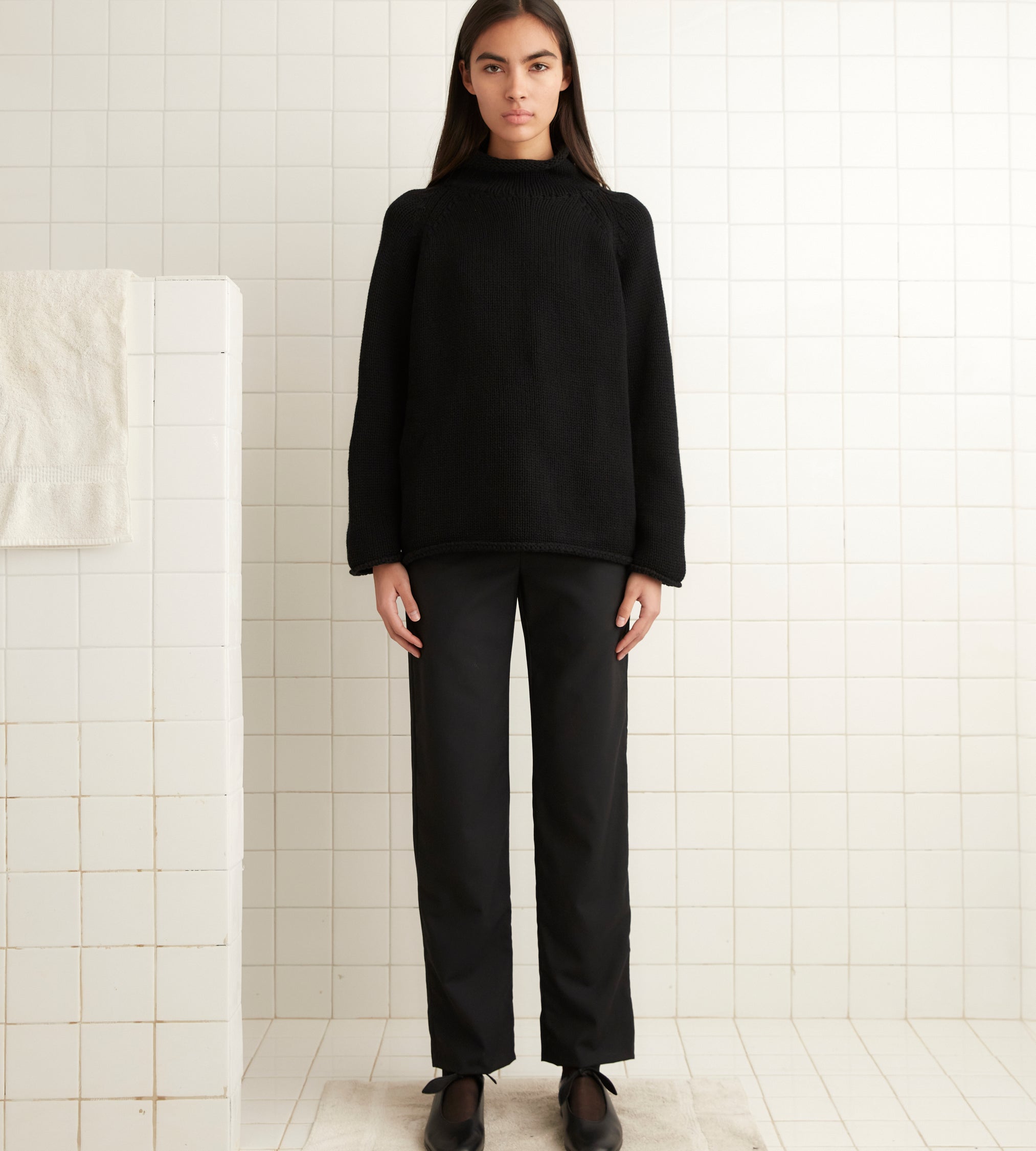 This rollneck sweater is inspired by a teenager’s sweater from the 1960s. We reproduced the silhouette in a thick cashmere yarn.