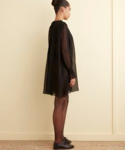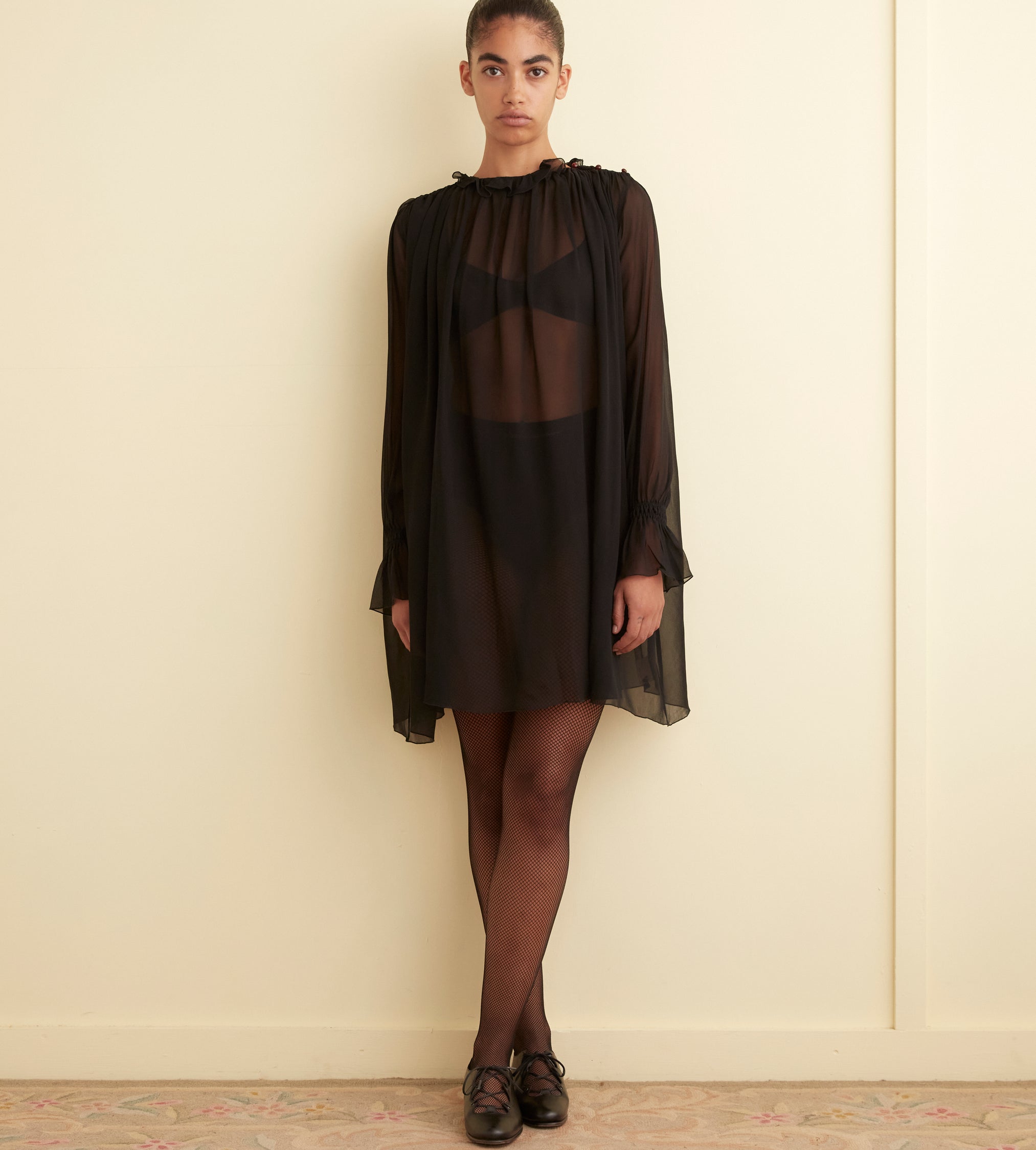 This style is inspired by a dress from the 1920s. We have reproduced the original piece, with its gathered, unfitted silhouette. The neckline is trimmed with a ruffle detail and the sleeves with smocking.
