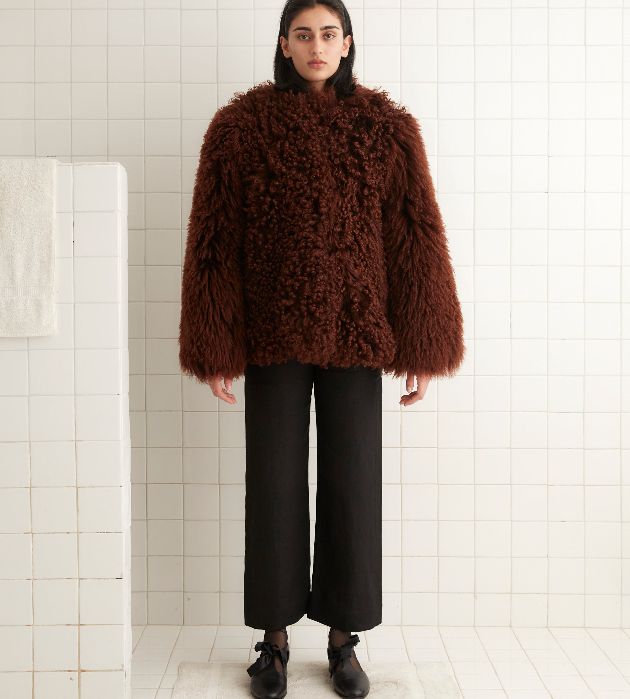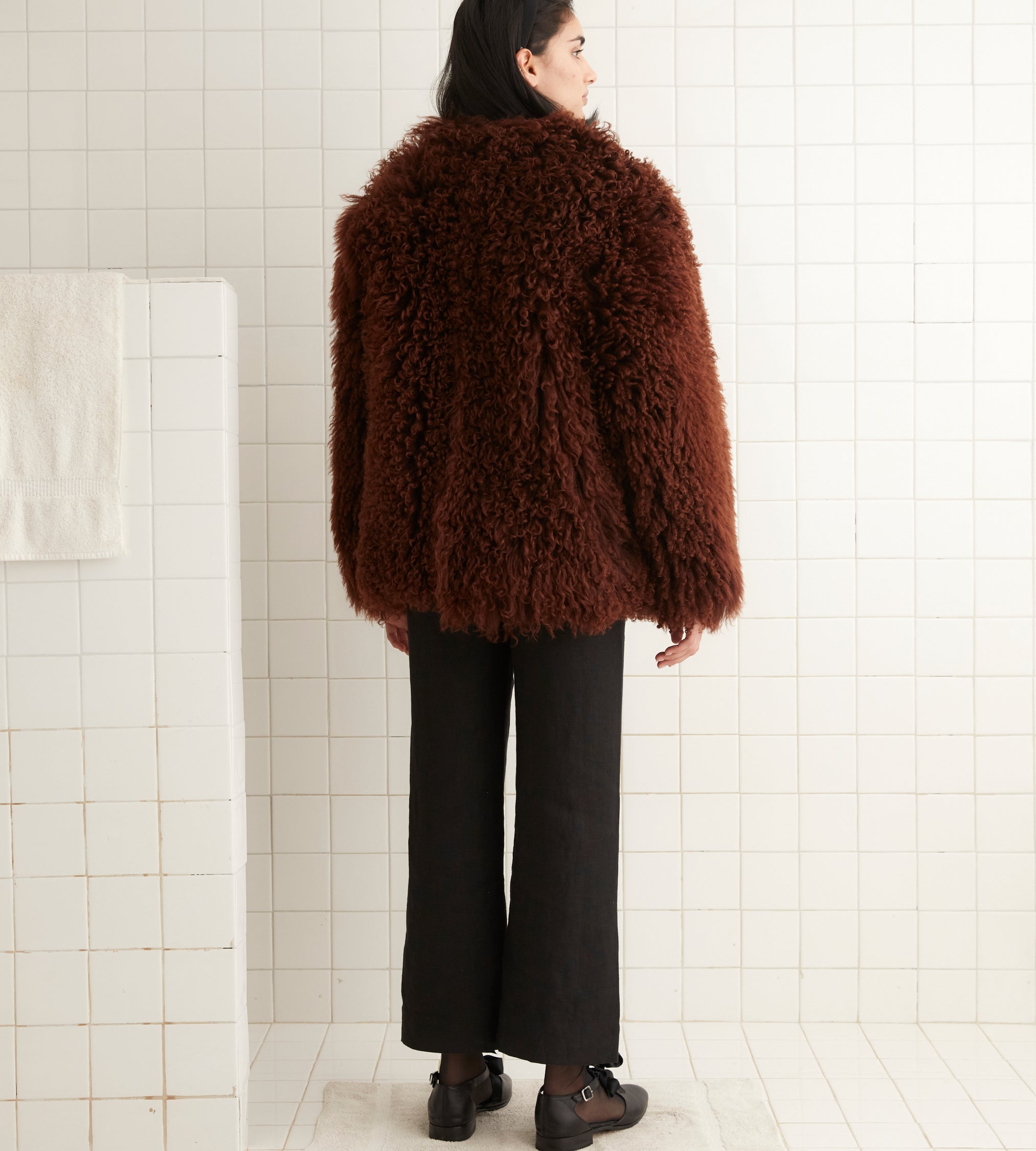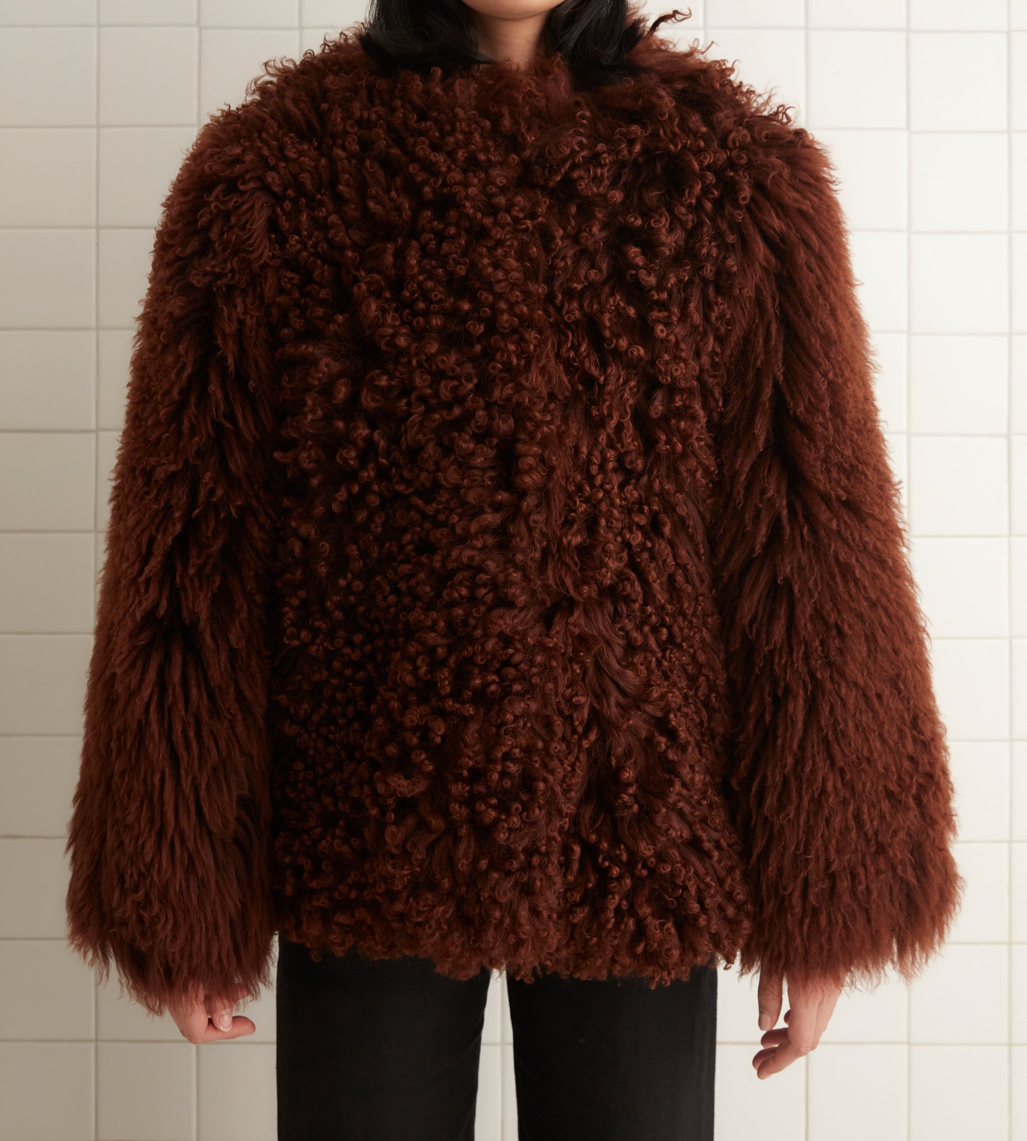 This jacket is inspired by a vintage shag coat, circa 1960s-1970s. We reproduced the silhouette for this style.