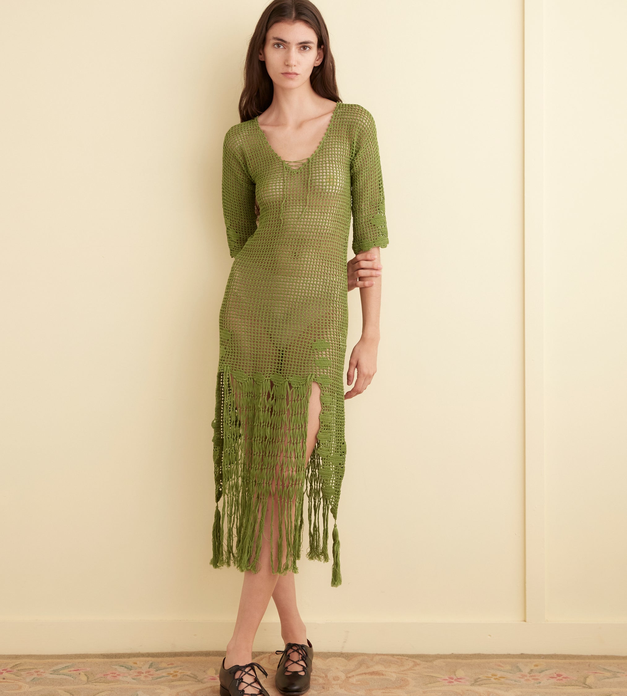 This dress is a historical reproduction of a crocheted dress from the 1920s. Made from cotton yarn, it features scalloped sleeves and macrame fringe about the hem. The dress is reversible and can be styled either with a low neckline or with an open back.