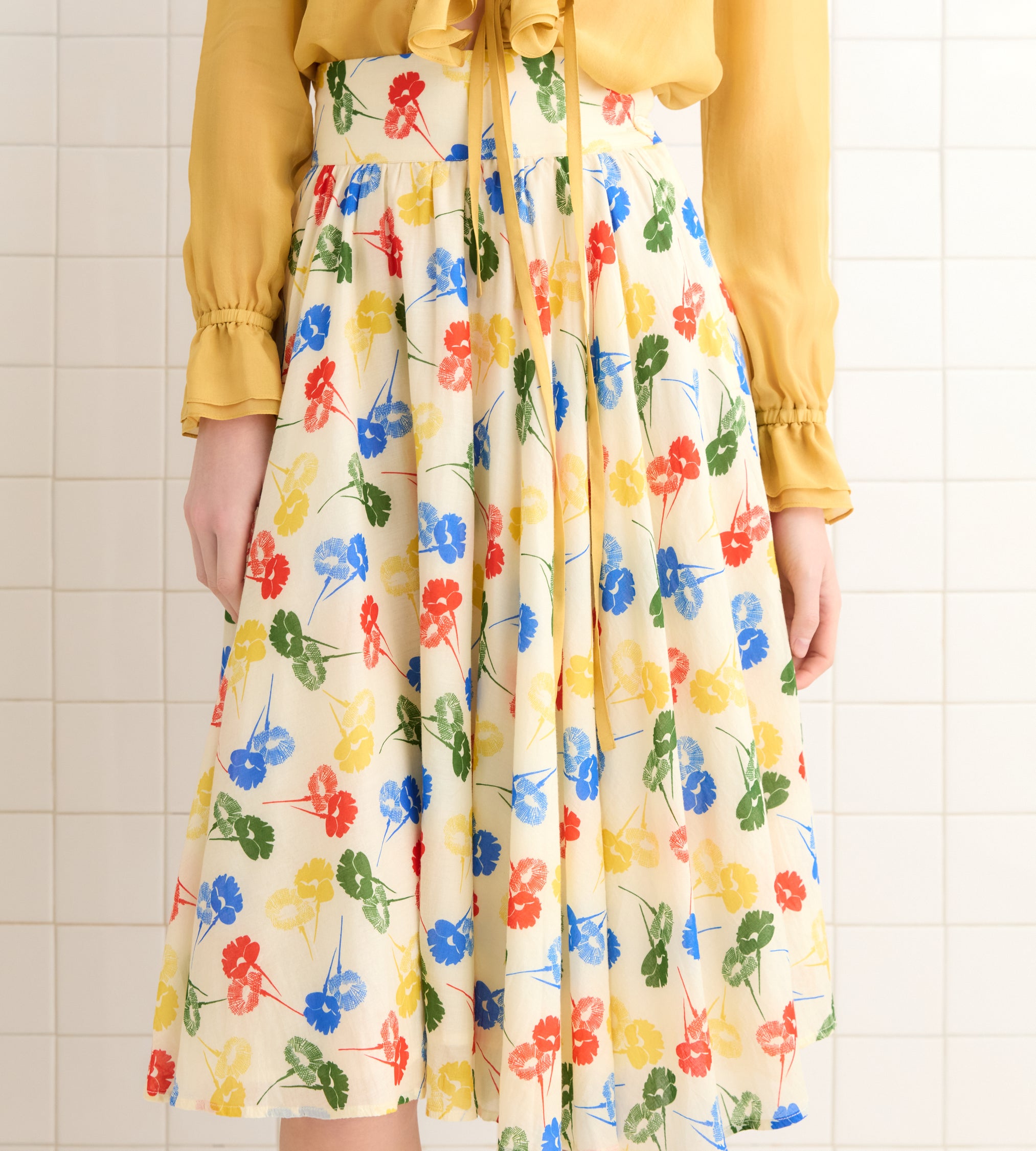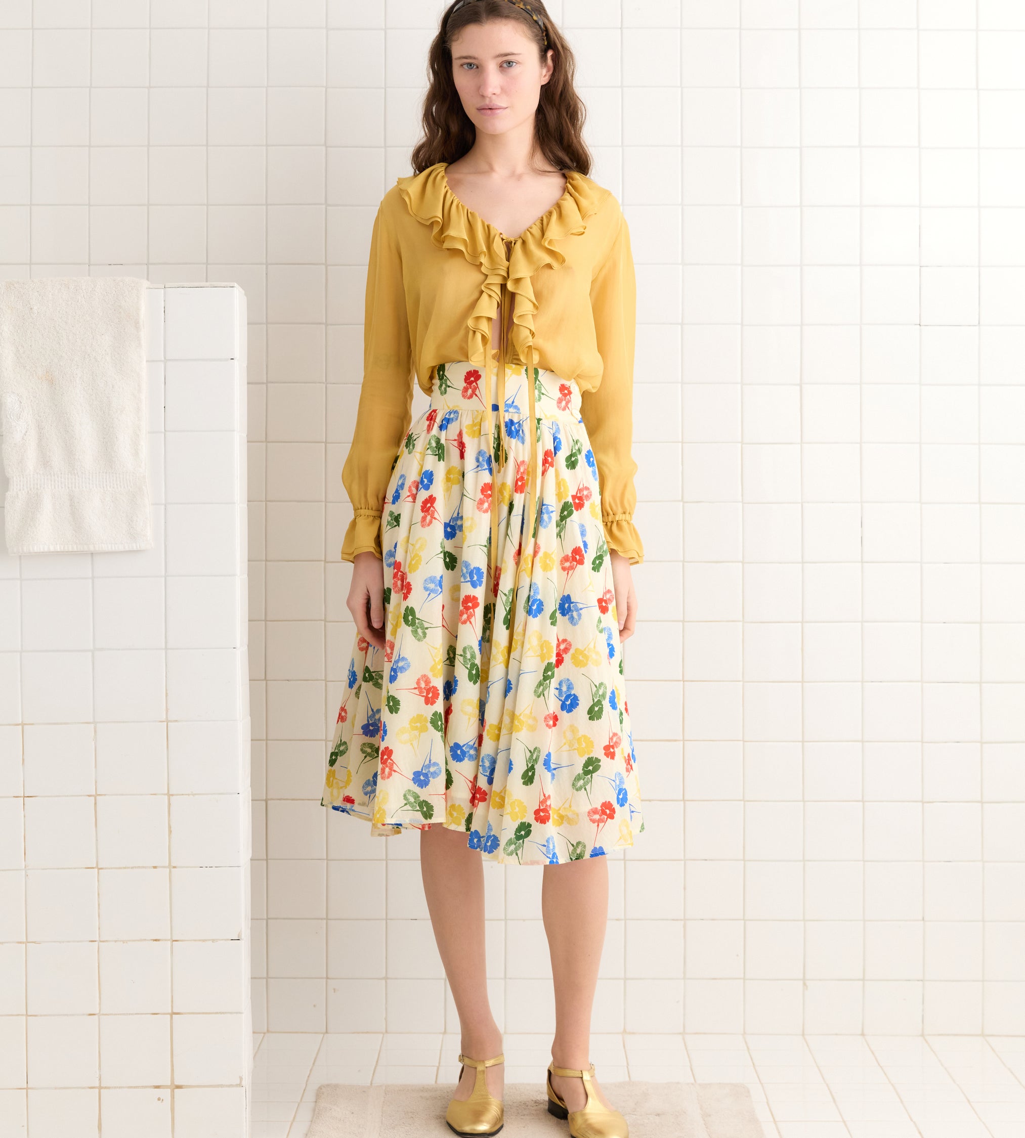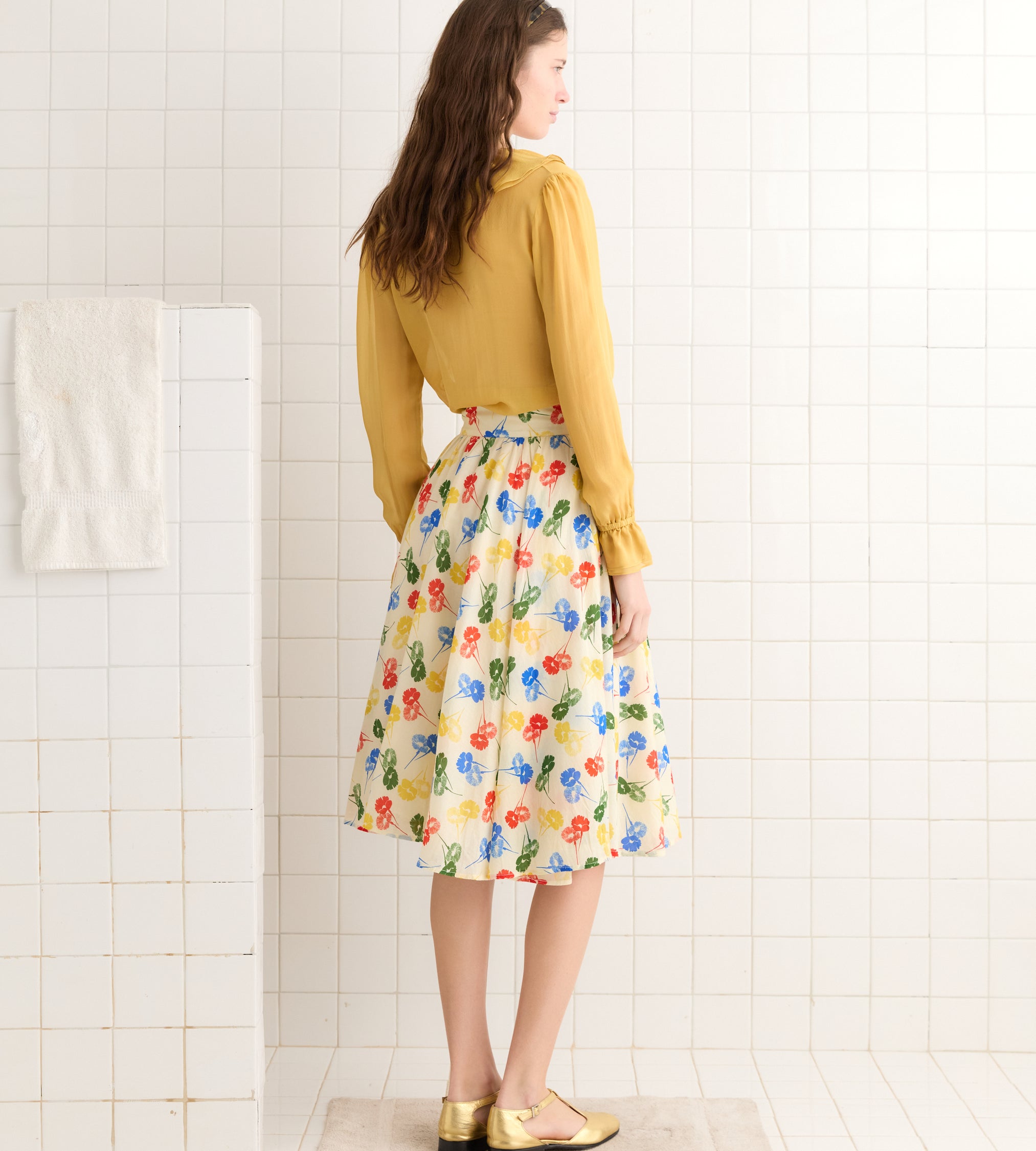 This skirt is inspired by a girl’s dress from the late 1920s or early 1930s, printed with a colorful floral pattern. We reproduced the fabric for this style.