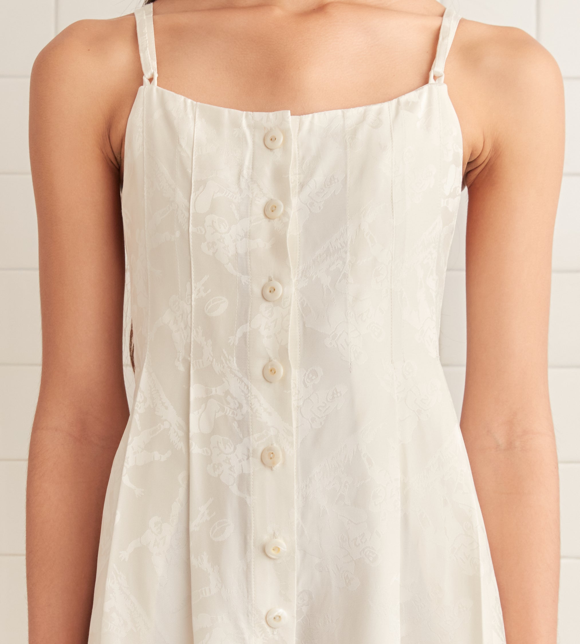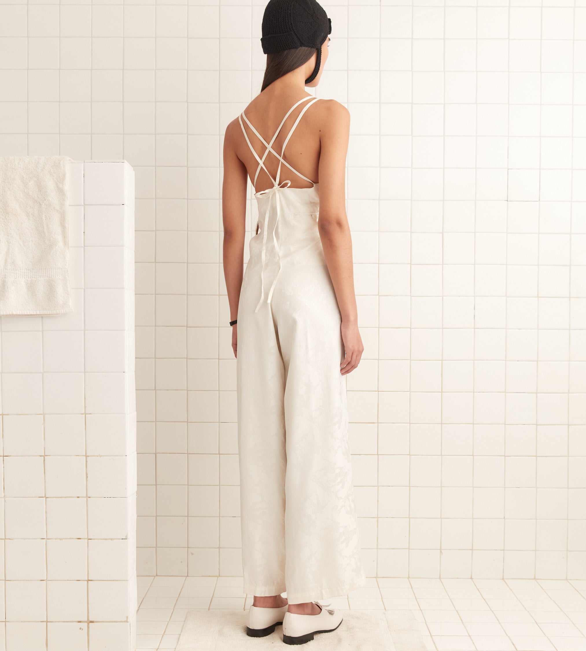 This jumpsuit is inspired by deadstock yardage from the midcentury, woven with a pattern of football players. We reproduced the fabric for this style. The jumpsuit has a loose, relaxed fit, with straps that cross over the shoulders and tie at the back.
