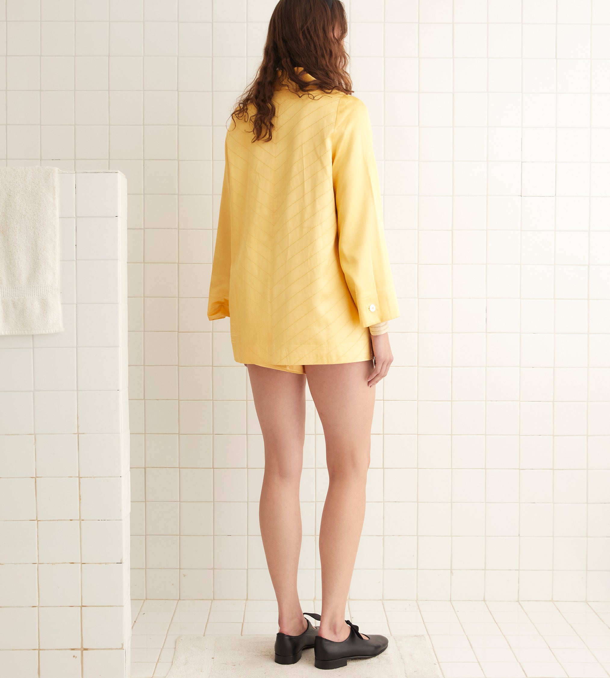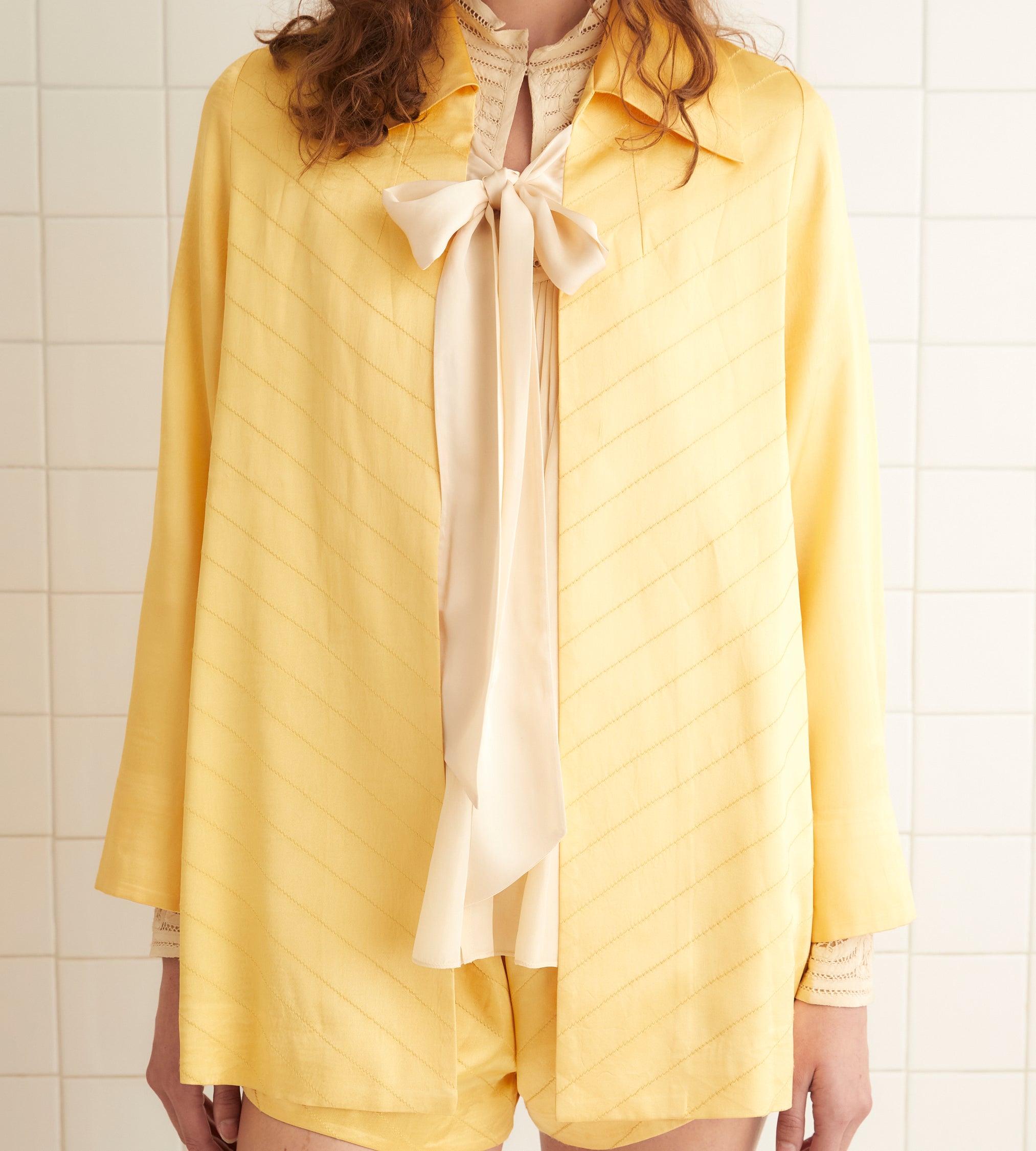 This jacket is a reproduction of a golden bed jacket from the 1940s. We reproduced the original piece, with its quilted details and white ribbon tie, for this style.