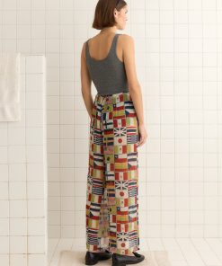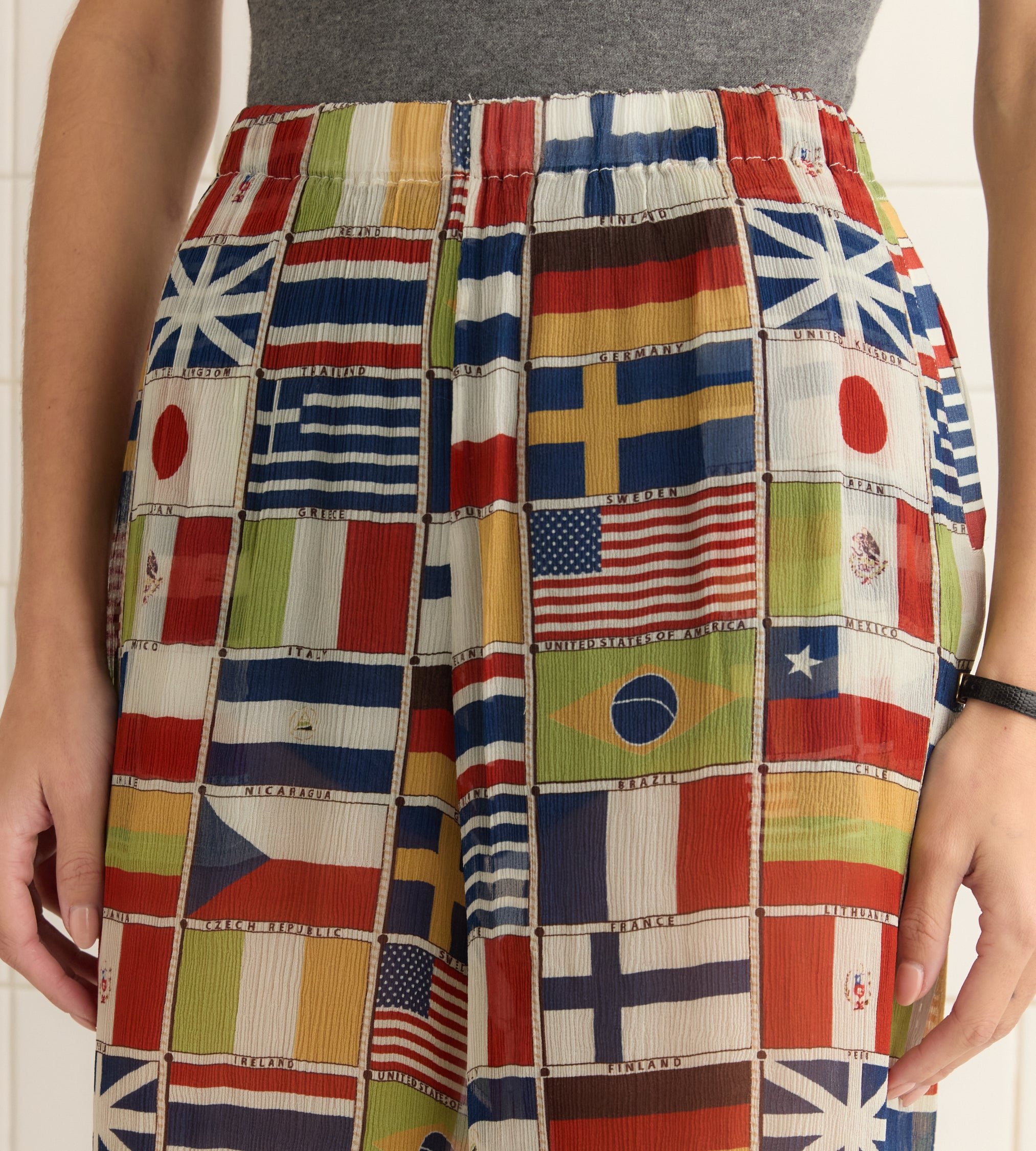 These pants are inspired by a scrap of deadstock printed yardage. We reproduced the flag print on textured silk crepe for this style.