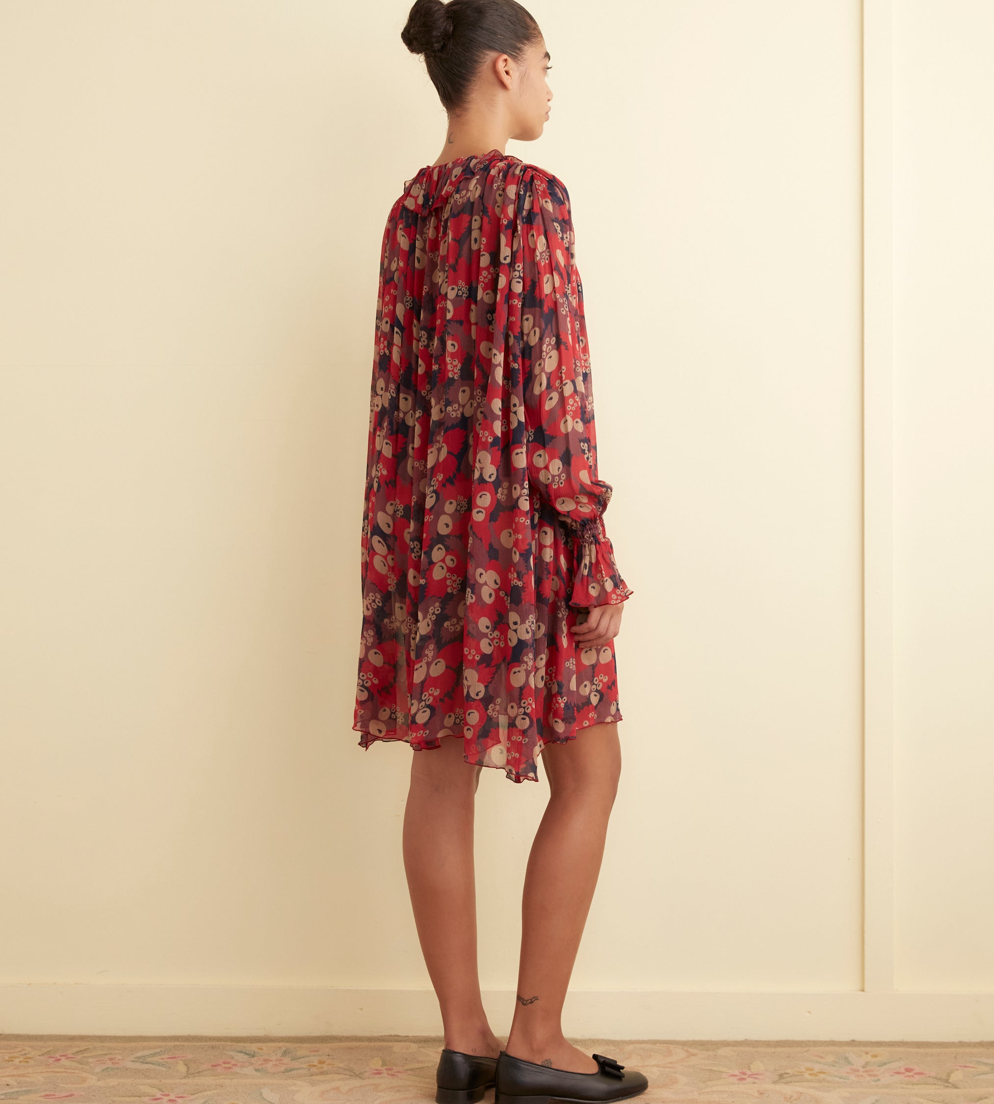 This style is inspired by a dress from the 1920s. We have reproduced the original piece, with its gathered, unfitted silhouette, in a print recreated from 1920s fabric. The neckline is trimmed with a ruffle detail and the sleeves with smocking.