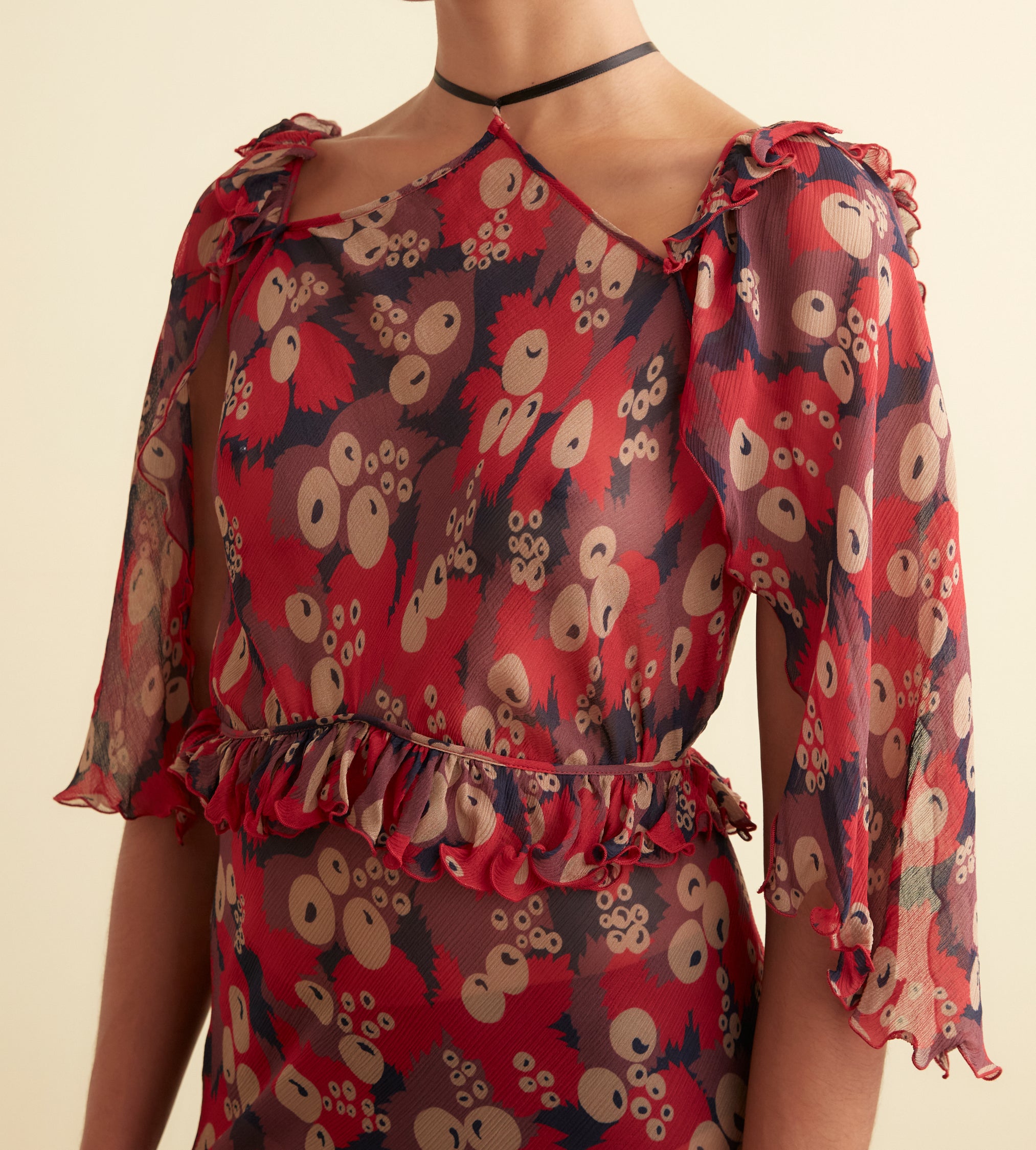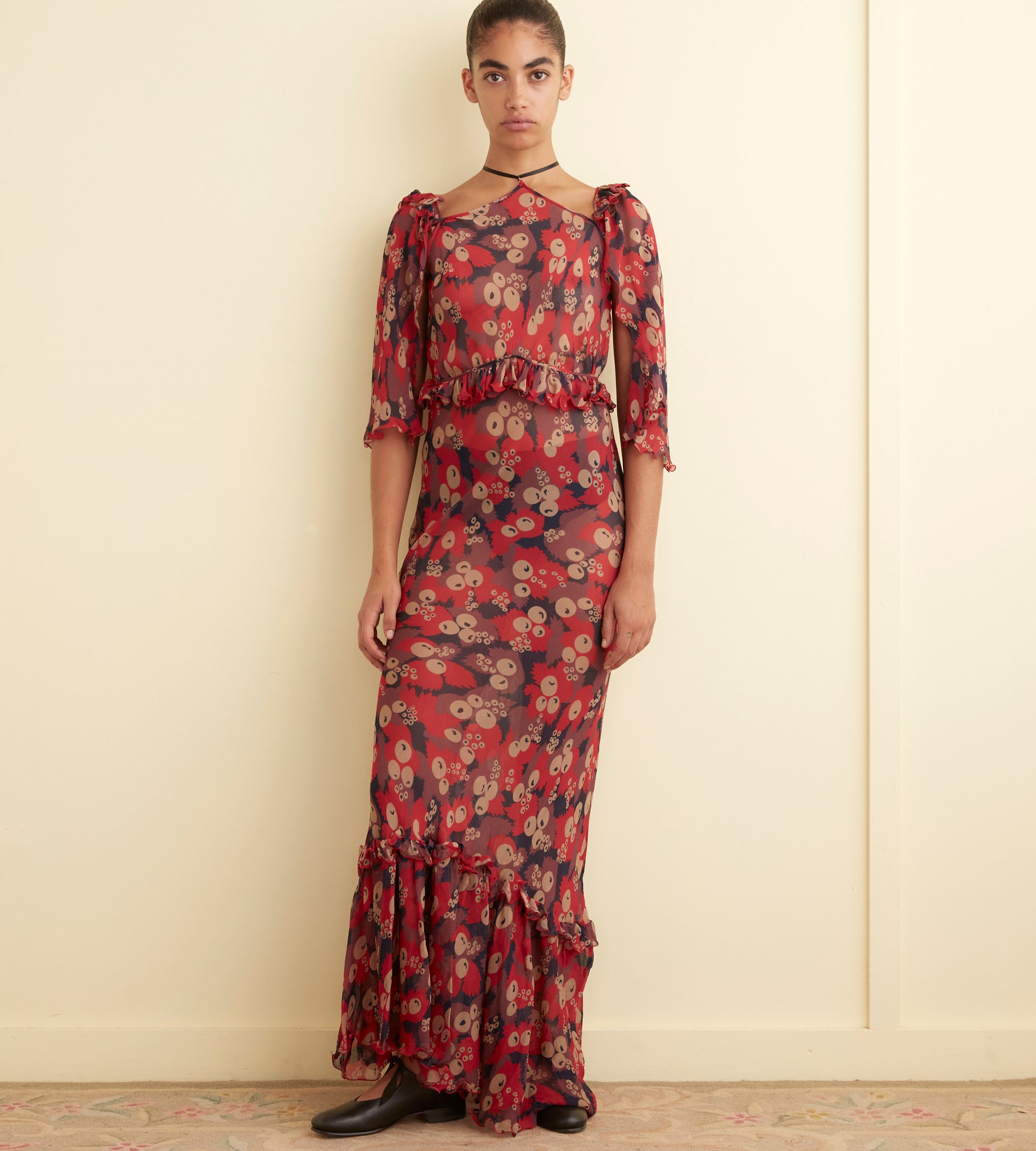This dress is inspired by one from the 1930s. We recreated the original dress, with its ruffles and halter-neck detail, in a berry print recreated from a scrap of 1920s fabric.