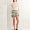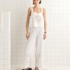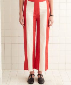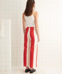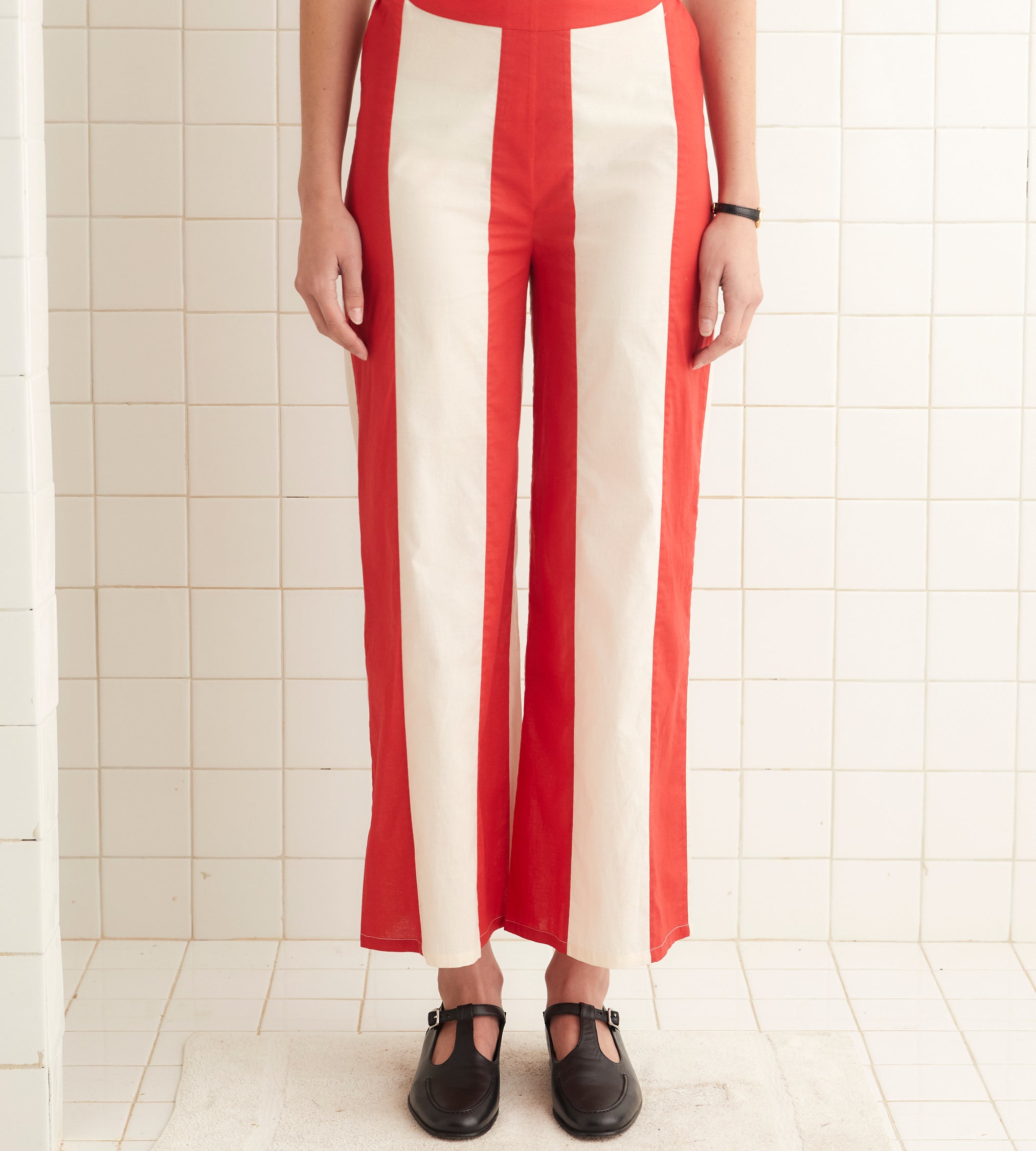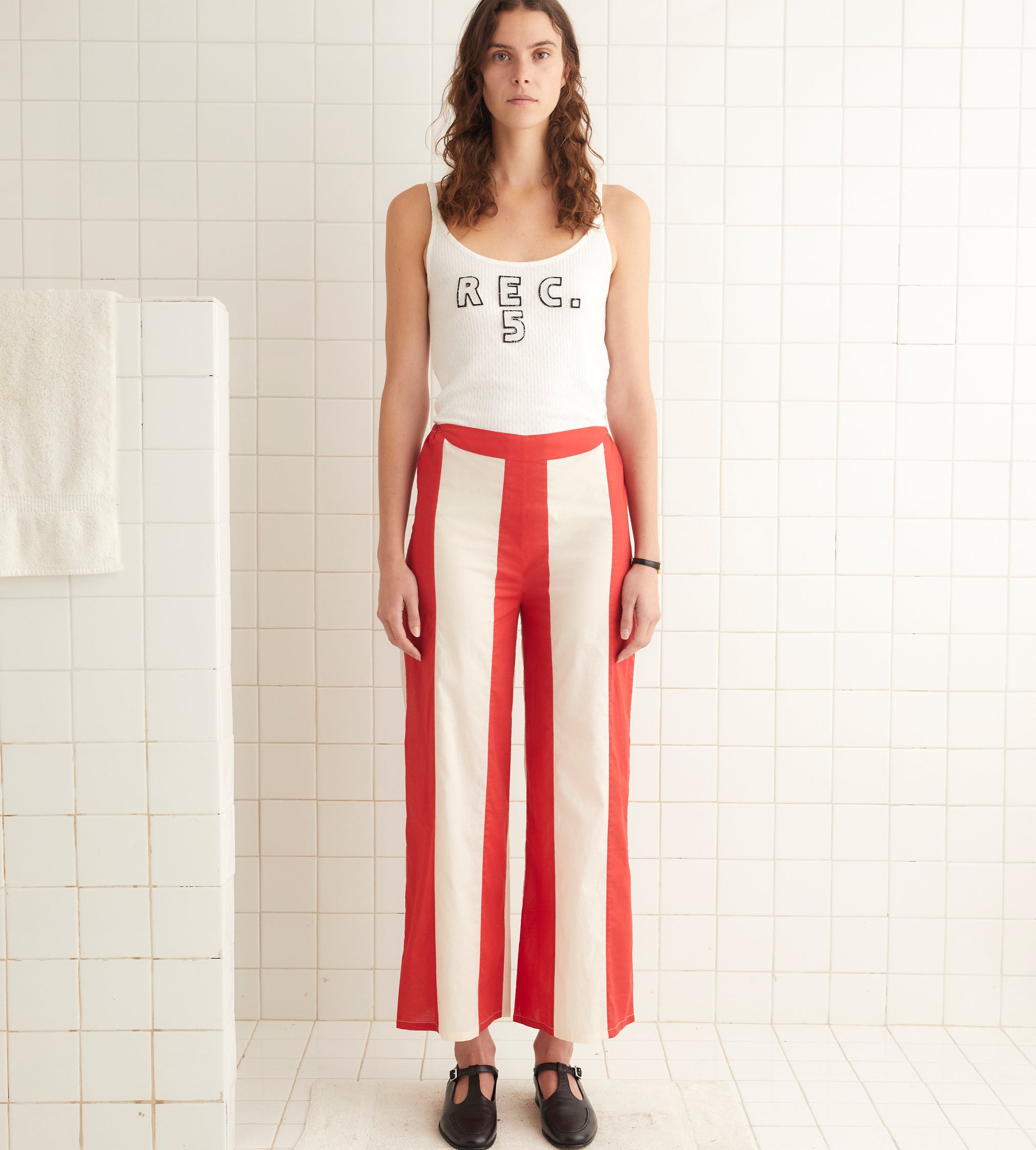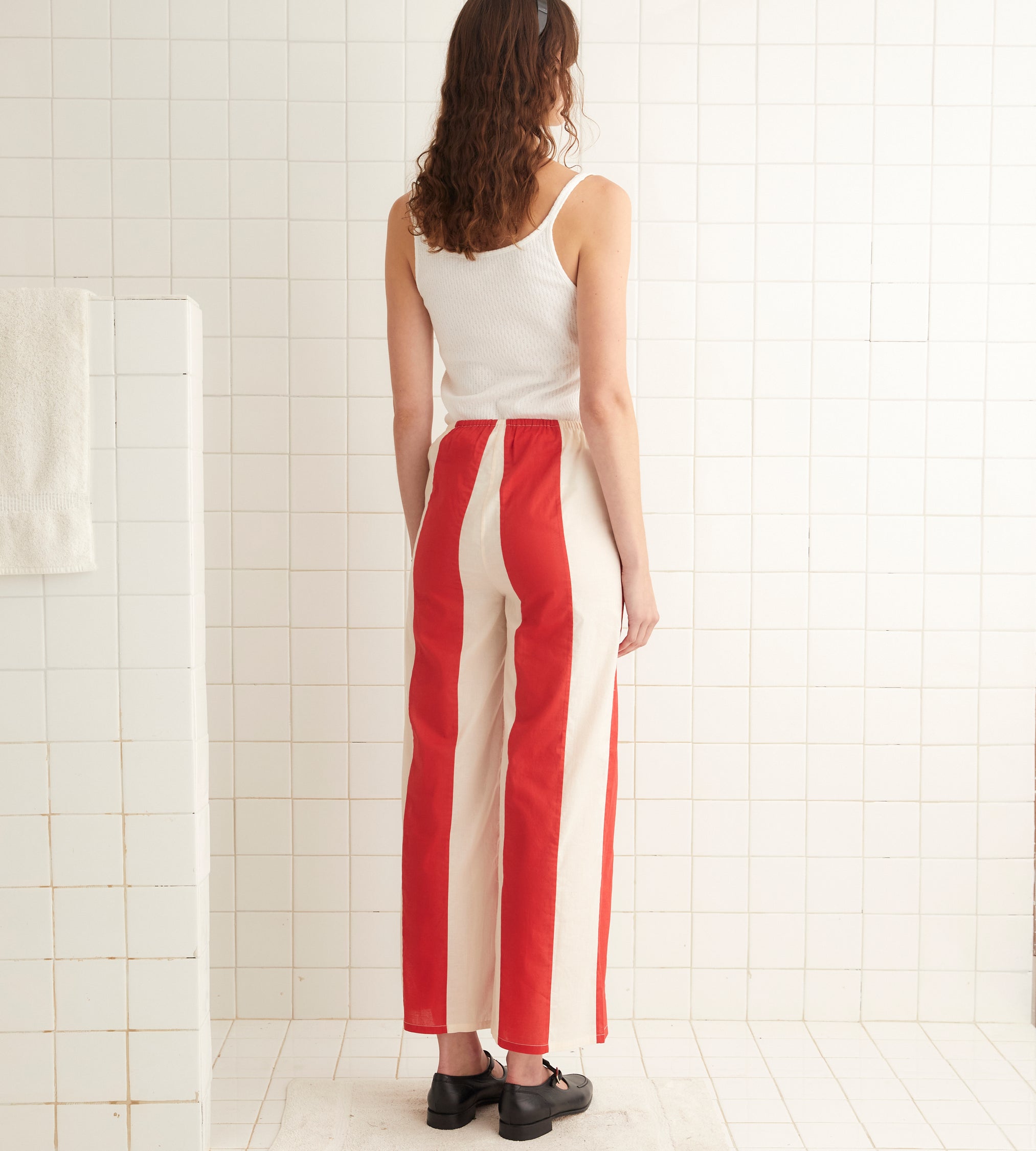 These pants are inspired by American flag bunting from the 1930s. We reproduced the red and white stripe for this style. The pants have an elastic waist and a wide leg.