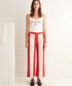 These pants are inspired by American flag bunting from the 1930s. We reproduced the red and white stripe for this style. The pants have an elastic waist and a wide leg.