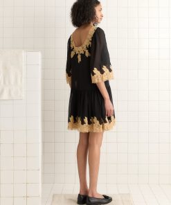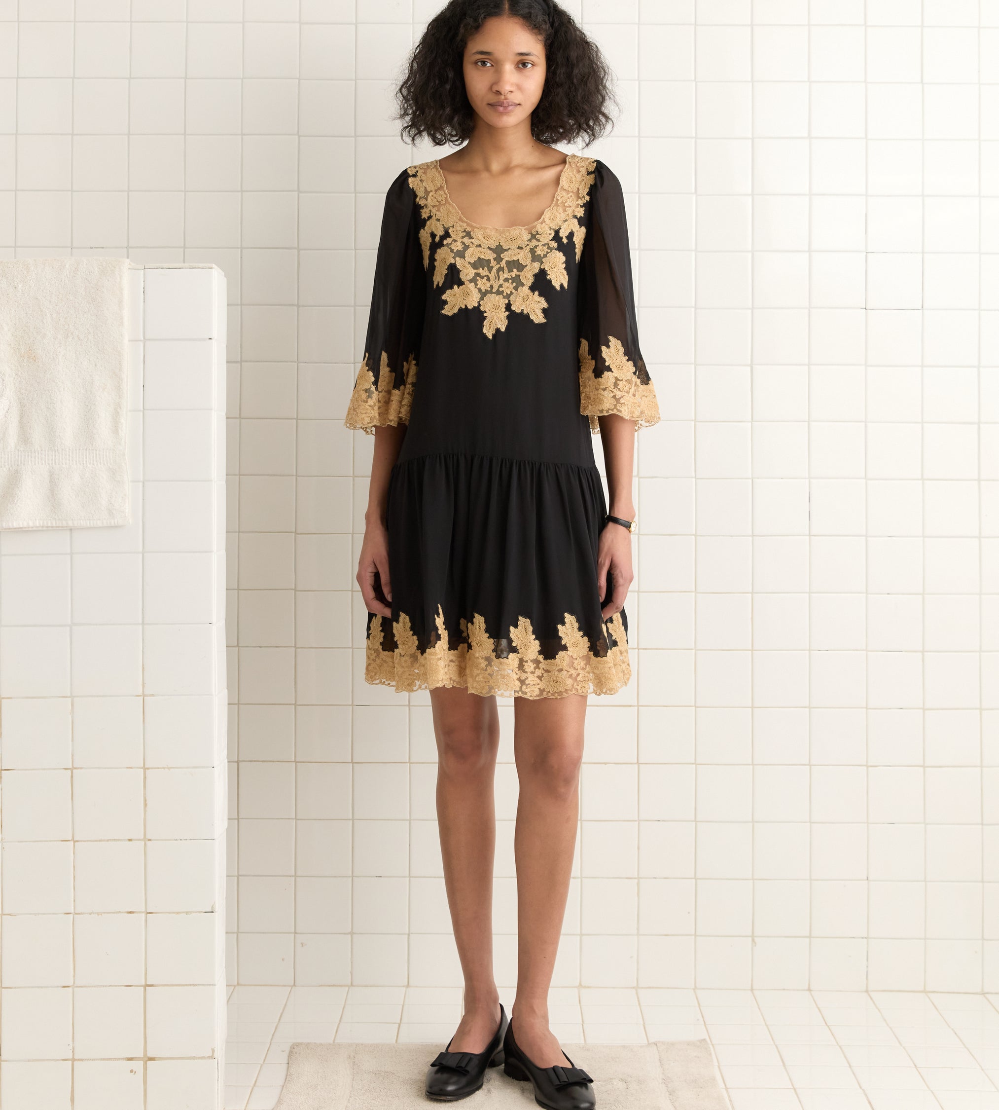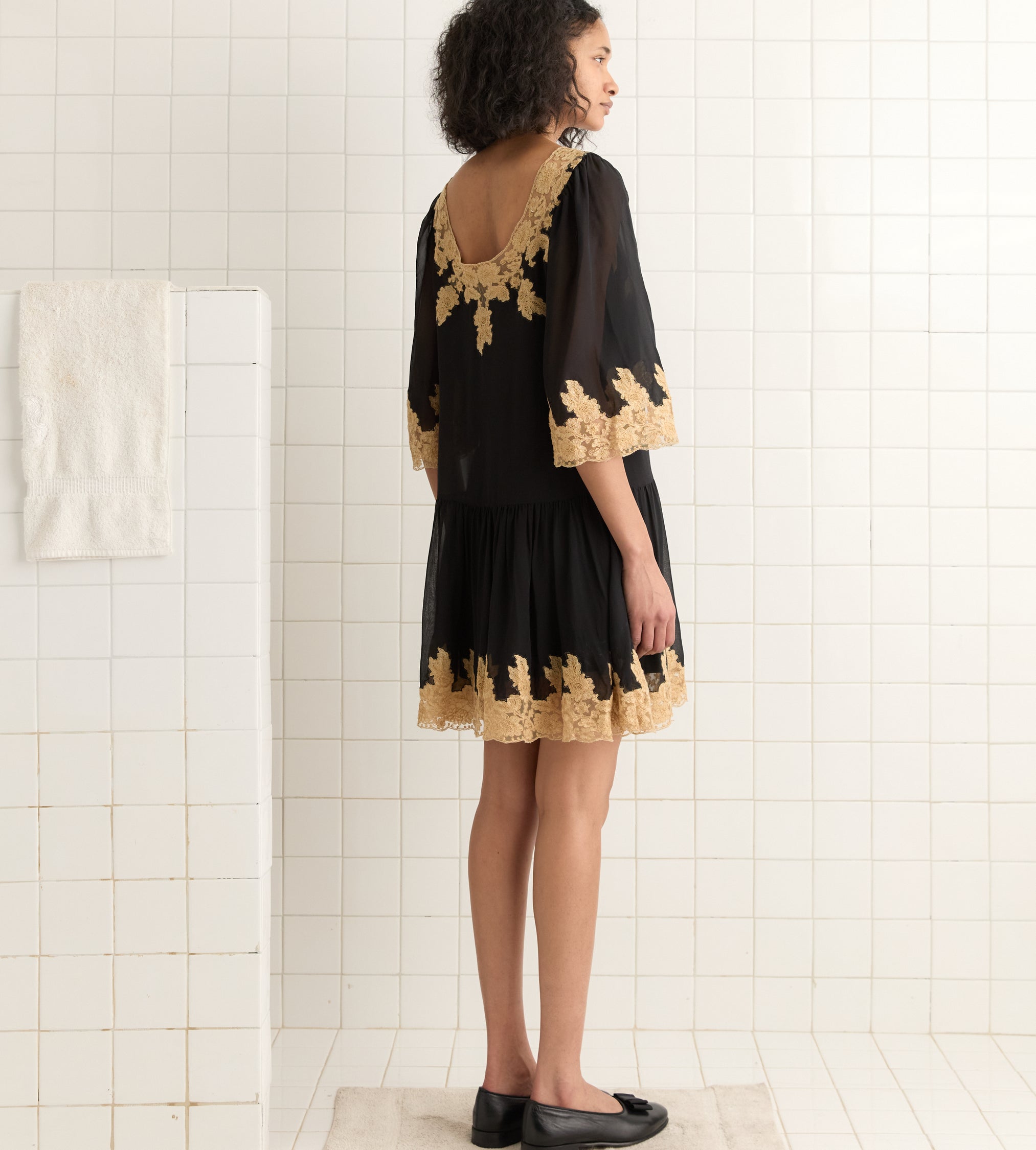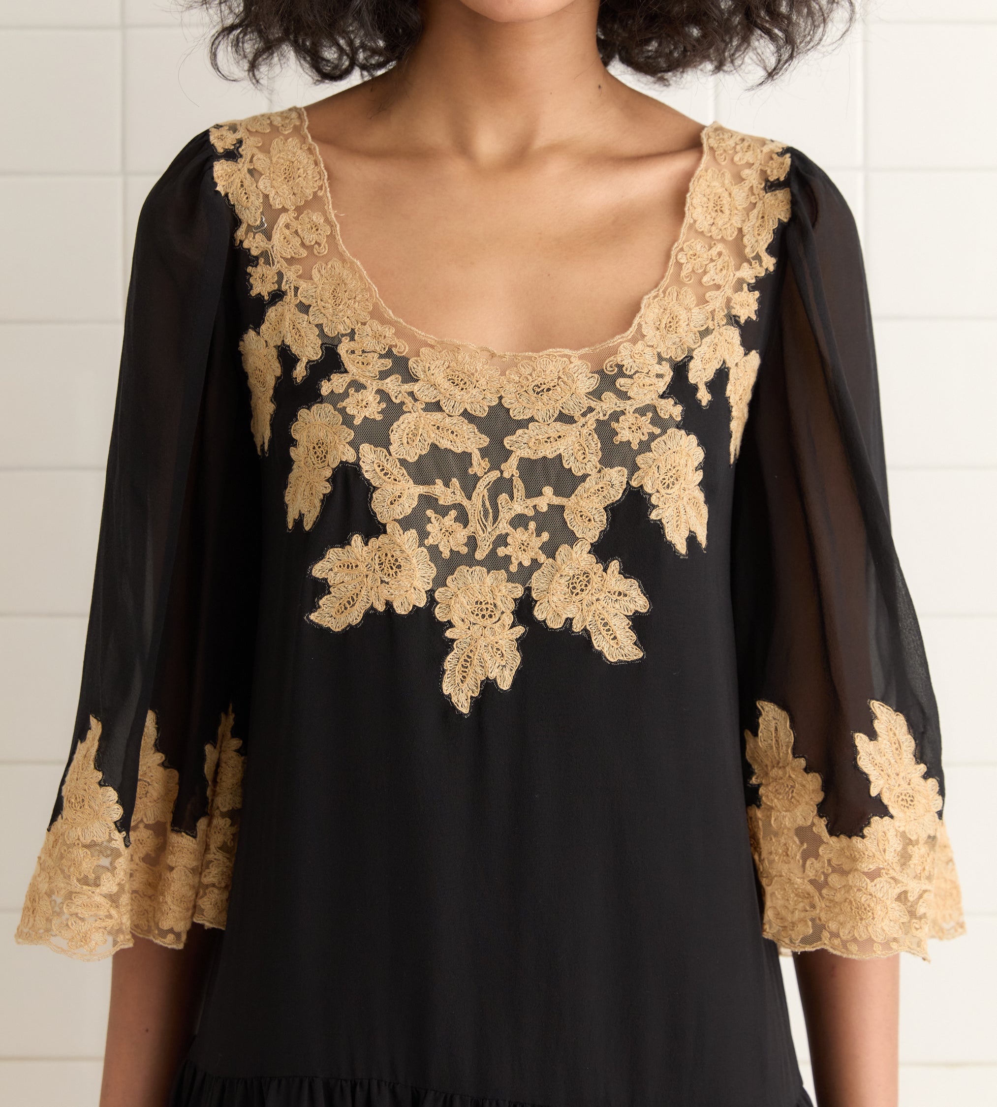 This style is a historical reproduction of a dress from the late 1920s or early 1930s. Made of airy silk chiffon, it features panels of natural lace around the hem, collar, and bell sleeves.