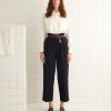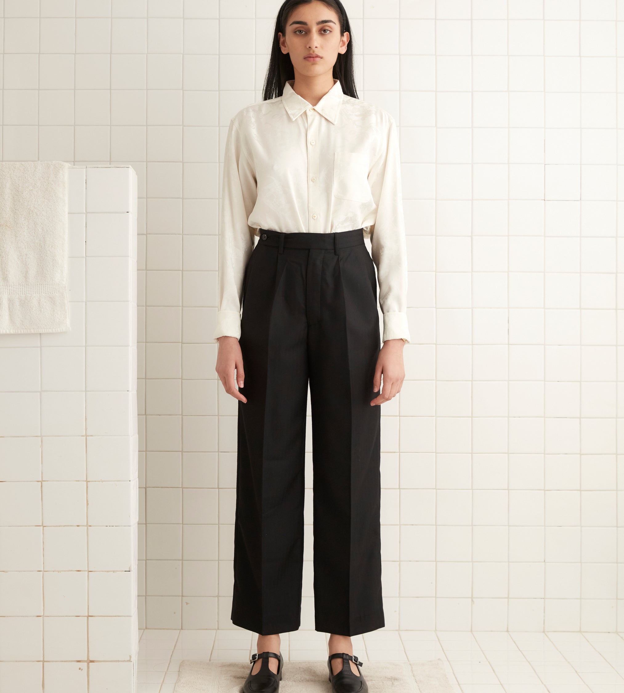 These trousers are inspired by men’s trousers from the 1940s-1950s. We reproduced the original silhouette, which has a wide leg and a tab button at the waist, in a lightweight, drapey wool.