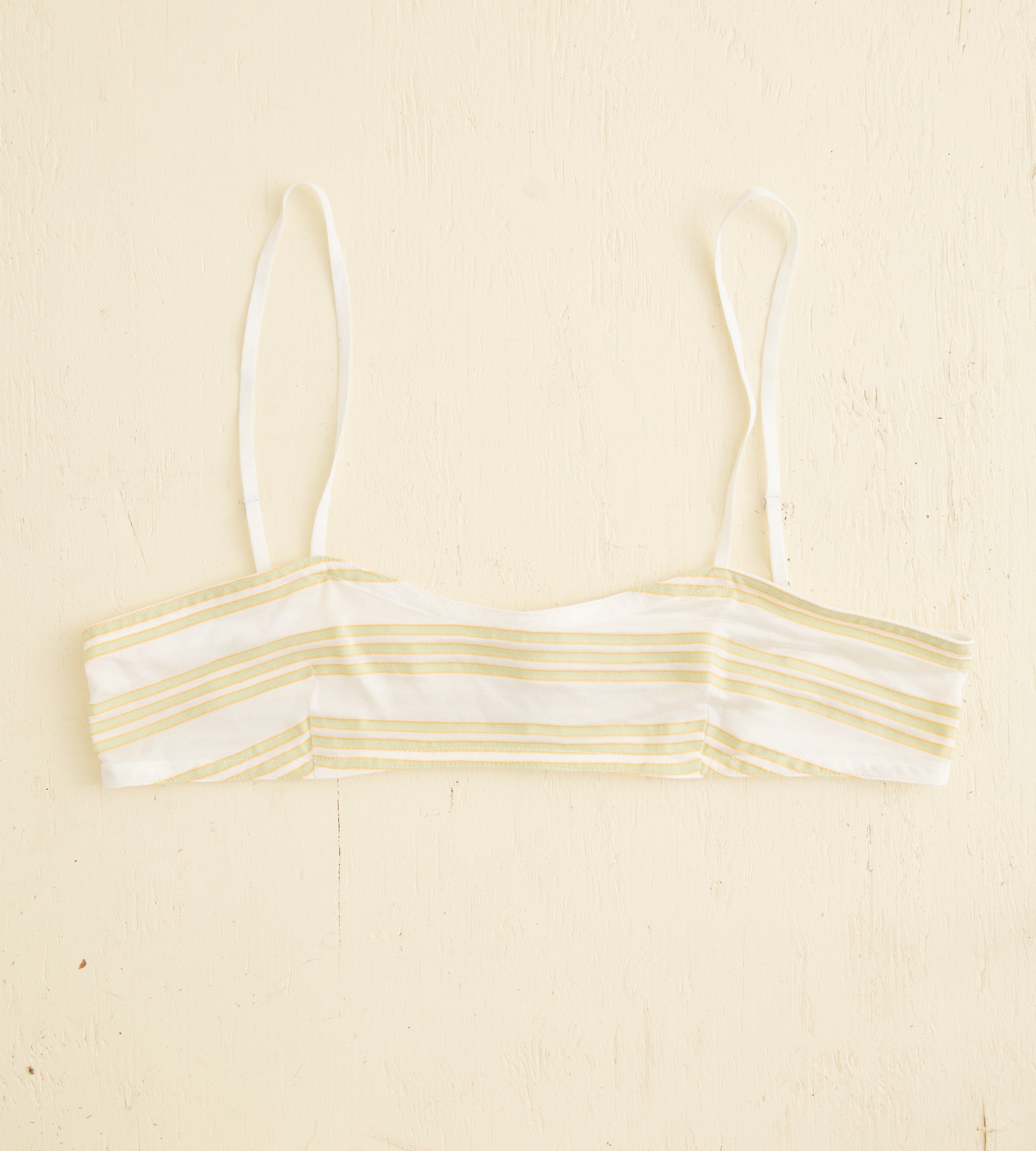 This bra is inspired by a 1920s sock, which was patterned with this green and yellow stripe. We reproduced the original stripe for this bralette, made from a silky cotton/rayon blend.