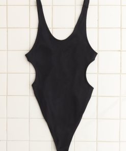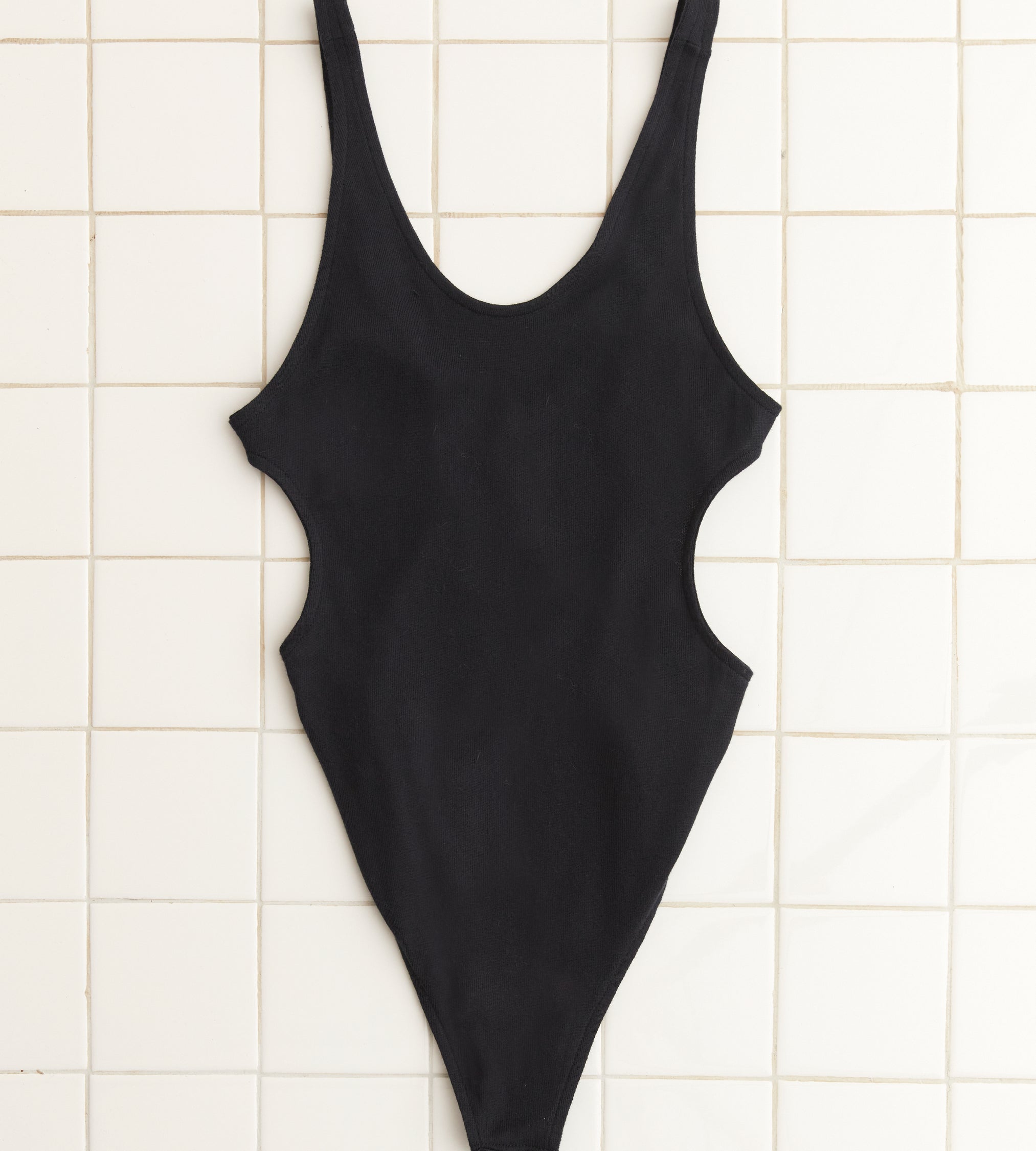 This leotard is inspired by a men’s swimsuit from the late 1920s, which would have been worn with a pair of shorts. Towards the end of the decade, manufacturers began incorporating cutouts at the sides of the suit to reduce the drag from the wet fabric.