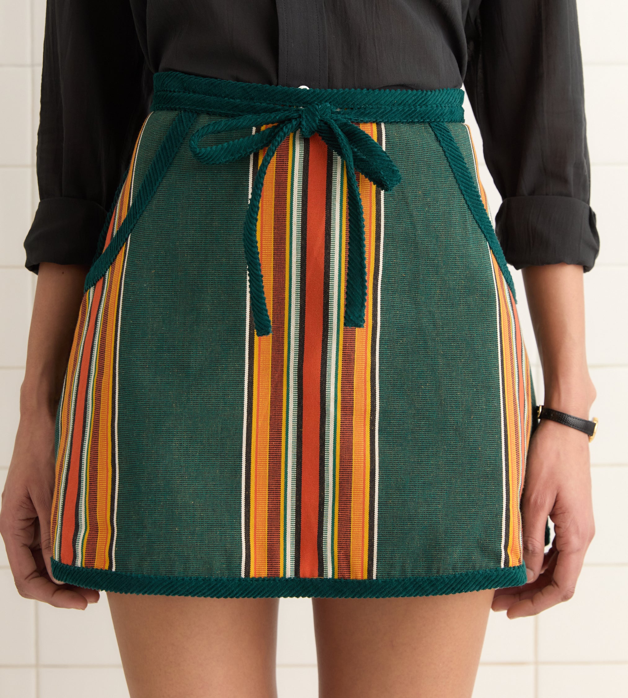 This skirt is inspired by a canvas vest from the 1960s. We reproduced the striped fabric for this style. The skirt wraps at the front and closes with a woven tie.