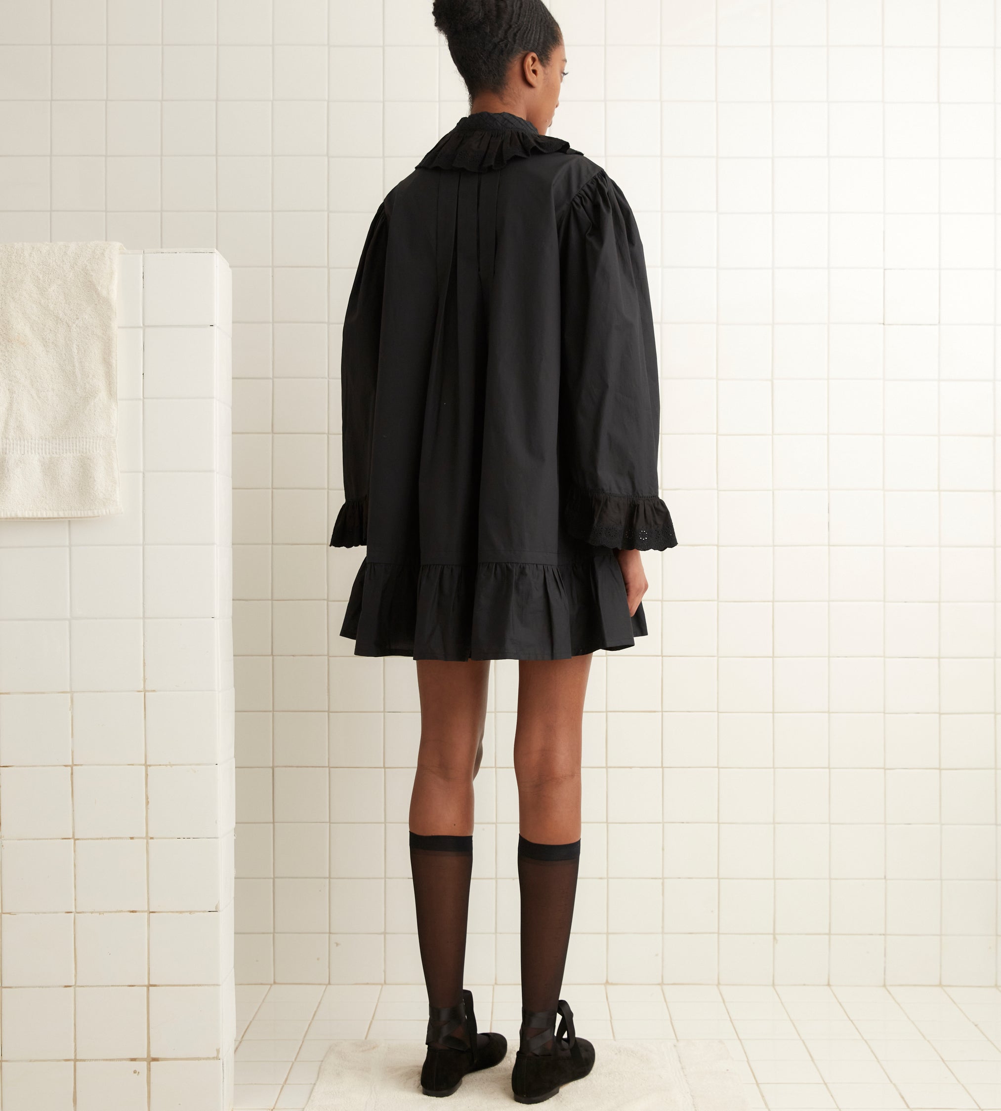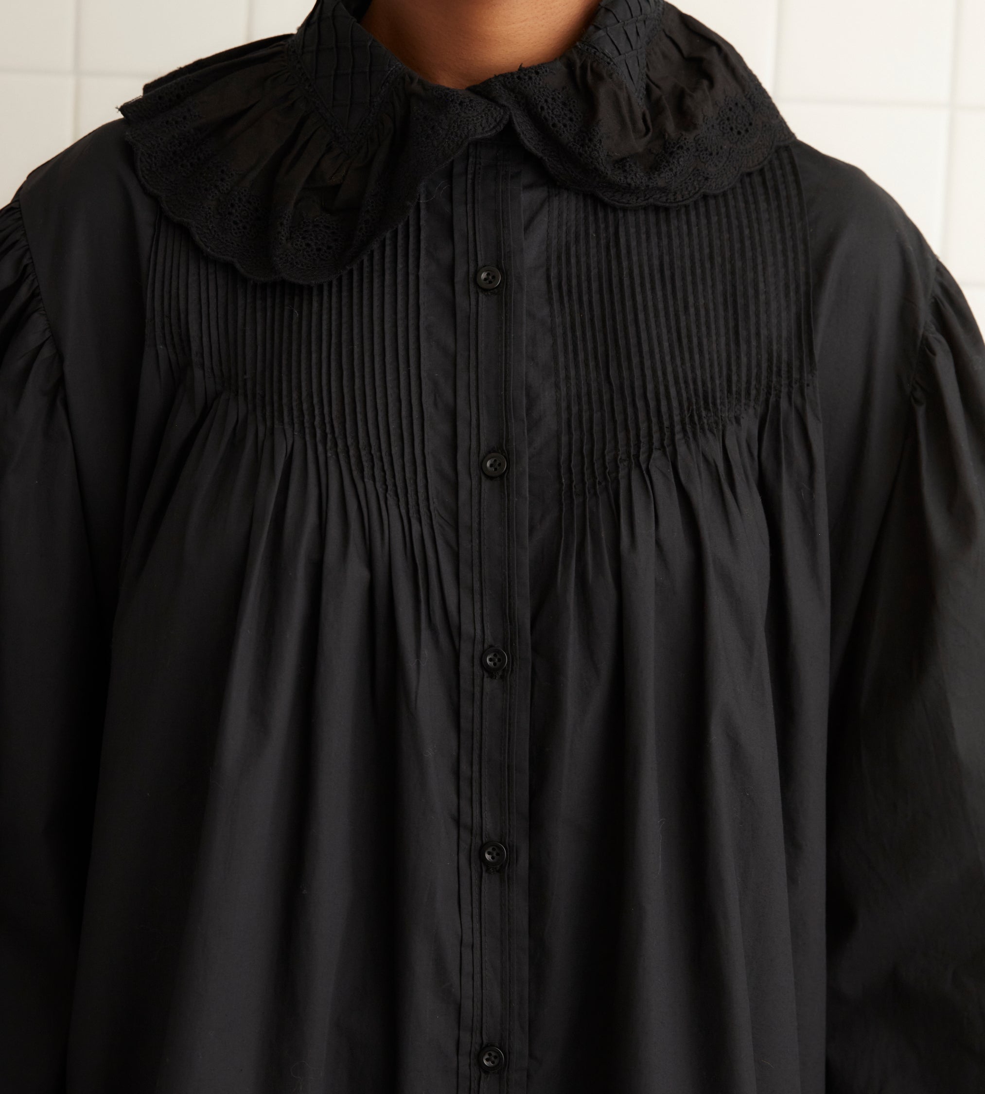 This dress is inspired by a nightgown, circa 1900. We reproduced the silhouette, with its pintucked bodice, swing silhouette, and needlework details, in a crisp white cotton. The dress features bell sleeves and a collar trimmed with broderie anglaise.