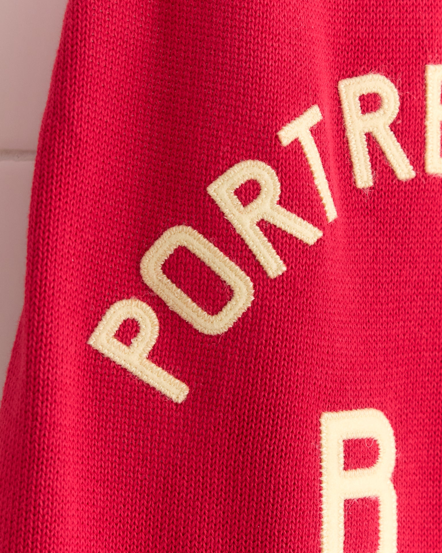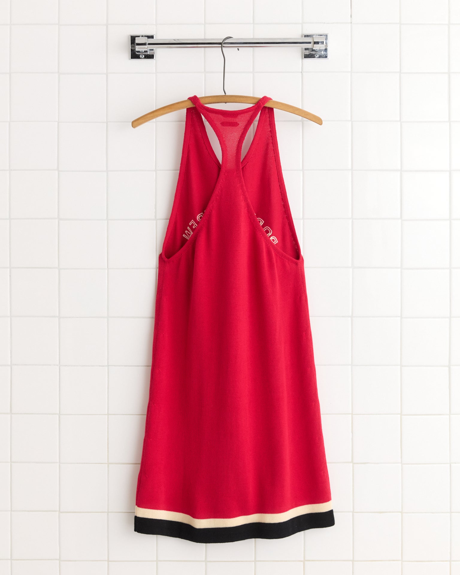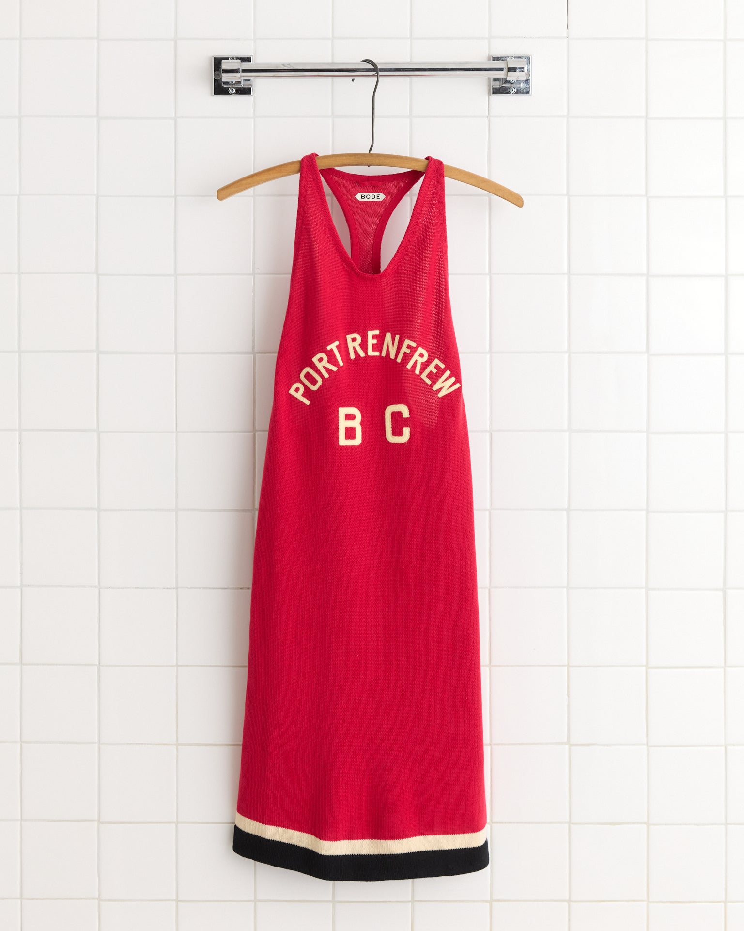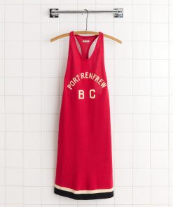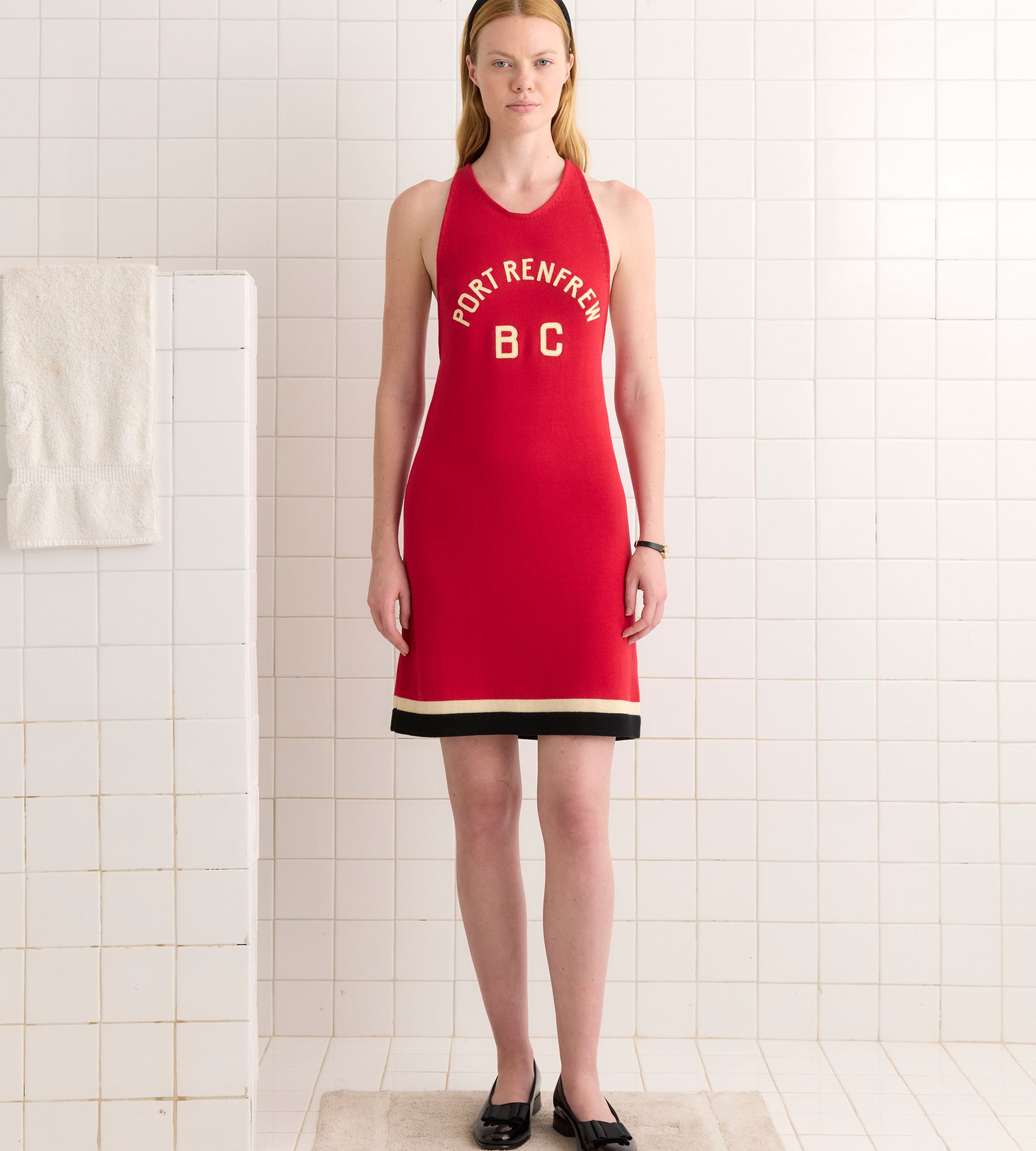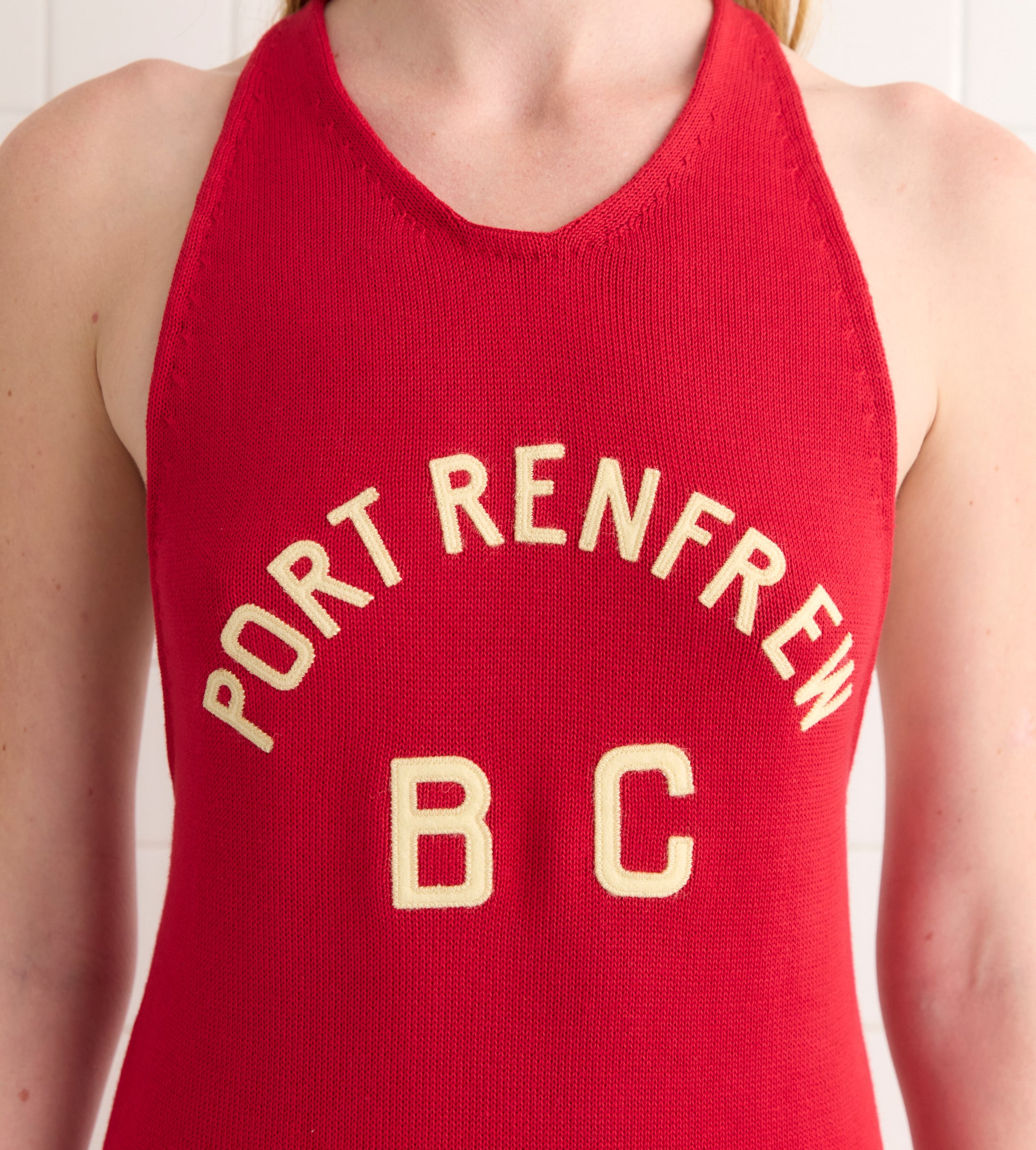 This dress is inspired by a 1900s-1920s rowing singlet. We reproduced the silhouette and stripe pattern for this style, which is appliquéd with “Port Renfrew, B.C.”
