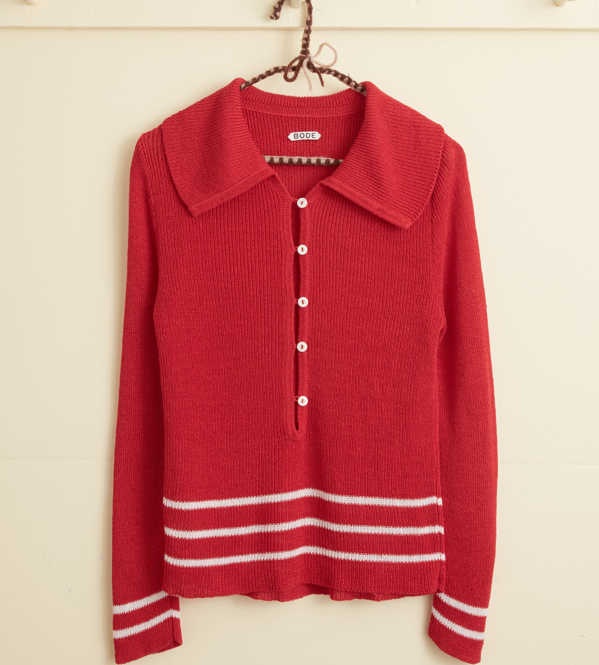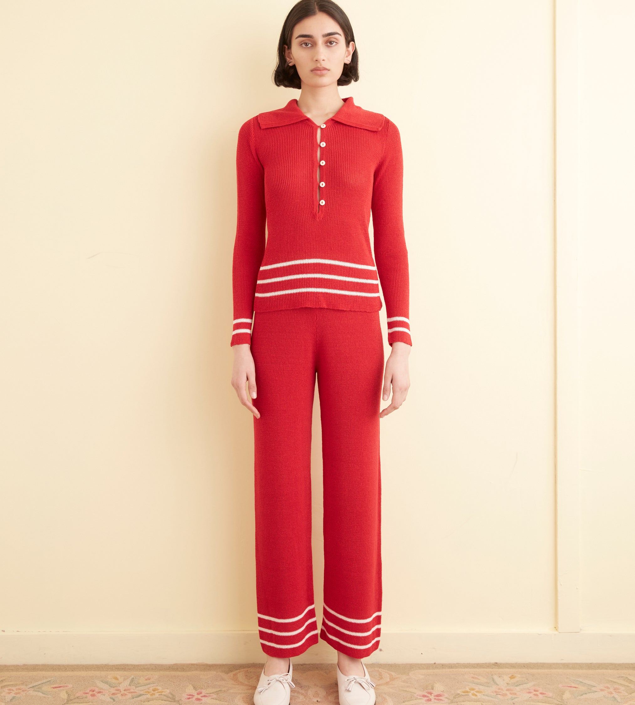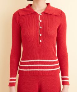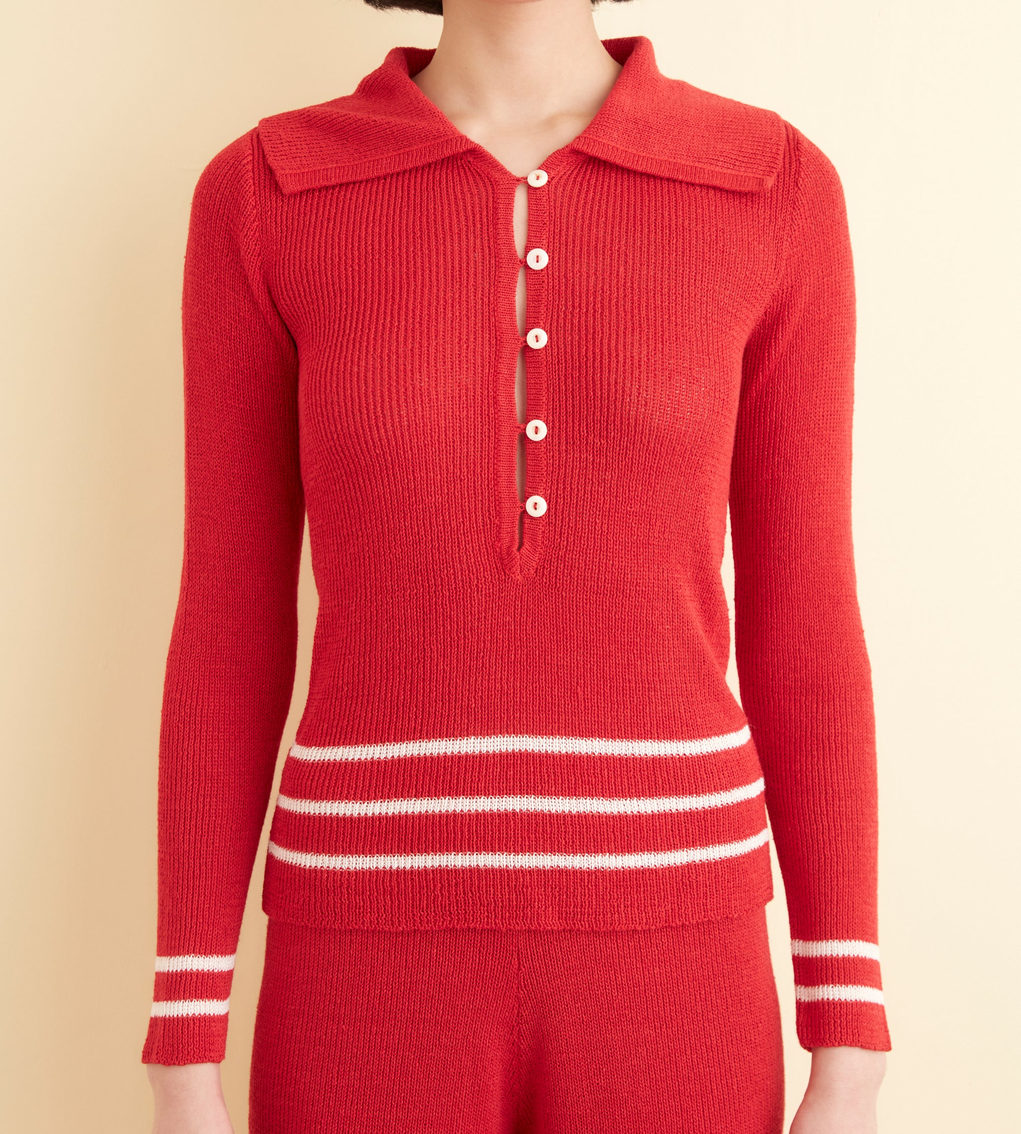 This polo is inspired by a knit set from the 1970s. We reproduced the light, silky knit of the original, with its stripes around the hem, for this style.