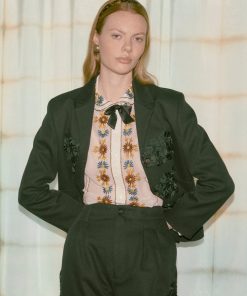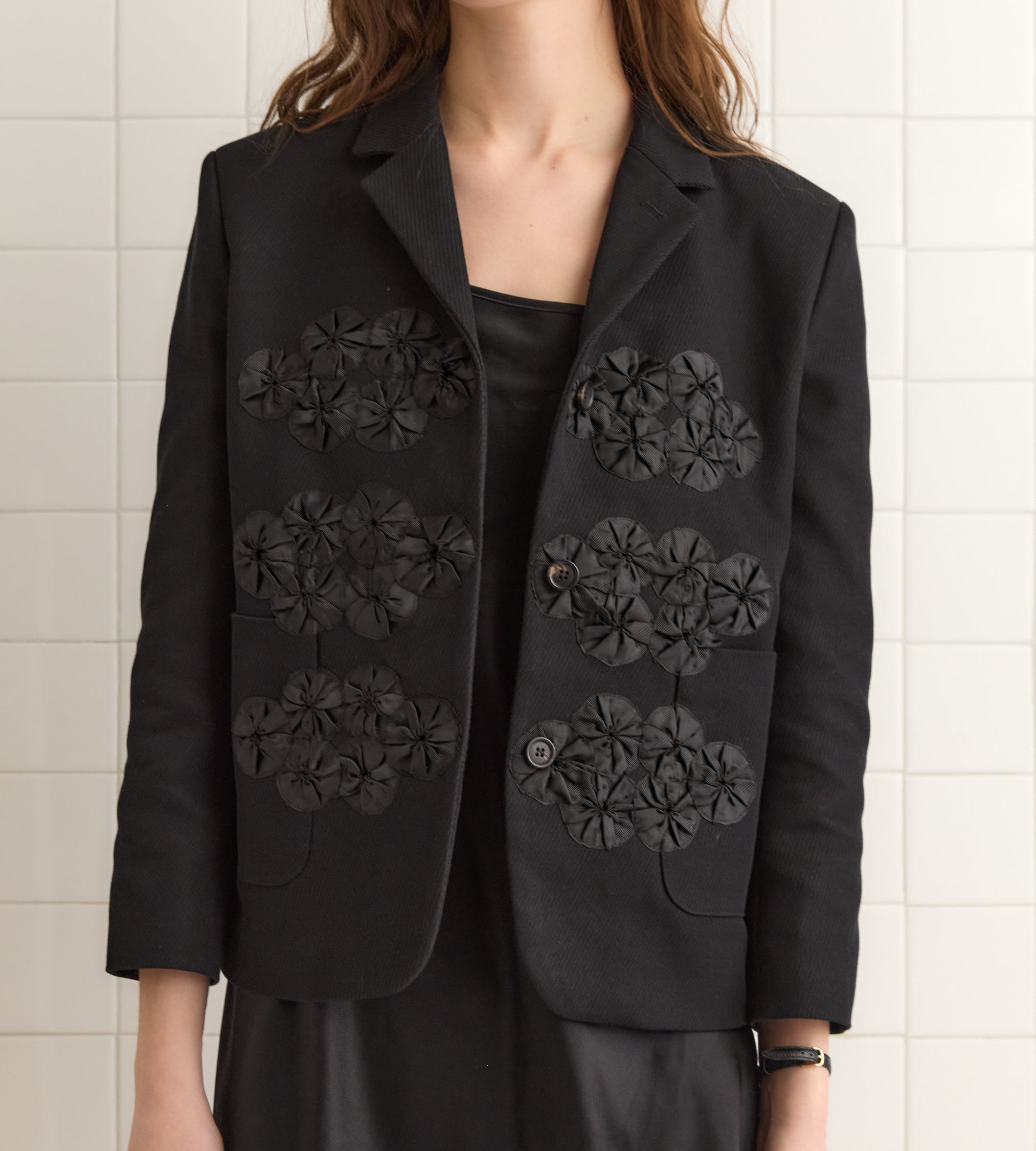 This jacket is inspired by a women’s suit jacket from Italy. We reproduced the silhouette in heavyweight twill, with ribbon appliquéwork across the front buttons.