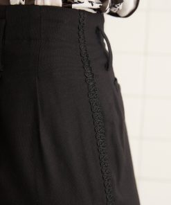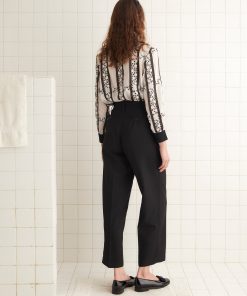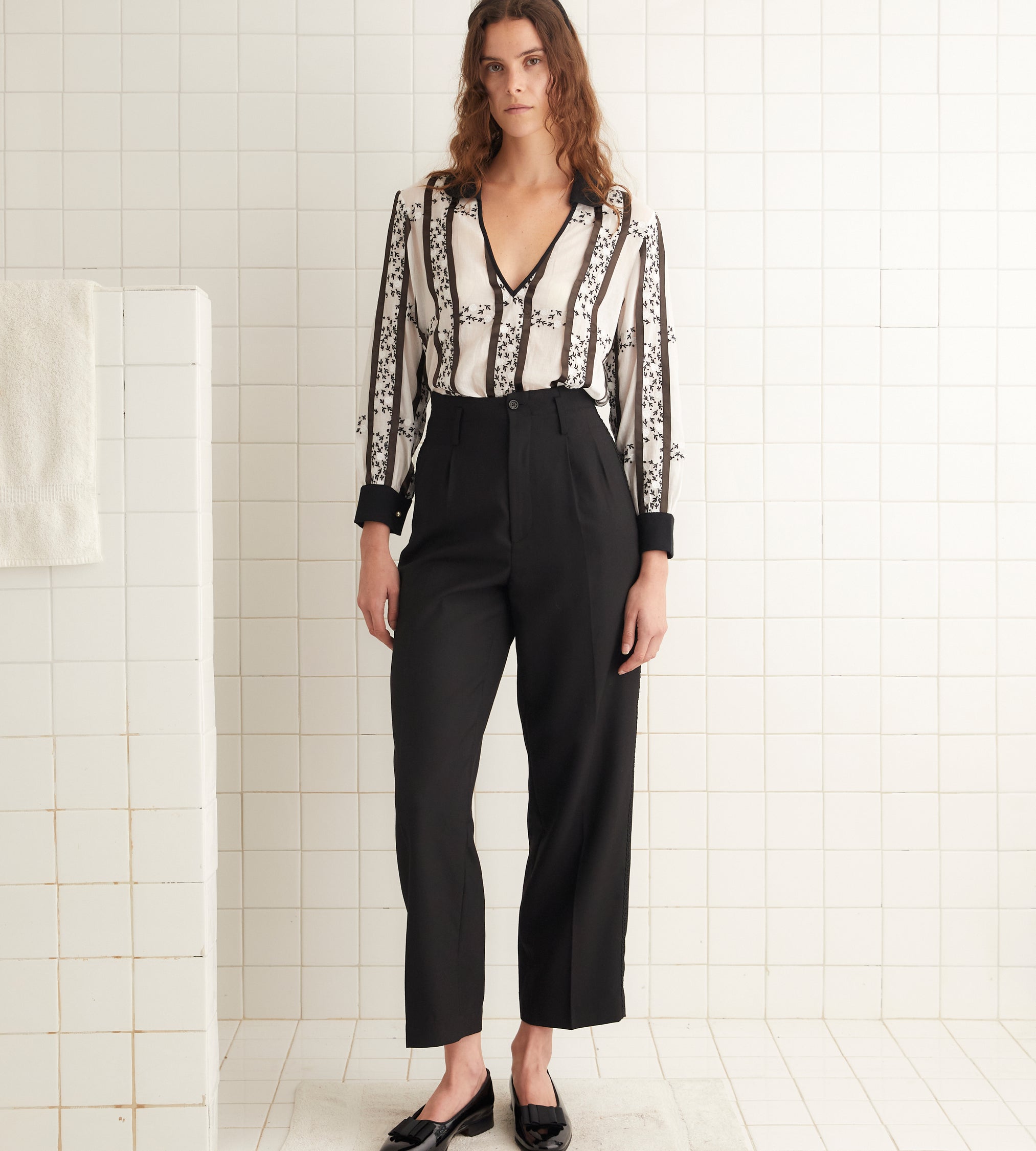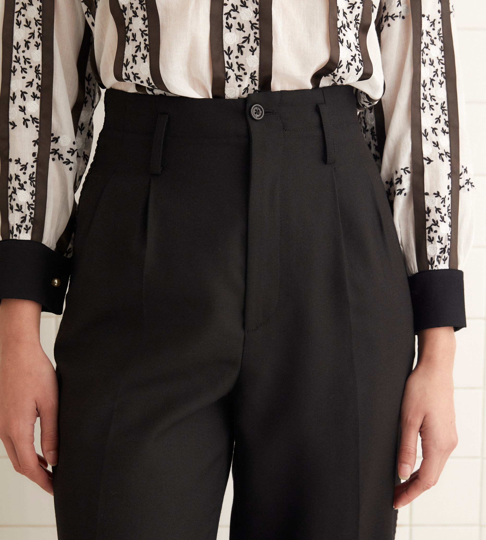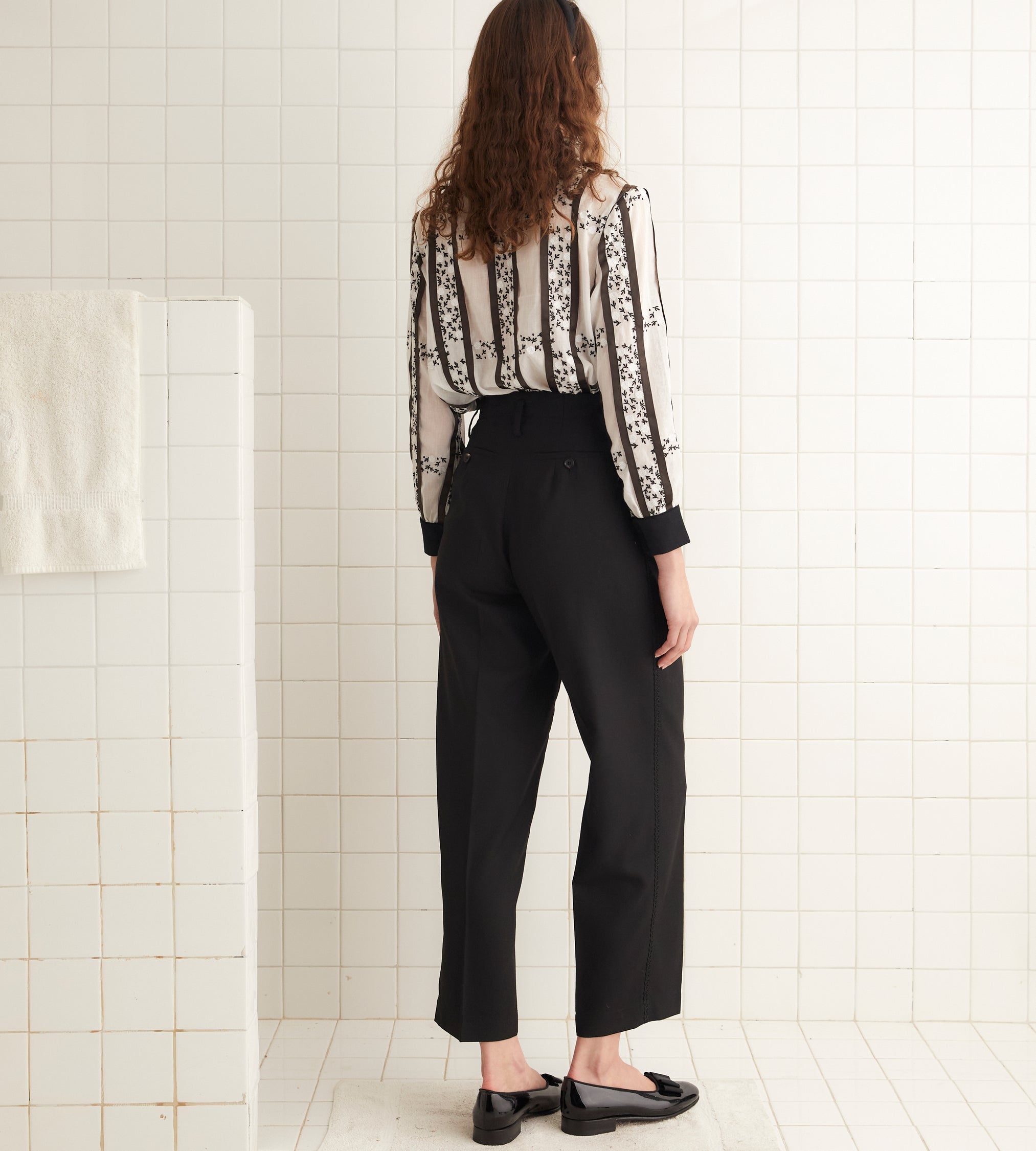 These trousers are inspired by a pair of pants from the 1950s. They have a mid-rise and a wide leg and are cut from fine wool crepe with tonal braid down the side seams.