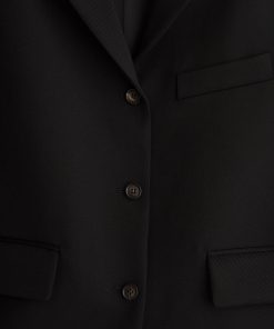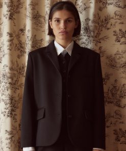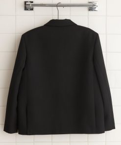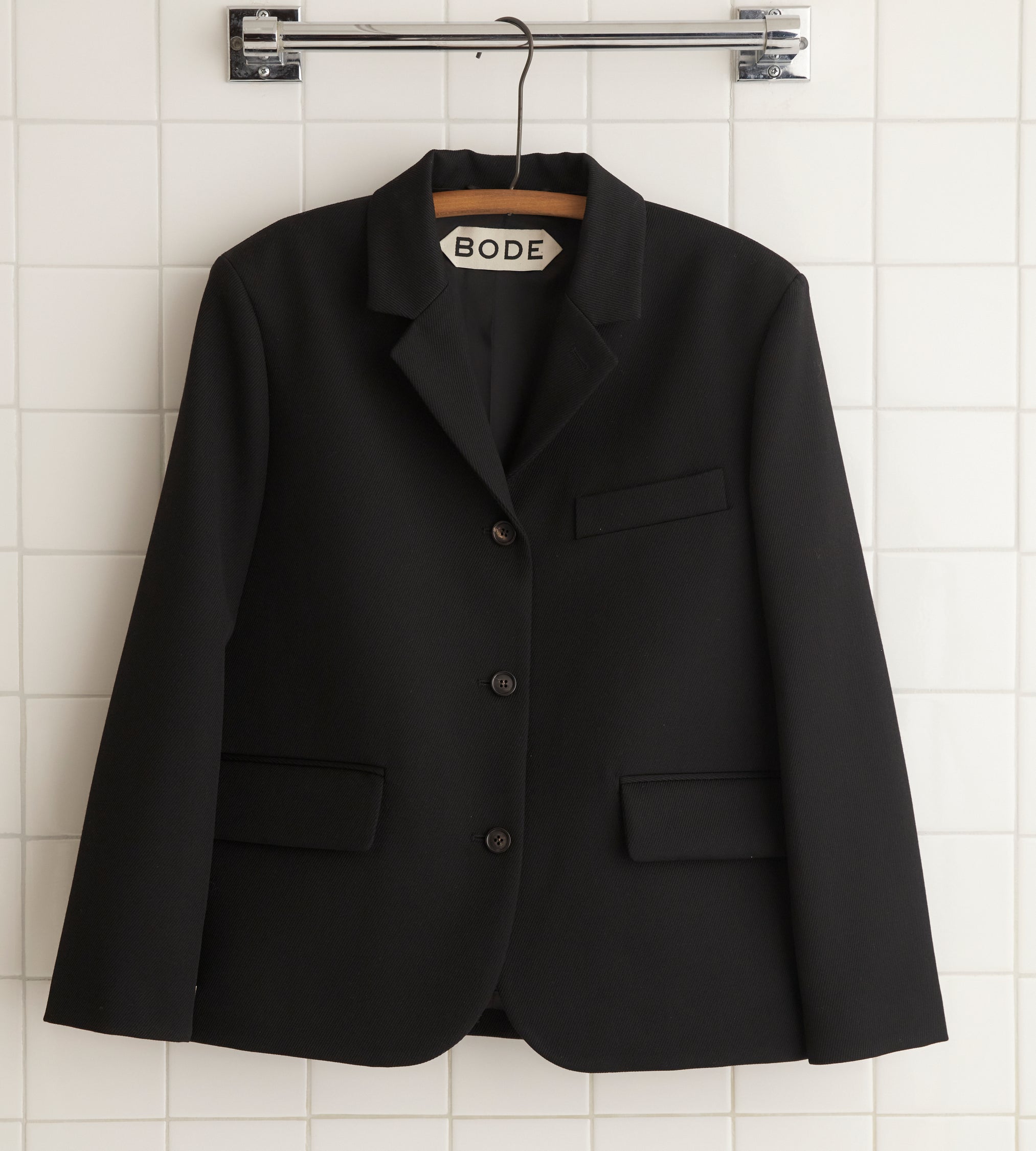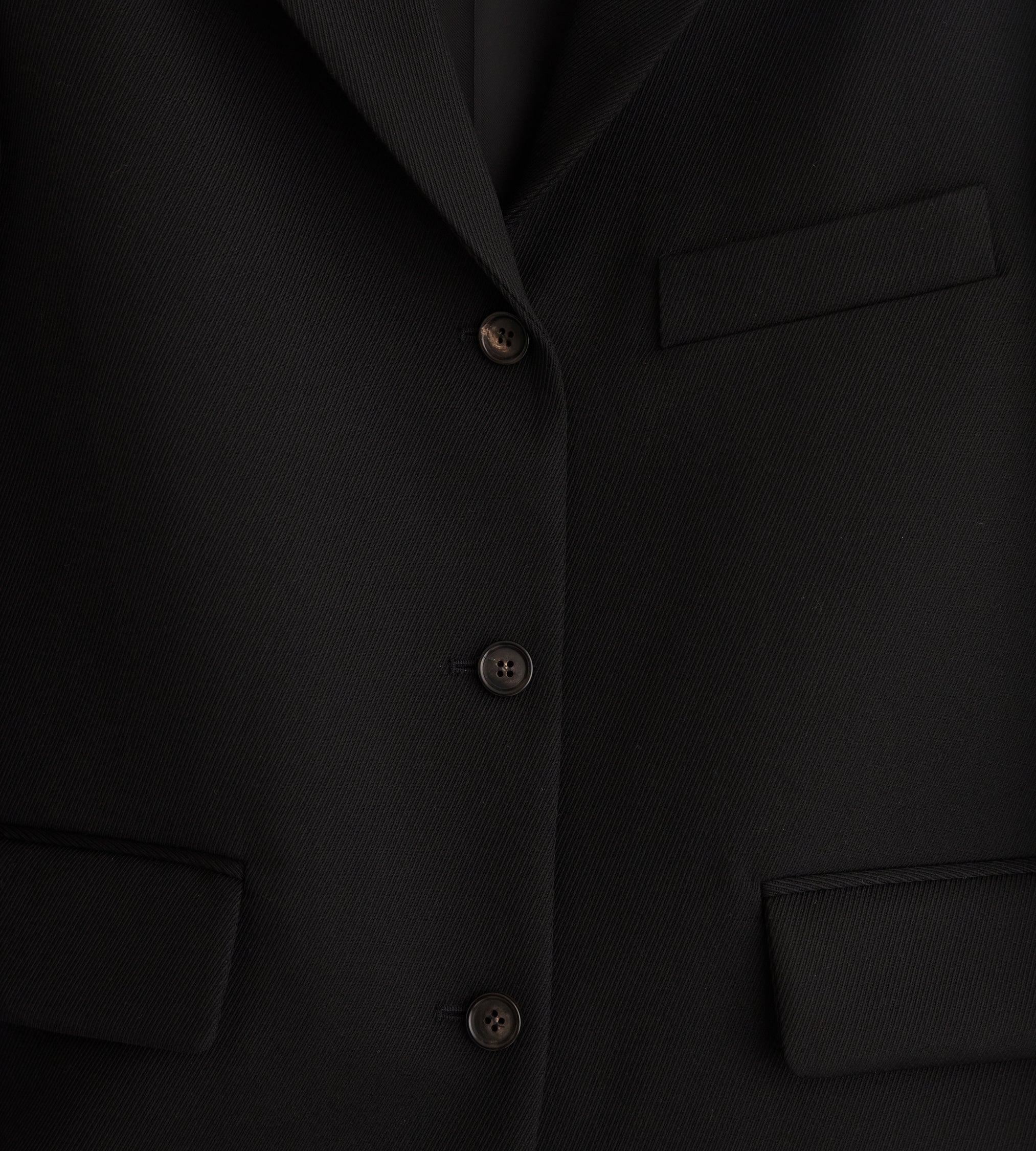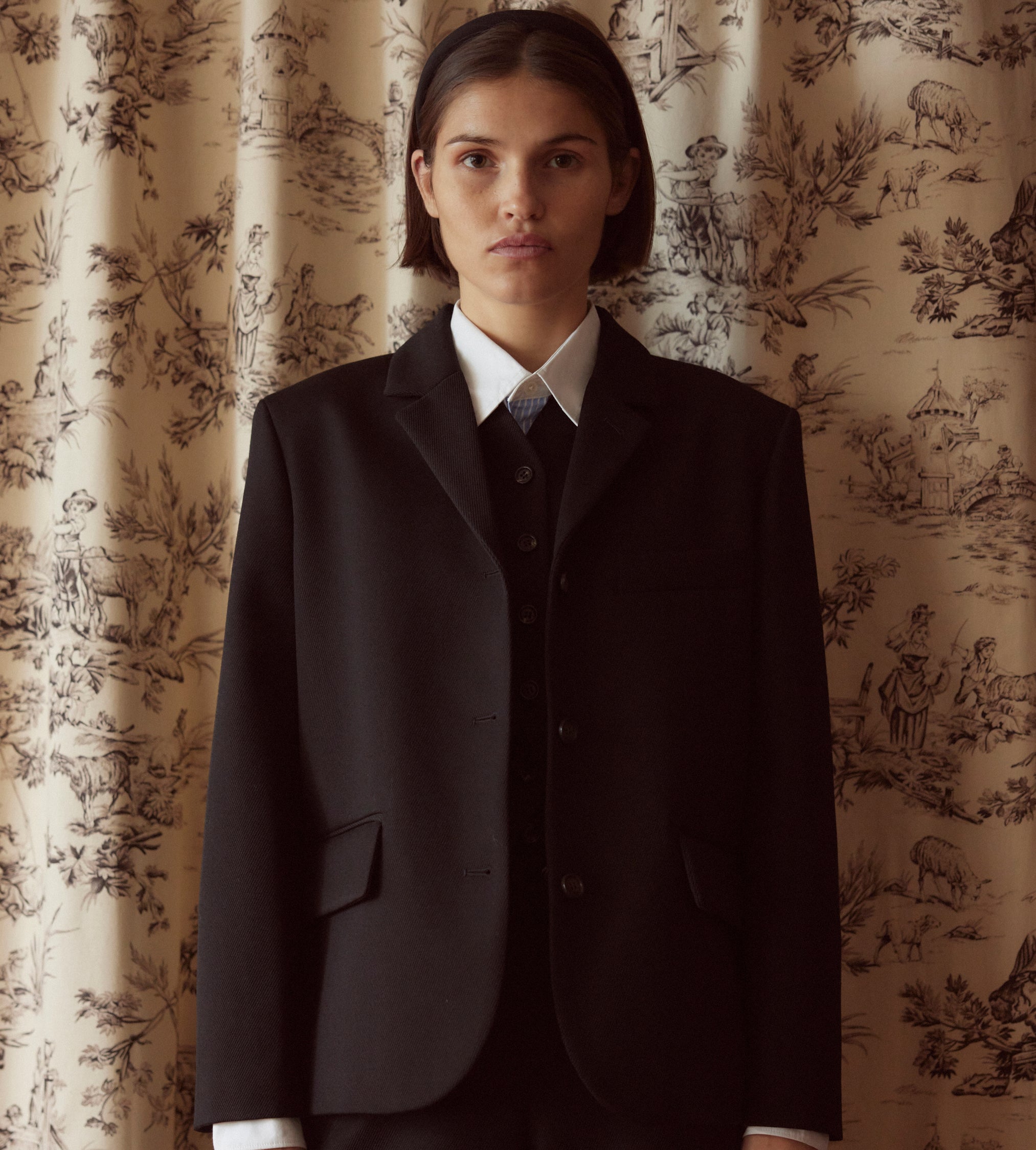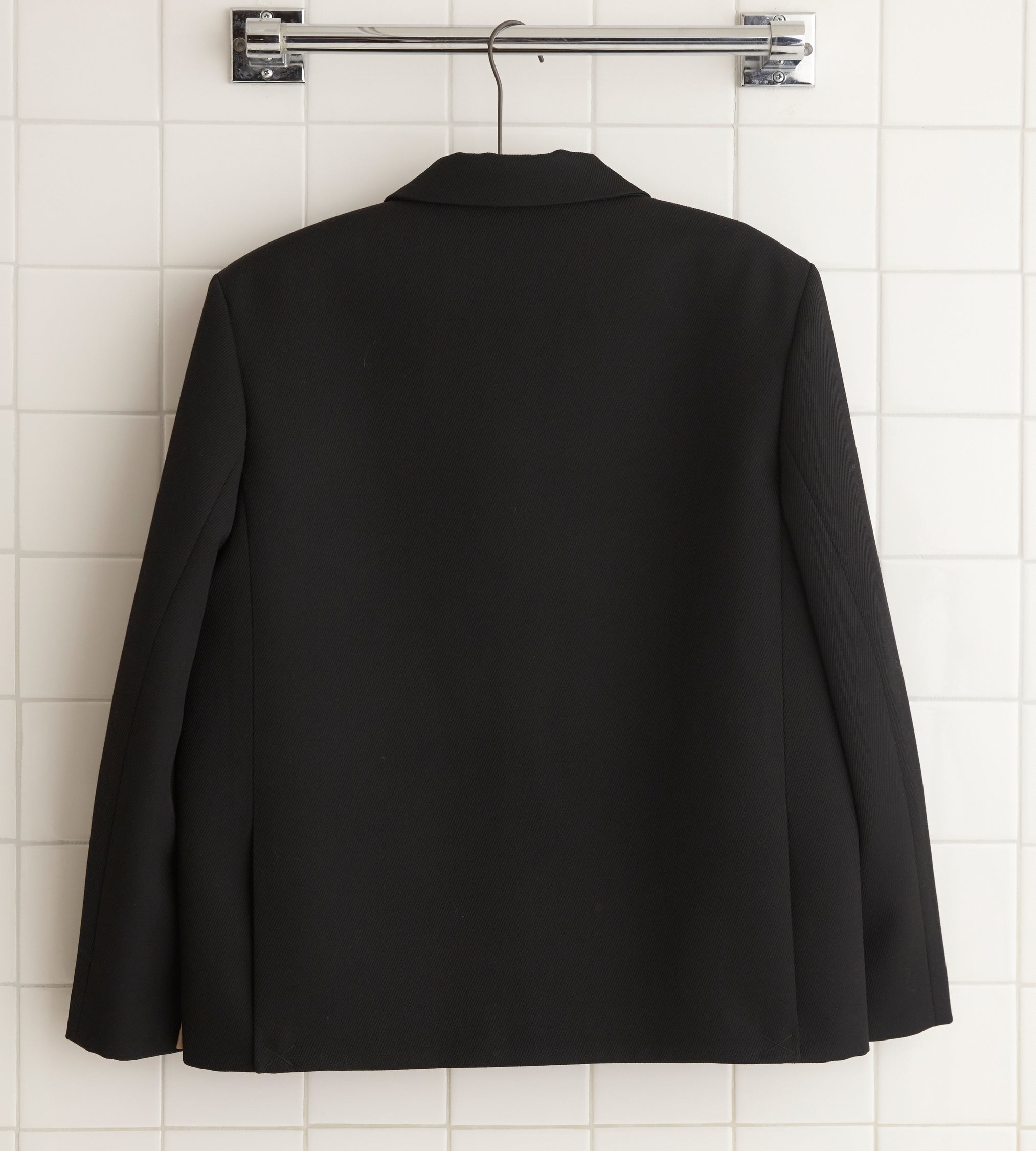 This style is inspired by a women’s suit jacket from Italy. We reproduced the silhouette in wool twill.