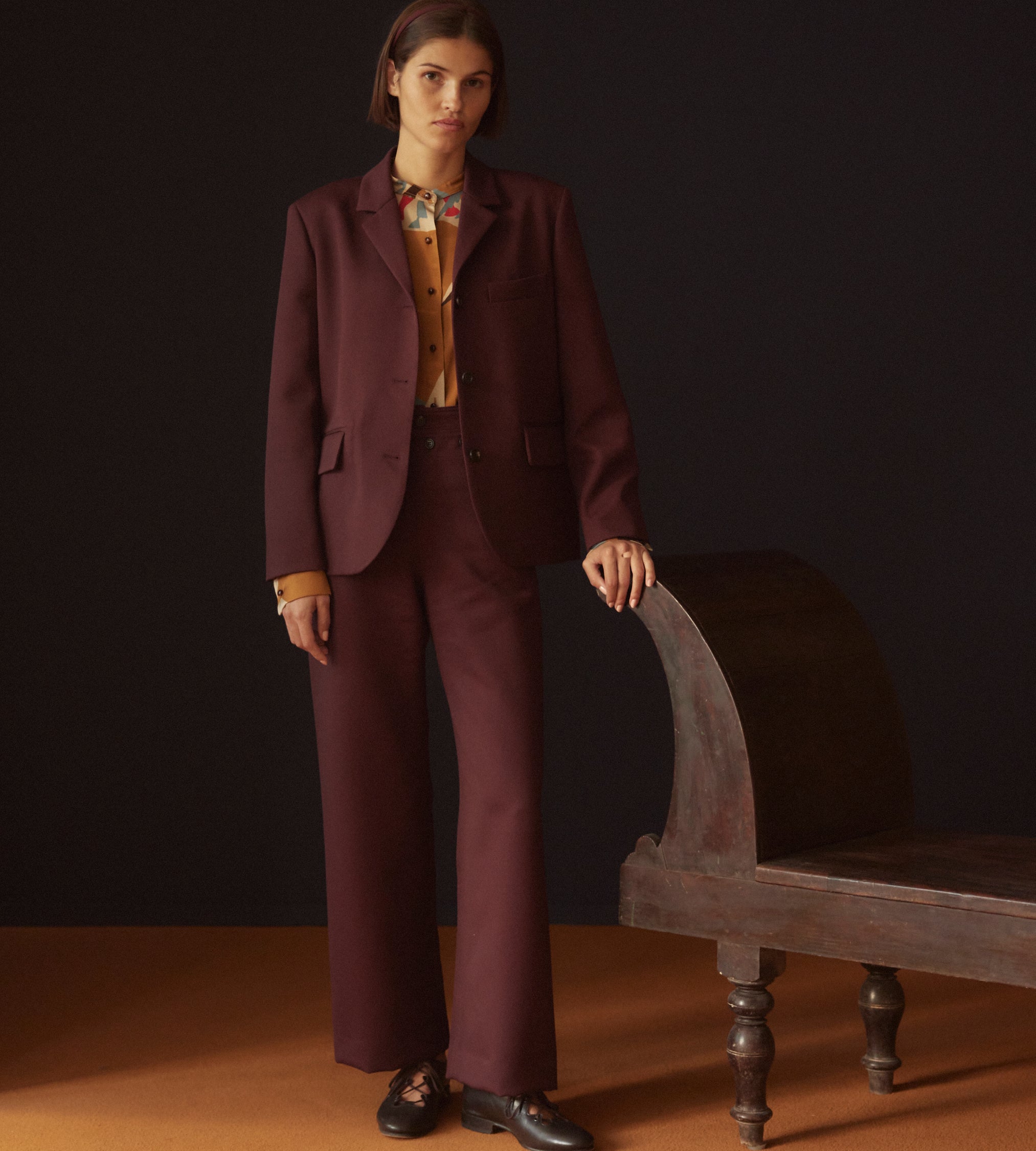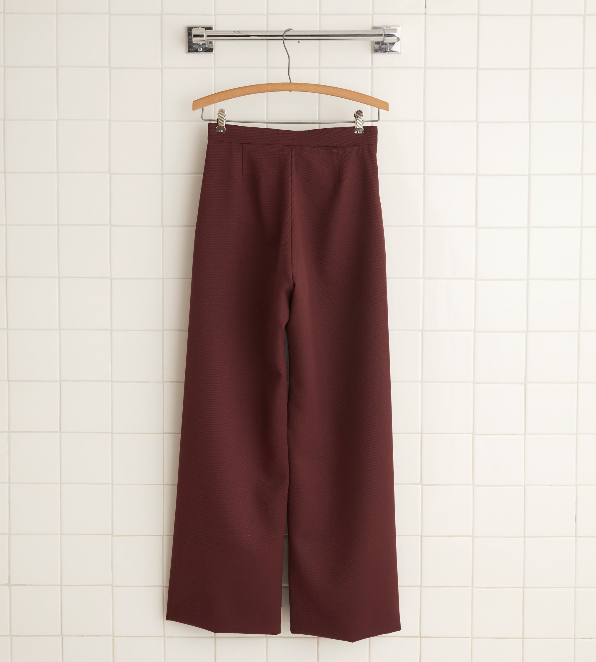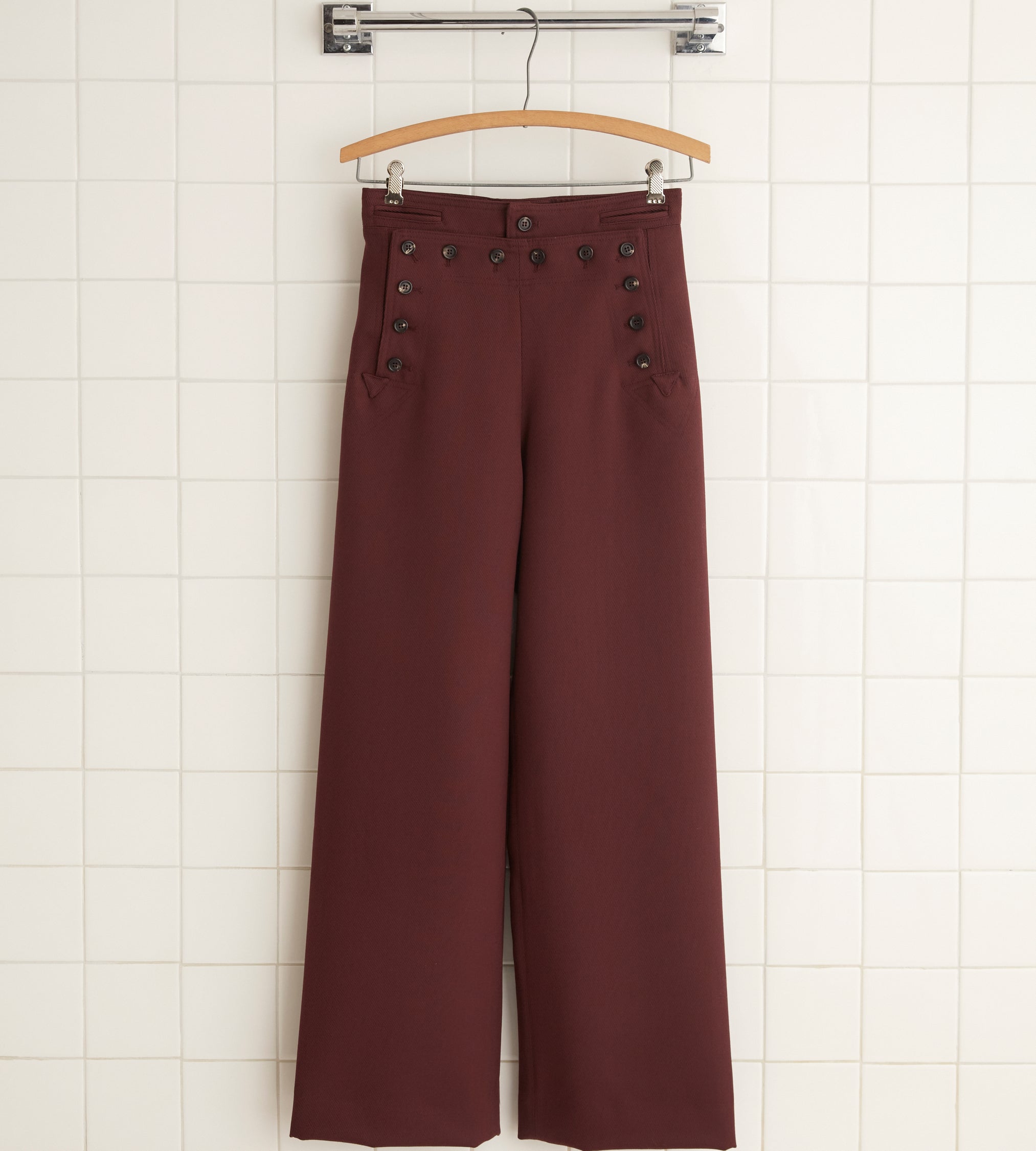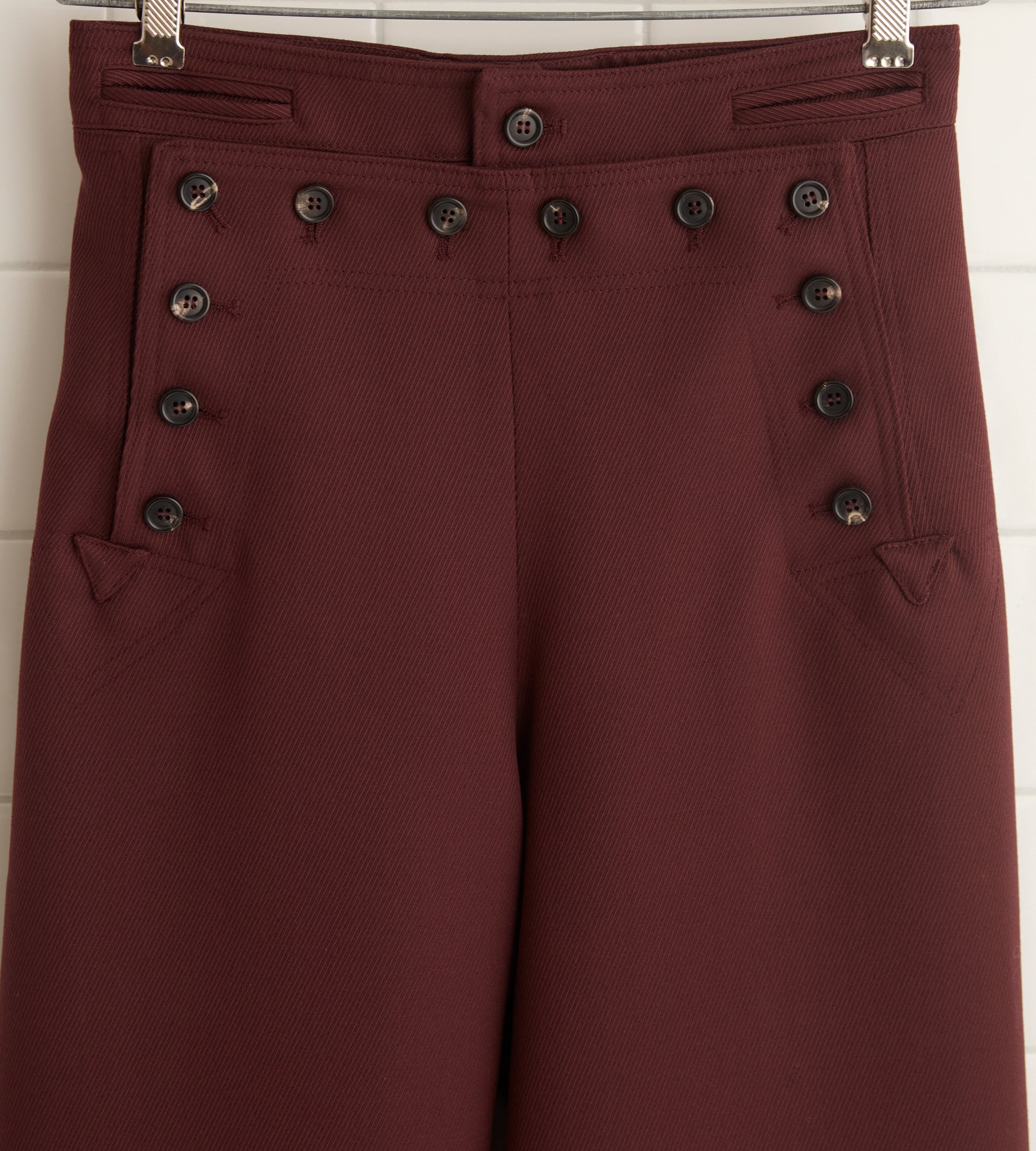 These trousers are inspired by a pair of 1930s riding breeches. We reproduced the fabric—a fine wool twill—for this style, which is cut in the silhouette of U.S. Navy pants from the 1940s.