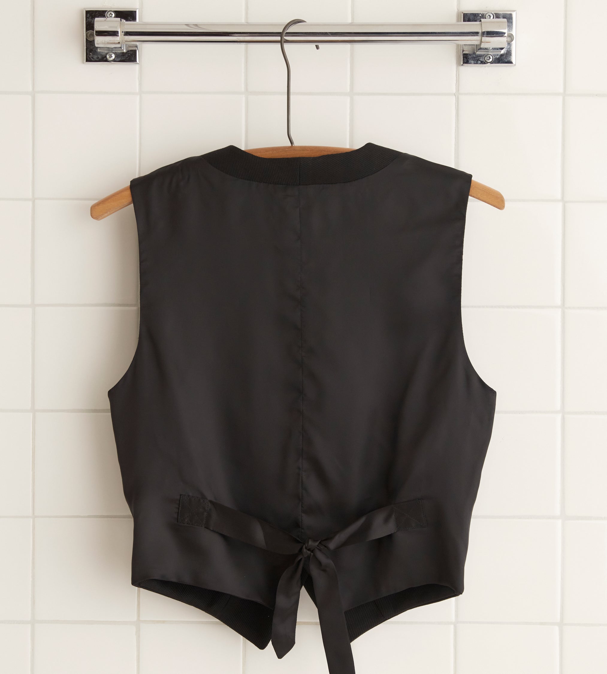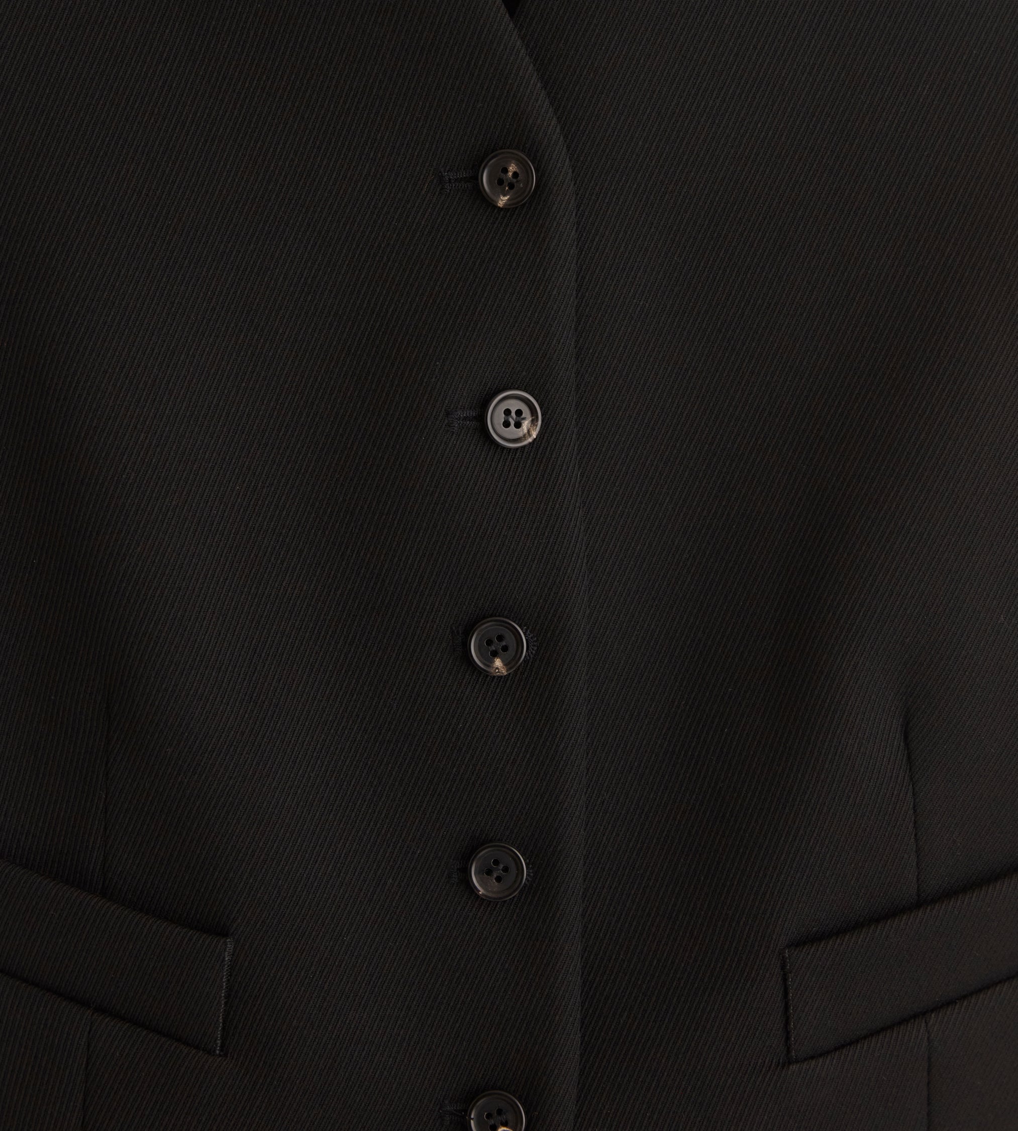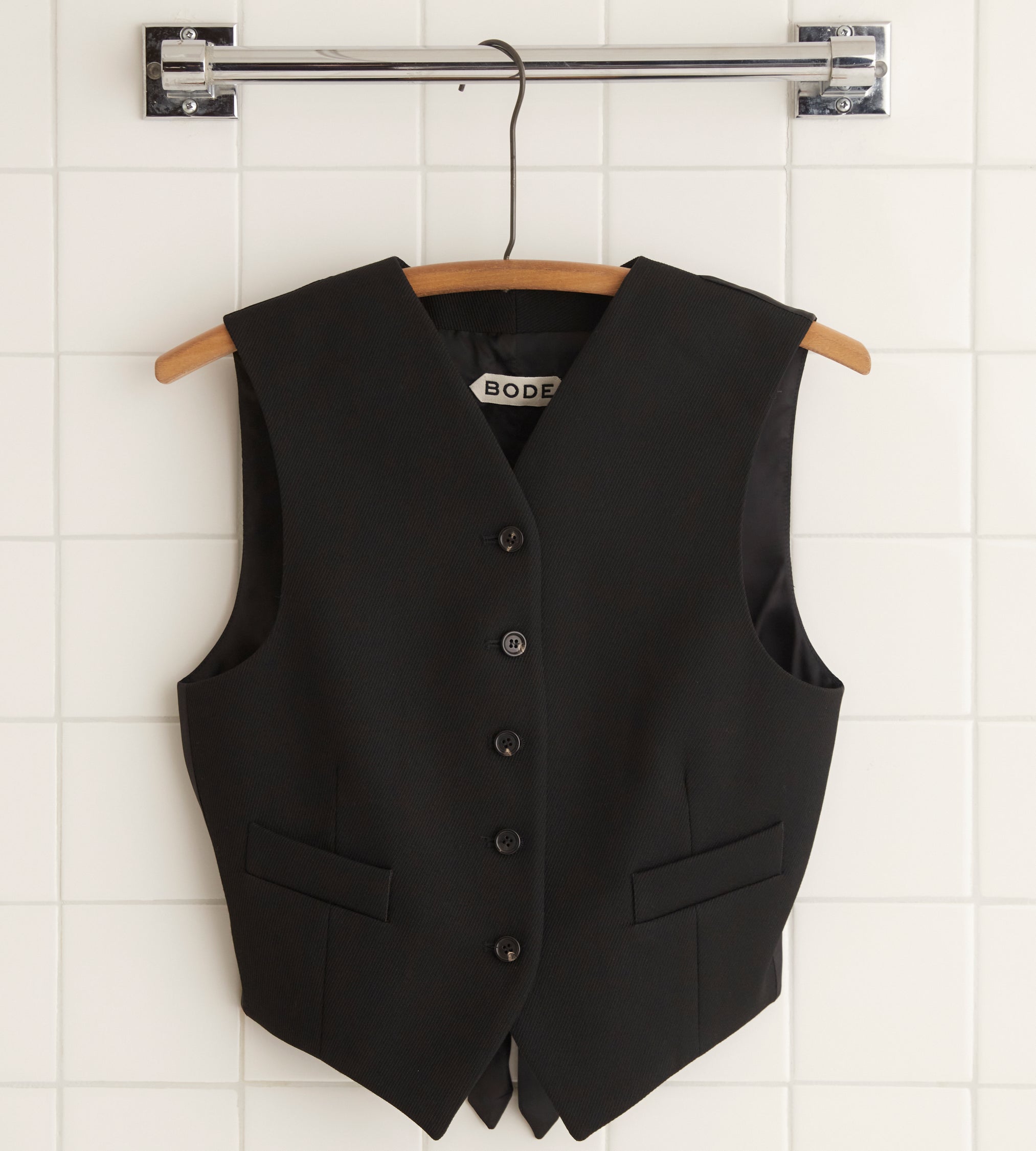 This waistcoat is inspired by a pair of 1930s riding breeches. We reproduced the fabric—a fine wool twill—for this style, which is cut in a silhouette of a waistcoat from the 1940s-1950s.