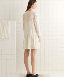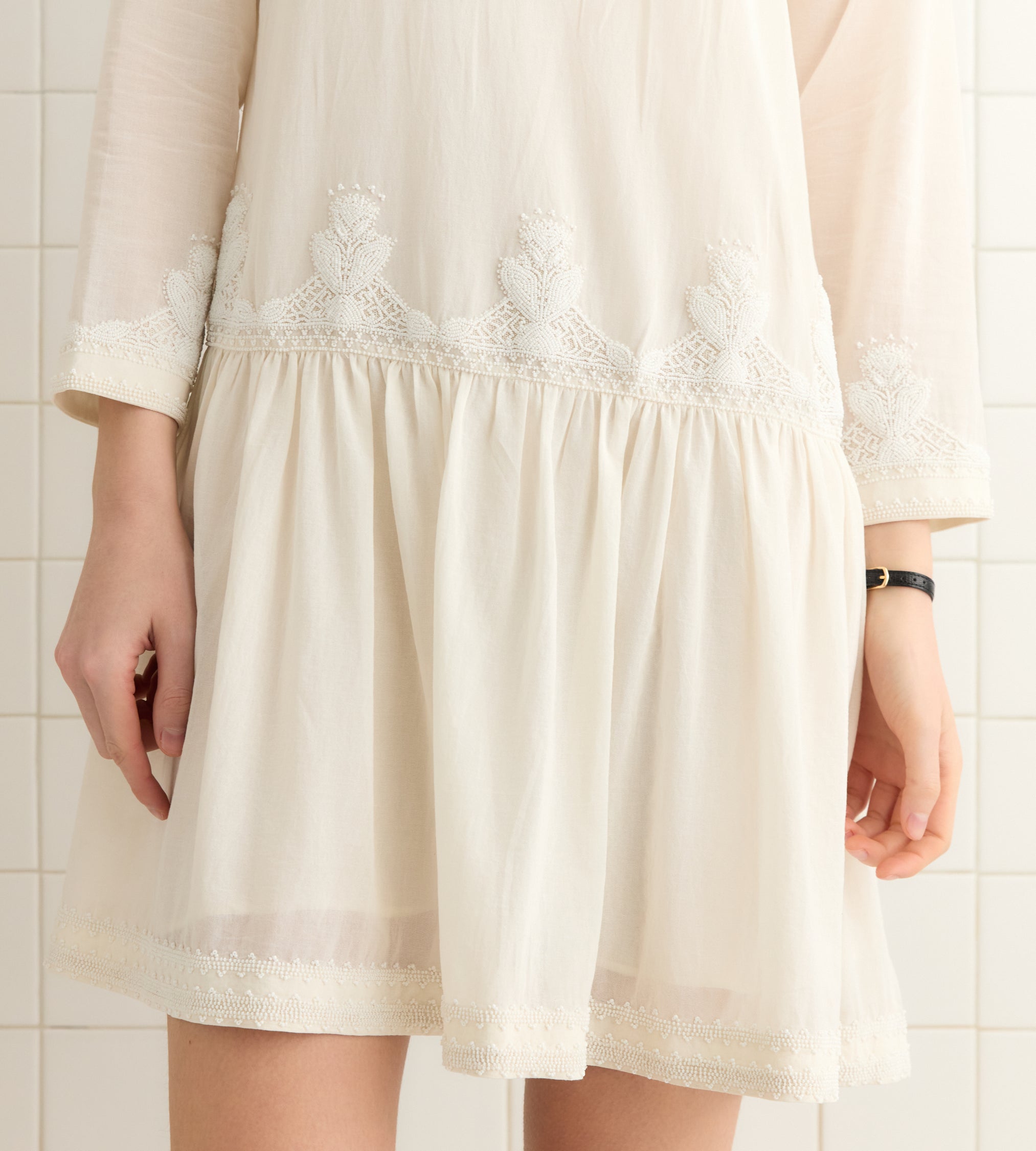 This dress is inspired by an antique beaded tunic, c.1917. We reproduced the geometric white beadwork around the waist, hem, and sleeves of this dress, cut from delicate, double-layered cotton voile.