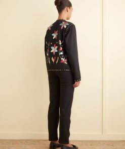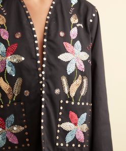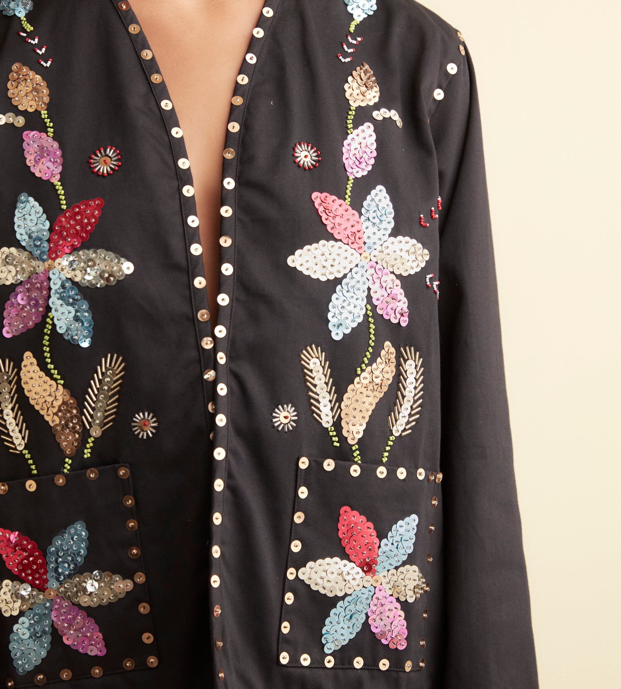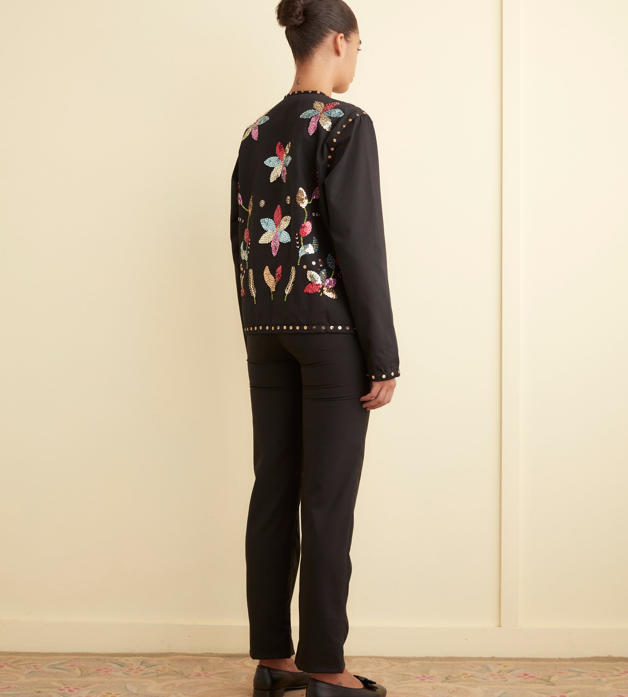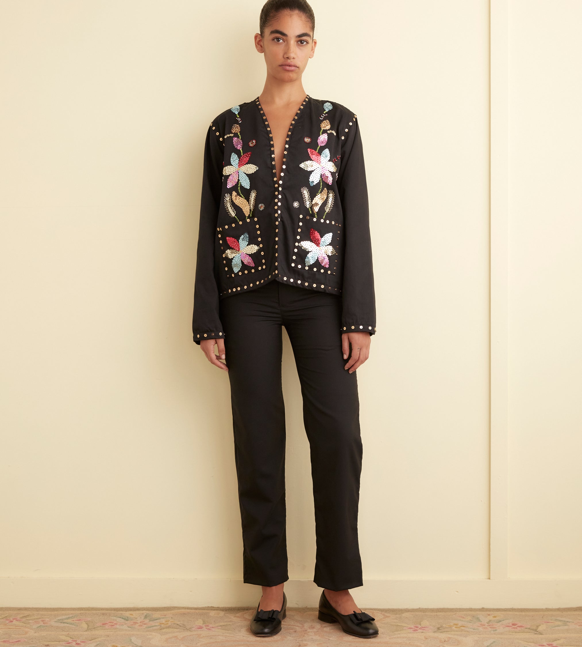 This jacket is inspired by a 1930s European folk vest. We have reproduced the pinwheel motif in sequins.