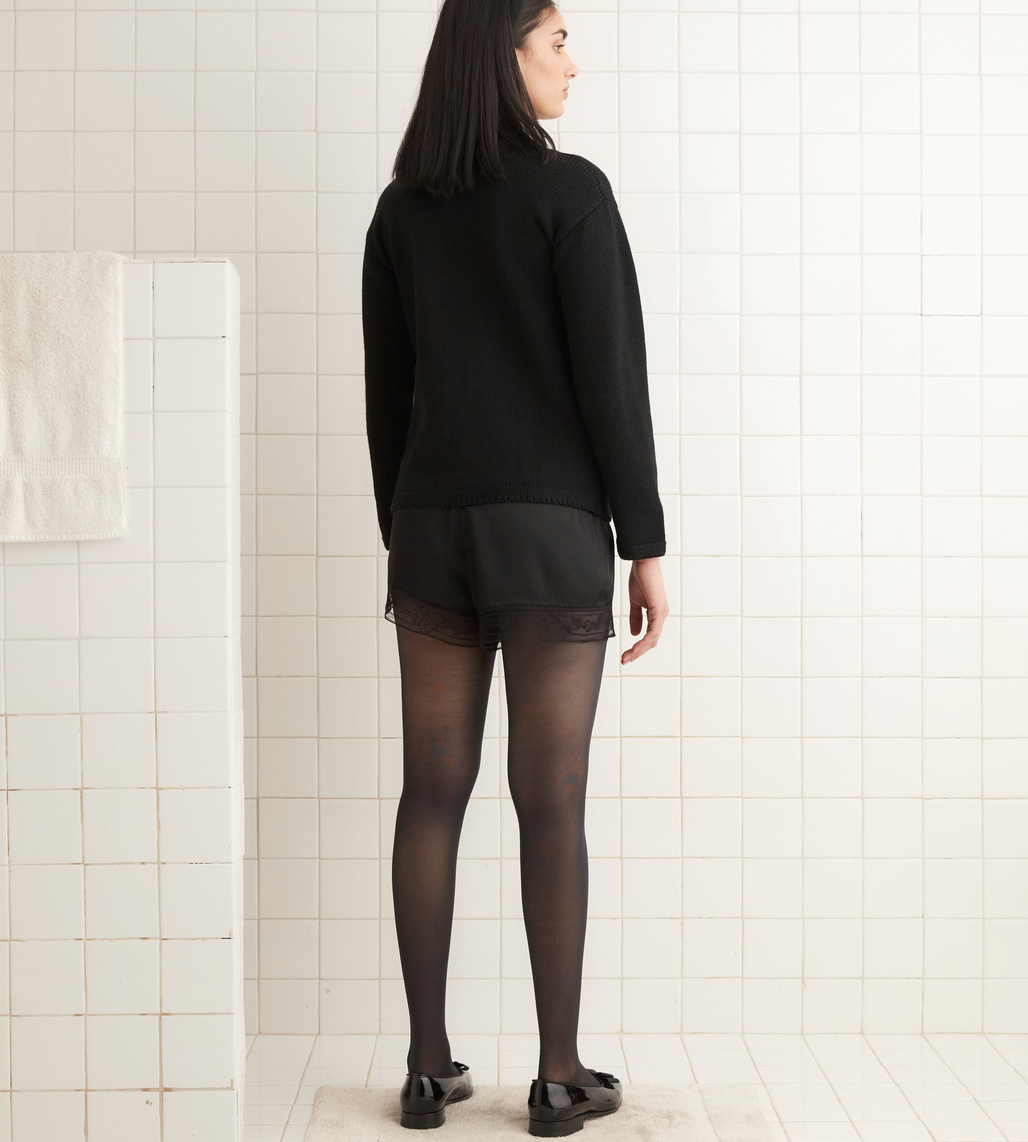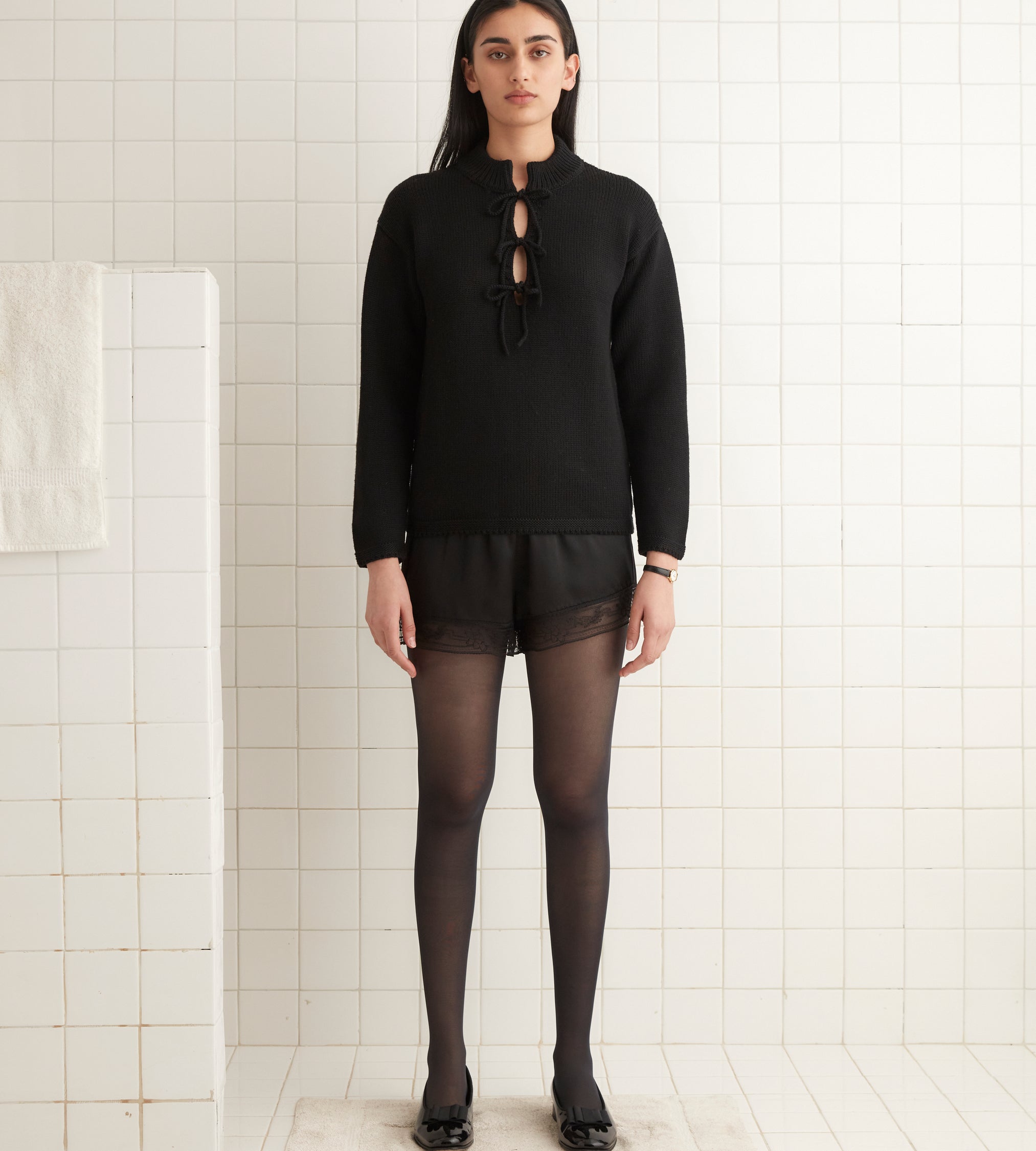 This sweater is inspired by a 1940s European fishermen’s pullover. Made from merino wool, it features three front ties at the collar.