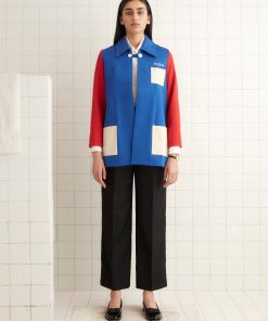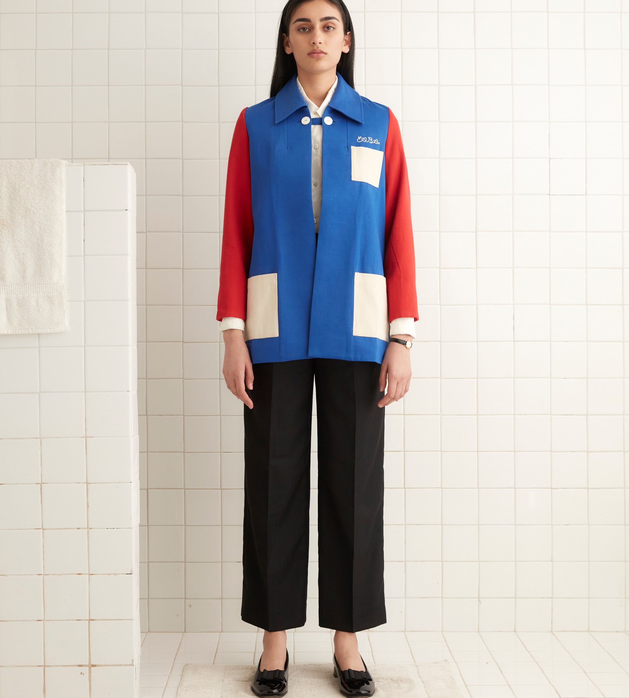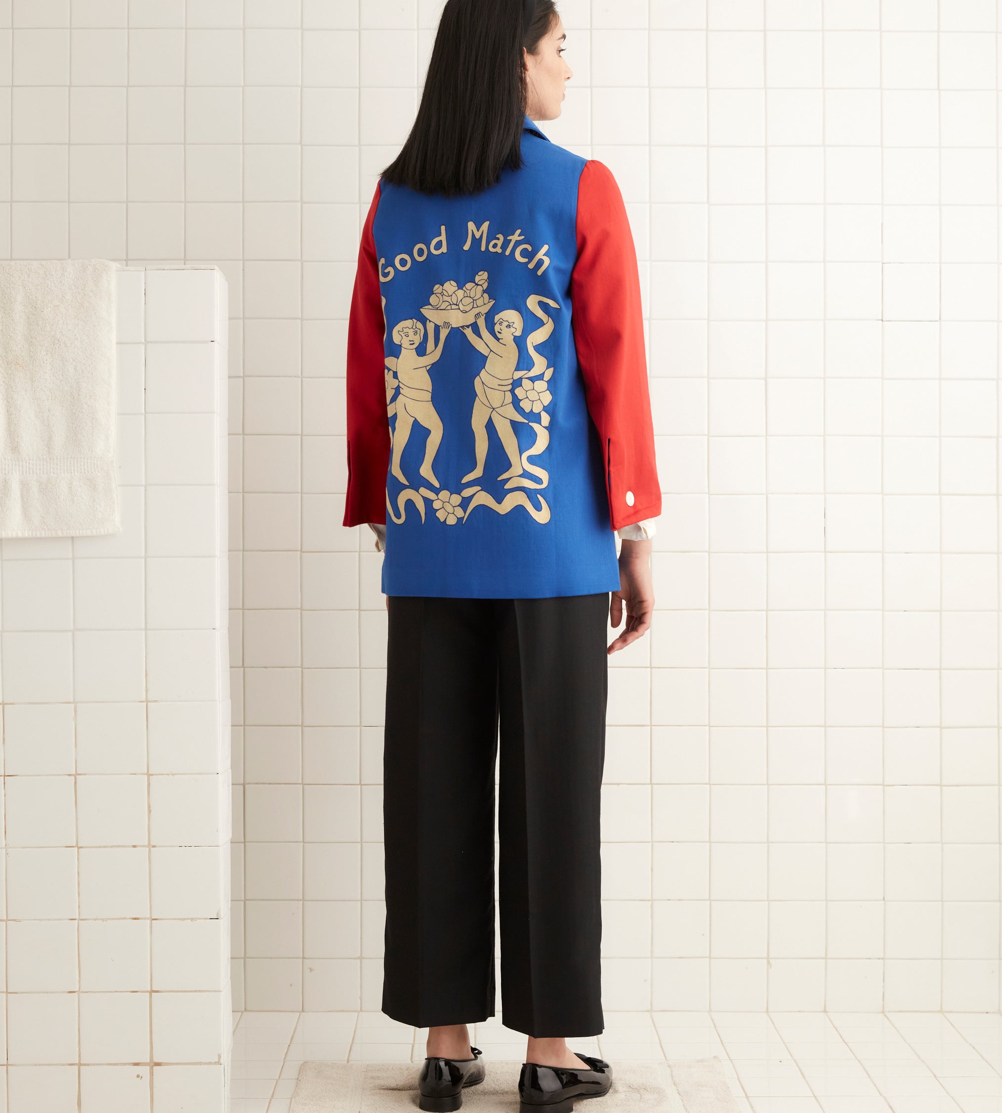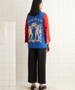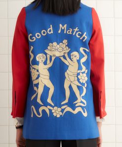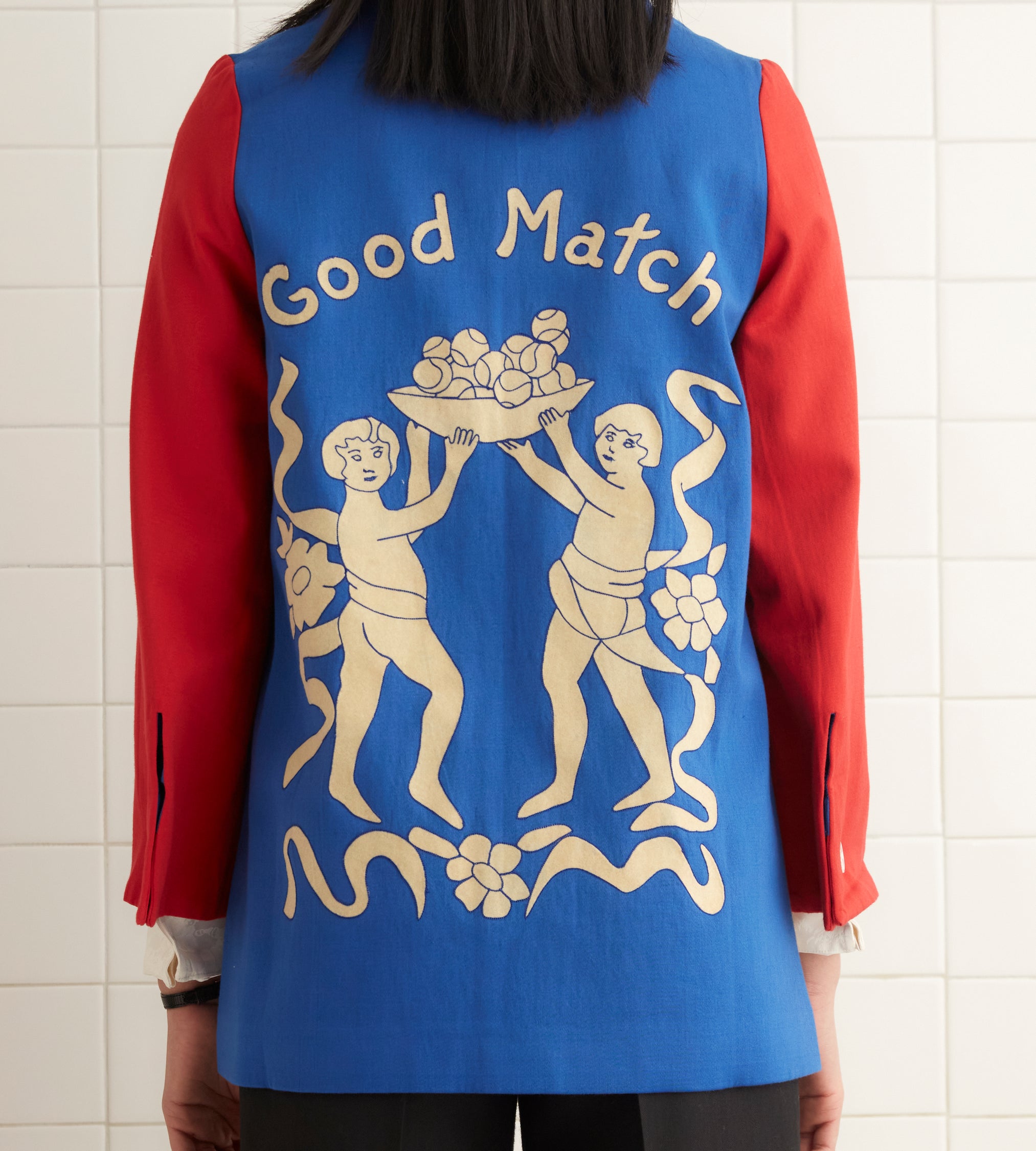 This jacket is inspired by a 1943 college club jacket. We reproduced the red, blue, and white colorblocking for this style. The flocked motif on the back was taken from a 1940s Italian cutwork curtain, and the jacket features a chain-stitched E.A.B.A. above the pocket.