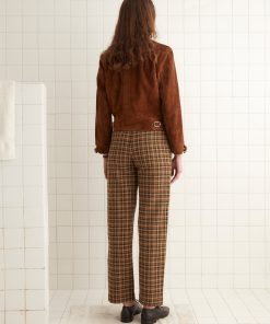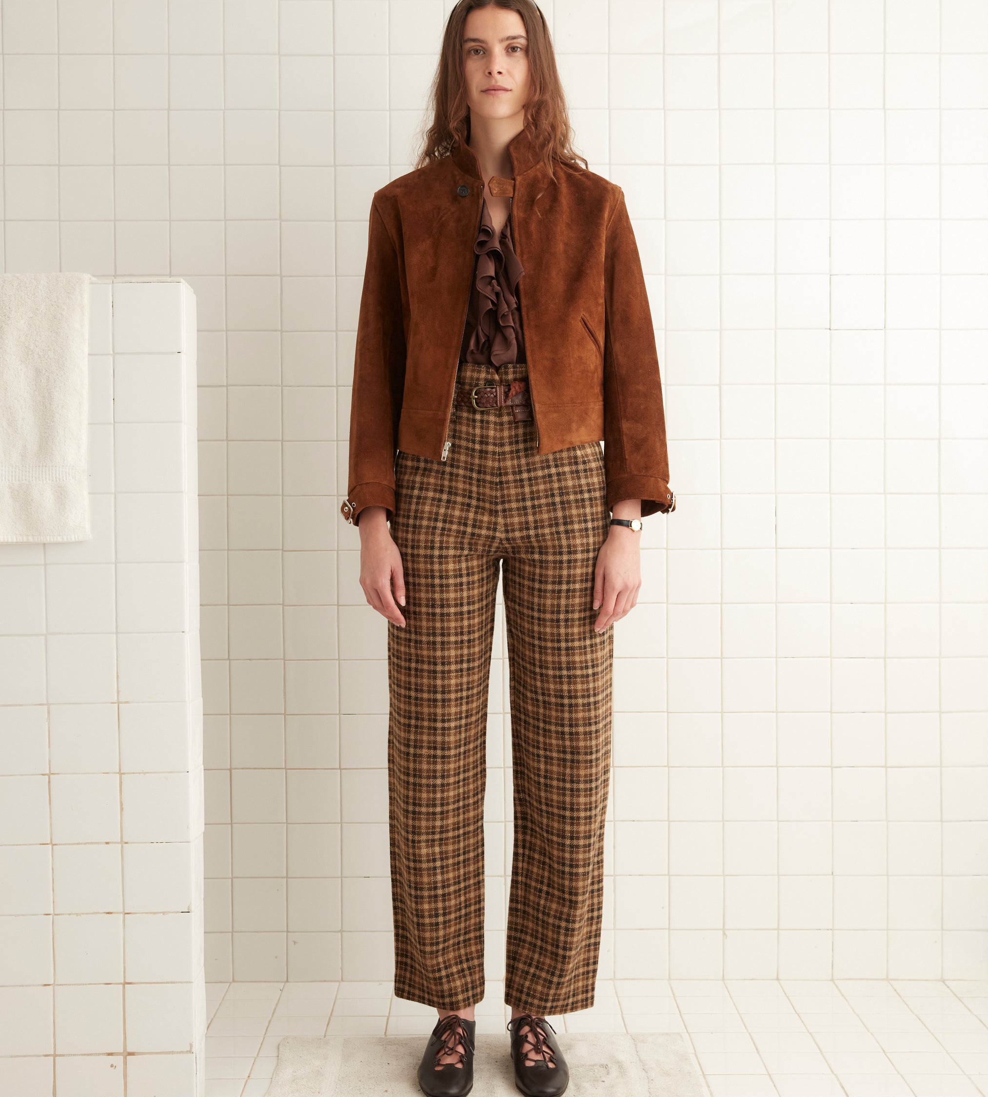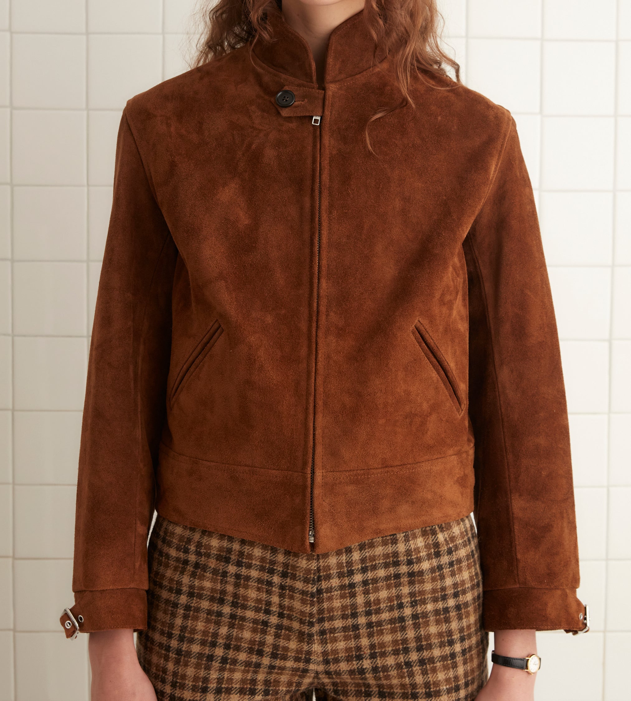 This jacket is inspired by a women’s leather jacket, c.1935, likely worn for skiing or hunting. We reproduced the silhouette of the original jacket in a dark brown suede.