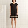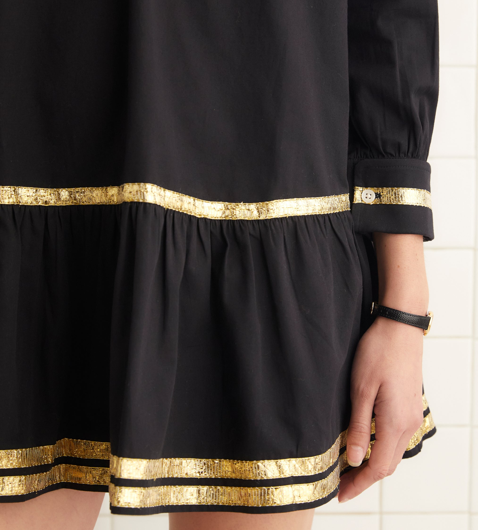 This dress is inspired by a costume from the 1930s. We reproduced the gold tape around the collar, neckline, and ruffled hem. The dress is made of black cotton twill and has a drop-waist silhouette.