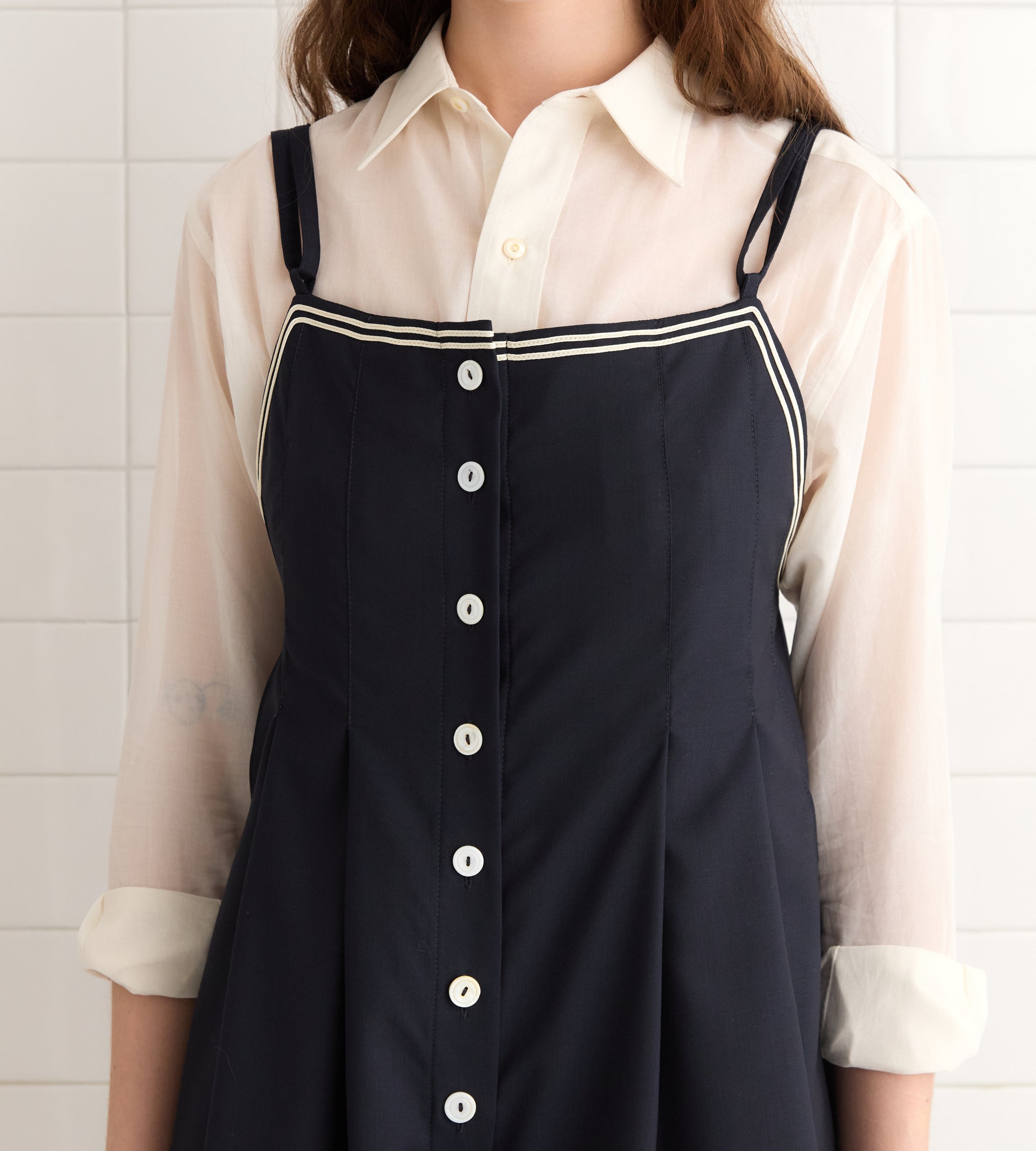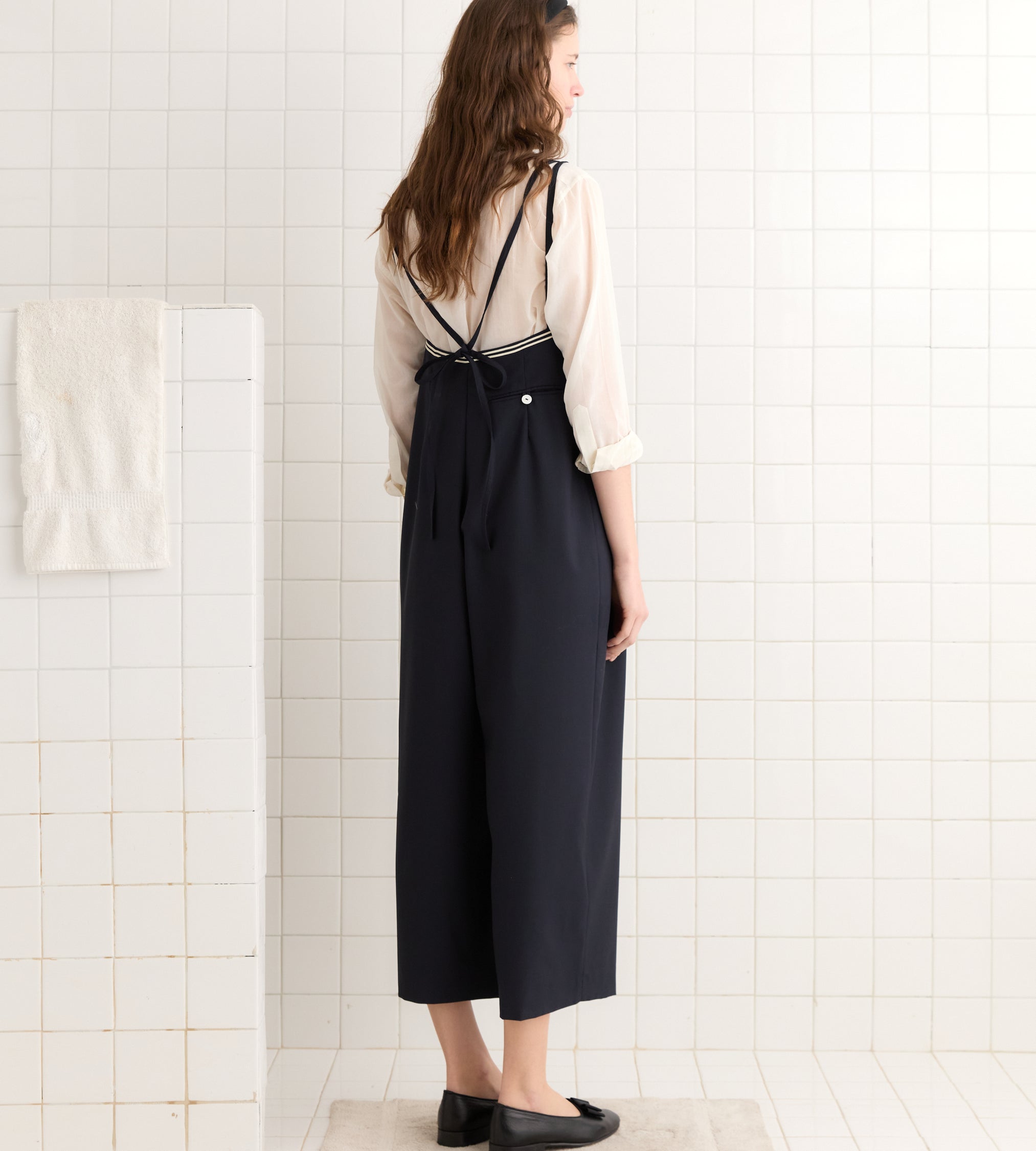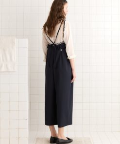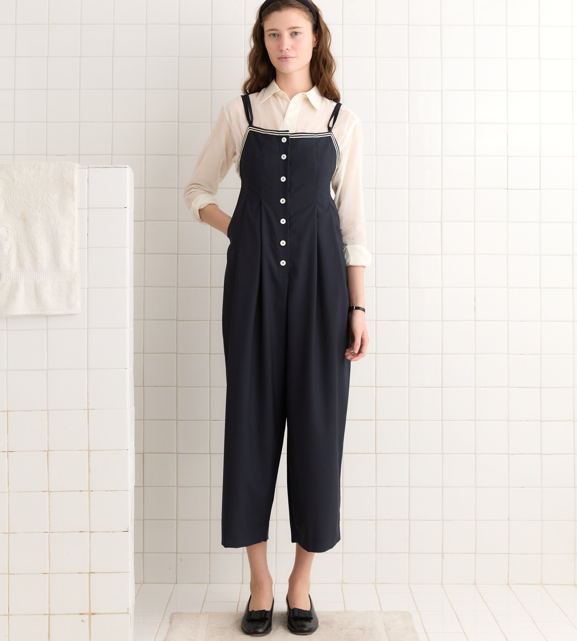 This piece is inspired by a jumpsuit from the late 20th century. We recreated the original silhouette, with its long pleats and row of front buttons, in fine wool twill with ivory trim. The buttons are antique pearl buttons sourced from a now-defunct button factory in Iowa.