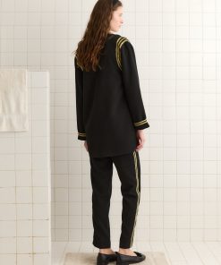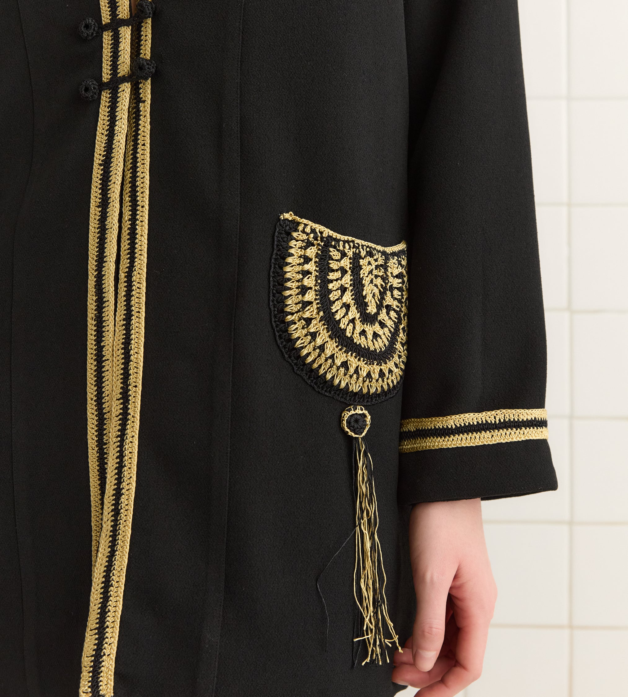 This jacket is inspired by a tunic from the 1920s. We reproduced the ecru-and-black crochet seams and pockets for this style.